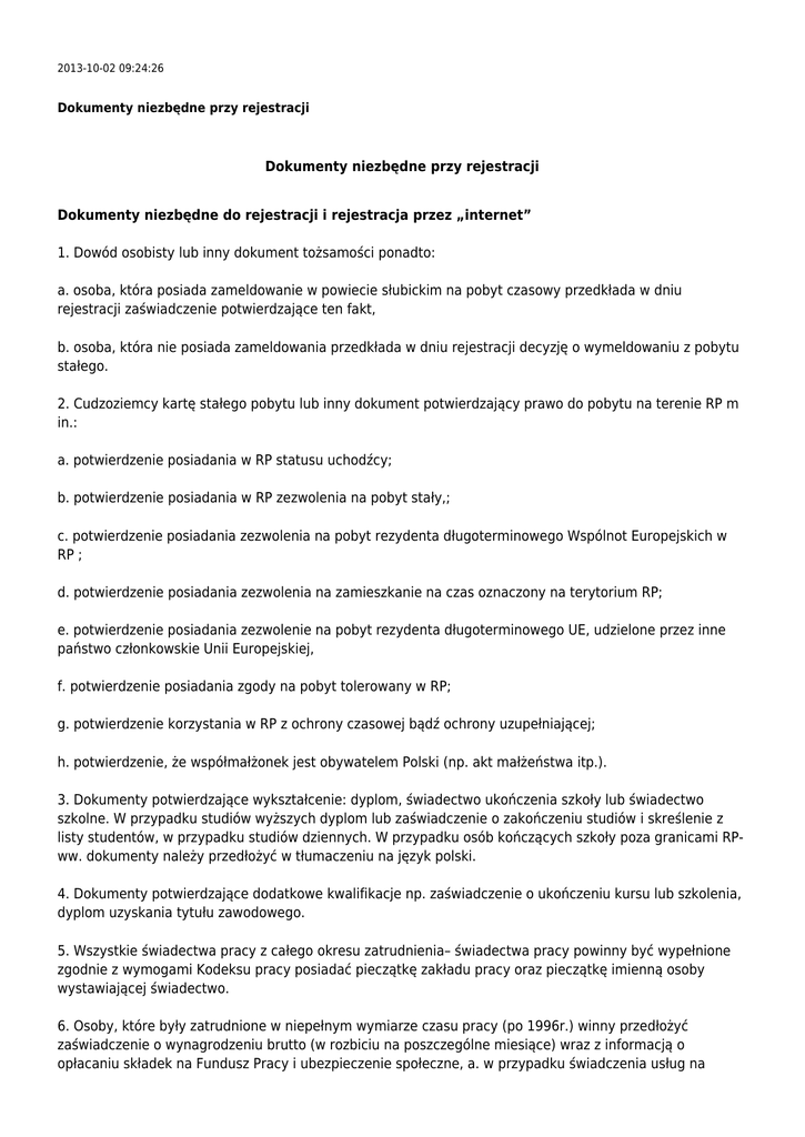 2013-10-02 09:24:26 Dokumenty niezbędne przy rejestracji Dokumenty niezbędne przy rejestracji Dokumenty niezbędne do rejestracji i rejestracja przez „internet” 1. Dowód osobisty lub inny dokument tożsamości ponadto: a. osoba, która posiada zameldowanie w powiecie słubickim na pobyt czasowy przedkłada w dniu rejestracji zaświadczenie potwierdzające ten fakt, b. osoba, która nie posiada zameldowania przedkłada w dniu rejestracji decyzję o wymeldowaniu z pobytu stałego. 2. Cudzoziemcy kartę stałego pobytu lub inny dokument potwierdzający prawo do pobytu na terenie RP m in.: a. potwierdzenie posiadania w RP statusu uchodźcy; b. potwierdzenie posiadania w RP zezwolenia na pobyt stały,; c. potwierdzenie posiadania zezwolenia na pobyt rezydenta długoterminowego Wspólnot Europejskich w RP ; d. potwierdzenie posiadania zezwolenia na zamieszkanie na czas oznaczony na terytorium RP; e. potwierdzenie posiadania zezwolenie na pobyt rezydenta długoterminowego UE, udzielone przez inne państwo członkowskie Unii Europejskiej, f. potwierdzenie posiadania zgody na pobyt tolerowany w RP; g. potwierdzenie korzystania w RP z ochrony czasowej bądź ochrony uzupełniającej; h. potwierdzenie, że współmałżonek jest obywatelem Polski (np. akt małżeństwa itp.). 3. Dokumenty potwierdzające wykształcenie: dyplom, świadectwo ukończenia szkoły lub świadectwo szkolne. W przypadku studiów wyższych dyplom lub zaświadczenie o zakończeniu studiów i skreślenie z listy studentów, w przypadku studiów dziennych. W przypadku osób kończących szkoły poza granicami RPww. dokumenty należy przedłożyć w tłumaczeniu na język polski. 4. Dokumenty potwierdzające dodatkowe kwalifikacje np. zaświadczenie o ukończeniu kursu lub szkolenia, dyplom uzyskania tytułu zawodowego. 5. Wszystkie świadectwa pracy z całego okresu zatrudnienia– świadectwa pracy powinny być wypełnione zgodnie z wymogami Kodeksu pracy posiadać pieczątkę zakładu pracy oraz pieczątkę imienną osoby wystawiającej świadectwo. 6. Osoby, które były zatrudnione w niepełnym wymiarze czasu pracy (po 1996r.) winny przedłożyć zaświadczenie o wynagrodzeniu brutto (w rozbiciu na poszczególne miesiące) wraz z informacją o opłacaniu składek na Fundusz Pracy i ubezpieczenie społeczne, a. w przypadku świadczenia usług na podstawie umowy zlecenia, umowy agencyjnej lub innej umowy o świadczenie usług należy przedłożyć zaświadczenie zawierające: okres wykonywania pracy, wysokość osiąganego wynagrodzenia za każdy miesiąc świadczenia usług wraz z potwierdzeniem odprowadzania składek na ubezpieczenie społeczne i Fundusz Pracy, b. w przypadku pracy w rolniczej spółdzielni produkcyjnej, spółdzielni kółek rolniczych lub będąc członkiem tej spółdzielni dodatkowo do świadectwa pracy należy przedłożyć zaświadczenie z ZUS o okresie podlegania ubezpieczeniu społecznemu i opłacaniu Funduszu Pracy z tytułu zatrudnienia i informacją z podstawą wymiaru składki. c. w przypadku wykonywania pracy nakładczej (chałupniczej) należy przedłożyć zaświadczenie potwierdzające wysokość uzyskanego dochodu w kwotach miesięcznych za cały okres wykonywania tej pracy. 7. W przypadku braku świadectwa pracy – należy przedłożyć zaświadczenie z ZUS o okresie podlegania ubezpieczeniom społecznym z tytułu zatrudnienia z informacją o wymiarze czasu pracy oraz informacją o urlopie bezpłatnym i wychowawczym, również honorowane są zaświadczenia wydane przez składnice akt lub archiwa. 8. W przypadku prowadzenia kiedykolwiek działalności gospodarczej należy przedłożyć: a. zaświadczenie z ZUS o okresie podlegania i opłacania składek oraz wysokość podstawy wymiaru składek na ubezpieczenie społeczne i Fundusz Pracy, b. wpis do KRS potwierdzający likwidację spółki w przypadku jej posiadania lub wyłączenie z niej jako wspólnika. 9. W przypadku osoby współpracującej przy prowadzeniu działalności gospodarczej: zaświadczenie z ZUS o okresie podlegania i opłacania składek na ubezpieczenie społeczne i Fundusz Pracy wraz z podstawą odprowadzanej składki. 10. Po odbyciu służby wojskowej: książeczka wojskowa lub świadectwo służby. 11. W przypadku rejestracji osób, które utraciły prawo do pobierania renty z tytułu niezdolności do pracy wymaganymi dokumentami są: a. decyzje lub zaświadczenie z ZUS lub KRUS potwierdzające okres pobierania renty (od- do), b. orzeczenie lekarza orzecznika potwierdzające zdolność do pracy, c. pozostałe dokumenty np. oryginały świadectw pracy, które są w posiadaniu organu rentowego dokumenty te mogą być przedłożone do rejestracji w postaci kopii potwierdzonych za zgodność oryginałem przez organ rentowy. 12. W przypadku pobierania renty rodzinnej – aktualna decyzja o wysokości pobieranej renty. 13. W przypadku pobierania świadczenia rehabilitacyjnego, zasiłku chorobowego, zasiłku macierzyńskiego zasiłku w wysokości zasiłku macierzyńskiego po ustaniu zatrudnienia, wykonywania innej pracy zarobkowej albo zaprzestania prowadzenia pozarolniczej działalności należy przedłożyć zaświadczenie z ZUS potwierdzające okres pobierania zasiłku lub świadczenia oraz podstawę jego wymiaru. 14. W stosunku do osób niepełnosprawnych – należy przedłożyć orzeczenie o stopniu niepełnosprawności. 15. W przypadku osób, które mają przeciwwskazania do wykonywania określonych prac – należy przedłożyć zaświadczenie lekarskie określające te przeciwwskazania. 16. Świadectwo zwolnienia z Zakładu Karnego lub Aresztu – dotyczy osób opuszczających areszt lub zakład karny – oraz zaświadczenie potwierdzające wysokość wynagrodzenia brutto w poszczególnych miesiącach za wykonywaną pracę wraz z informacją o opłacaniu składek na ubezpieczenia społeczne i Fundusz Pracy. 17. Osoby będące właścicielami lub posiadaczami samoistnymi lub zależnymi nieruchomości rolnej prze