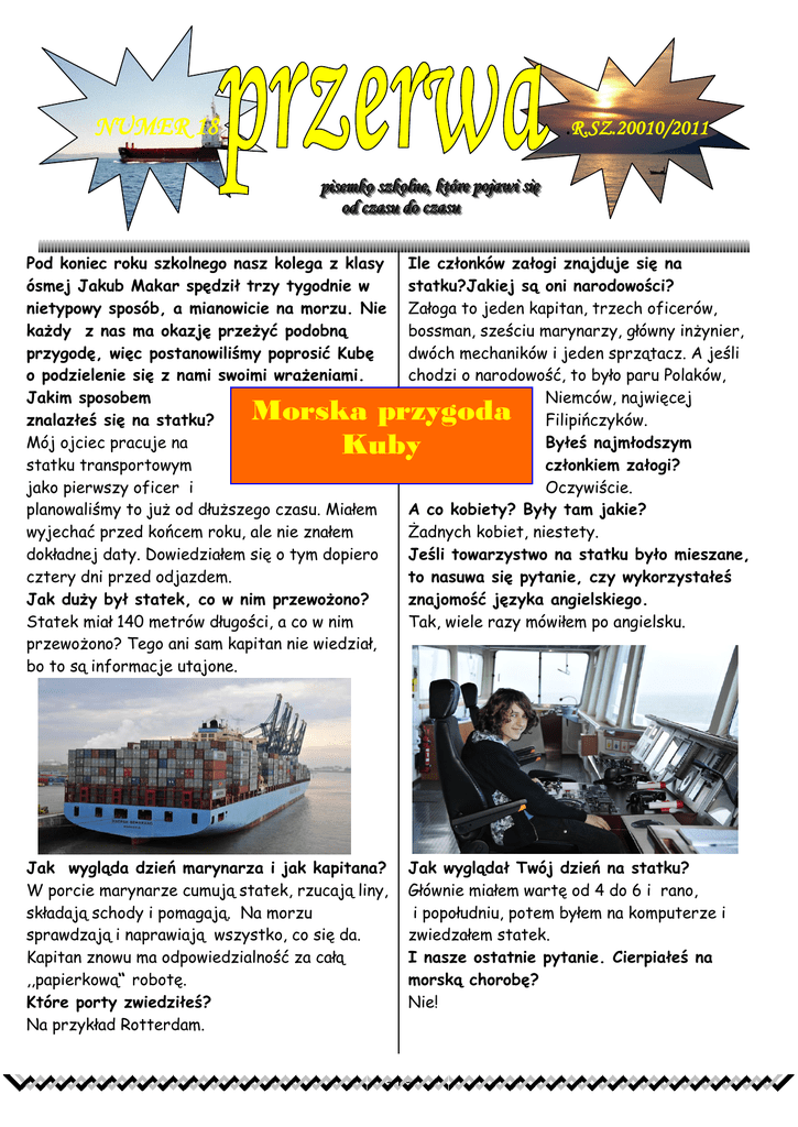 NUMER 18 .R.SZ.20010/2011 ppiisseemmkkoo sszzkkoollnnee,, kkttóórree ppoojjaaw wii ssiięę oodd cczzaassuu ddoo cczzaassuu Pod koniec roku szkolnego nasz kolega z klasy ósmej Jakub Makar spędził trzy tygodnie w nietypowy sposób, a mianowicie na morzu. Nie każdy z nas ma okazję przeżyć podobną przygodę, więc postanowiliśmy poprosić Kubę o podzielenie się z nami swoimi wrażeniami. Jakim sposobem znalazłeś się na statku? Mój ojciec pracuje na statku transportowym jako pierwszy oficer i planowaliśmy to już od dłuższego czasu. Miałem wyjechać przed końcem roku, ale nie znałem dokładnej daty. Dowiedziałem się o tym dopiero cztery dni przed odjazdem. Jak duży był statek, co w nim przewożono? Statek miał 140 metrów długości, a co w nim przewożono? Tego ani sam kapitan nie wiedział, bo to są informacje utajone. Ile członków załogi znajduje się na statku?Jakiej są oni narodowości? Załoga to jeden kapitan, trzech oficerów, bossman, sześciu marynarzy, główny inżynier, dwóch mechaników i jeden sprzątacz. A jeśli chodzi o narodowość, to było paru Polaków, Niemców, najwięcej Filipińczyków. Byłeś najmłodszym członkiem załogi? Oczywiście. A co kobiety? Były tam jakie? Żadnych kobiet, niestety. Jeśli towarzystwo na statku było mieszane, to nasuwa się pytanie, czy wykorzystałeś znajomość języka angielskiego. Tak, wiele razy mówiłem po angielsku. Jak wygląda dzień marynarza i jak kapitana? W porcie marynarze cumują statek, rzucają liny, składają schody i pomagają. Na morzu sprawdzają i naprawiają wszystko, co się da. Kapitan znowu ma odpowiedzialność za całą ,,papierkową“ robotę. Które porty zwiedziłeś? Na przykład Rotterdam. Jak wyglądał Twój dzień na statku? Głównie miałem wartę od 4 do 6 i rano, i popołudniu, potem byłem na komputerze i zwiedzałem statek. I nasze ostatnie pytanie. Cierpiałeś na morską chorobę? Nie! Morska przygoda Kuby -1- Od A do Z……… czyli spowiedź Pana Dyrektora Tadeusza Szkucika Three days in England A autobusem jeżdżę, kiedy - zawsze B boję się – raczej nie C cieszę się, gdy – się cieszą inni D danie, które lubię – parówka E energię czerpię z – wnuków F film – Troja G gram na – kiedyś mnie zmuszano,ale bez efektu H histerycznie krzyczę, gdy - nie krzyczę I irytuje mnie – głupota ludzka J jadłospis szkolny mi – „powiedzmy“ odpowiada K kary używam – nie mam po co L lubię – dobrych ludzi M mama powtarzała mi – „Staraj się w życiu.“ N nieciekawa lekcja, kiedy byłem w szkole – nie pamiętam O o czym marzę– o krzywych palmach na Hawajach i pięknej plaży P przyjaciel –żona i cała najbliższa rodzina R rower mam- oczywiście dobrze utrzymywany S sam w domu- nie lubię być T trocha humoru –nie zaszkodzi U ulubiony uczeń –nie preferuję nikogo specjalnie W w dzieciństwie chciałem być- artystą X „X” faktor mam do – pracy społecznej Y yeti istnieje? –może ? Z zwierzak, którego mam w domu – piesek Tolo …czyli spostrzeżenia i wspomnienia Szymona Wantuły z podróży do Anglii... W zeszłym roku szkolnym w maju czteroosobowa grupka naszych uczniów pojechała na wycieczkę do Anglii. Oto oni : Marysia, Sabina, Raphael i Szymon przy fontannie na Trafalgar Square. „Jak można zauważyć, pogoda była nietypowa dla Anglii, słońce i ani kropli deszczu. A u nas w tym czasie powodzie...” „Bardzo mi się podobała podróż promem przez kanał La Manche i rejs po Tamizie.“ Nasz dyrektor Tadeusz Szkucik obchodził podczas wakacji zacny jubileusz życiowy. Redakcja ,,Przerwy“ składa Panu Dyrektorowi życzenia: Takie to szczere, proste życzenia ofiarujemy Panu w dniu urodzenia: Wiele uśmiechów, a mało żałości, Długich lat życia w szczęśliwości, Dobrego zdrowia i pomyślności, Jak najmniej smutków i dużo radości. „Dwa dni zwiedzaliśmy Londyn, a jeden dzień spędziliśmy na południowym wybrzeżu Anglii. Przeszliśmy się po słynnych skałach kredowych Seven Sisters.“ „Było strasznie drogo , ale pieniędzy na prezenty dla rodziny i kolegów oraz na fish and chips nie zabrakło…“ Pomimo tego na pytanie, czy pojechałby znowu, odpowiedział: „Oczywiście.“ Redakcja w składzie: Jola, Janka, Aga,Jaliub, Michał, Tomasz -2- -3-