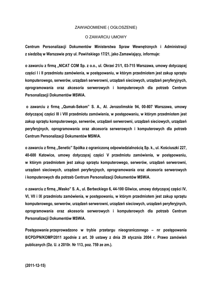 ZAWIADOMIENIE ( OGŁOSZENIE) O ZAWARCIU UMOWY Centrum Personalizacji Dokumentów Ministerstwa Spraw Wewnętrznych i Administracji z siedzibą w Warszawie przy ul. Pawińskiego 17/21, jako Zamawiający, informuje: o zawarciu z firmą „NICAT COM Sp. z o.o., ul. Okrzei 21/1, 03-715 Warszawa, umowy dotyczącej części I i II przedmiotu zamówienia, w postępowaniu, w którym przedmiotem jest zakup sprzętu komputerowego, serwerów, urządzeń serwerowni, urządzeń sieciowych, urządzeń peryferyjnych, oprogramowania oraz akcesoria serwerowych i komputerowych dla potrzeb Centrum Personalizacji Dokumentów MSWiA. o zawarciu z firmą „Qumak-Sekom” S. A., Al. Jerozolimskie 94, 00-807 Warszawa, umowy dotyczącej części III i VIII przedmiotu zamówienia, w postępowaniu, w którym przedmiotem jest zakup sprzętu komputerowego, serwerów, urządzeń serwerowni, urządzeń sieciowych, urządzeń peryferyjnych, oprogramowania oraz akcesoria serwerowych i komputerowych dla potrzeb Centrum Personalizacji Dokumentów MSWiA. o zawarciu z firmą „Senetic” Spółka z ograniczoną odpowiedzialnością Sp. k., ul. Kościuszki 227, 40-600 Katowice, umowy dotyczącej części V przedmiotu zamówienia, w postępowaniu, w którym przedmiotem jest zakup sprzętu komputerowego, serwerów, urządzeń serwerowni, urządzeń sieciowych, urządzeń peryferyjnych, oprogramowania oraz akcesoria serwerowych i komputerowych dla potrzeb Centrum Personalizacji Dokumentów MSWiA. o zawarciu z firmą „Wasko” S. A., ul. Berbeckiego 6, 44-100 Gliwice, umowy dotyczącej części IV, VI, VII i IX przedmiotu zamówienia, w postępowaniu, w którym przedmiotem jest zakup sprzętu komputerowego, serwerów, urządzeń serwerowni, urządzeń sieciowych, urządzeń peryferyjnych, oprogramowania oraz akcesoria serwerowych i komputerowych dla potrzeb Centrum Personalizacji Dokumentów MSWiA. Postępowanie przeprowadzono w trybie przetargu nieograniczonego – nr postępowania 8/CPD/PN/KOMP/2011 zgodnie z art. 39 ustawy z dnia 29 stycznia 2004 r. Prawo zamówień publicznych (Dz. U. z 2010r. Nr 113, poz. 759 ze zm.). (2011-12-15)