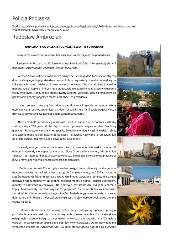 Policja Podlaska Źródło: http://www.podlaska.policja.gov.pl/pod/policja-podlas/ipa/ludzie/27698,Radoslaw-Ambroziak.html Wygenerowano: Czwartek, 2 marca 2017, 11:54 Radosław Ambroziak "NUMIZMATYKA, DALEKIE PODRÓŻE I ŚWIAT W FOTOGRAFII" Kiedyś ktoś powiedział, że ludzie bez pasji to ci co nie mają nic do powiedzenia. Radosław Ambroziak, lat 32, funkcjonariusz Policji od 12 lat. Interesuje się starymi monetami, egzotycznymi podróżami i fotografowaniem. W dzieciństwie odkrył w sobie duszę odkrywcy. Pewnego dnia buszując na strychu domu należącego do jego dziadków, wśród kufrów, wysłużonych mebli natknął się na kilka starych monet z dziwnymi oznaczeniami. Jak się później okazało były to carskie monety, ruble i kopiejki, których jego przodkowie nie zdążyli wydać przed wybuchem I wojny światowej. Mimo, że nie przedstawiały większej wartości, stały się impulsem do poznawania genezy rosyjskich monet oraz chęci ich posiadania. Nasz kolega zdaje się być także z zamiłowania lingwistą ze specjalnością etymologiczną (pochodzenie/historia słów) – podzielił się z nami swoją bogatą wiedzą dotyczącą słownictwa związanego z jego zainteresowaniami. Nazwa "Rubel" narodziła się w XIII wieku na Rusi Kijowskiej i oznaczała - sztabkę srebra, ważącą 200 gram. W niektórych źródłach pisanych nazywano rubla - "rublową grzywną". Przygotowywano je w ten sposób, że odlewano długi i wąski kawałek srebra, a następnie przecinakiem rąbano go na części - grzywny. Nazywano je rublowymi lub po prostu rublami (od rosyjskiego słowa rubit, czyli rąbać). Najazdy mongolsko-tatarskie uniemożliwiły wznowienie bicia ruskich monet. W obiegu znajdowały się wypuszczane przez Złotą Ordę srebrne monety "dirgma" lub "dienga" (po tatarsku dienga znaczy dzwoniący). Stopniowo słowo dienga przeszło w języku rosyjskim w diengi i nabrało znaczenia: pieniądze. Dopiero w połowie XIV w., gdy narodowi rosyjskiemu udało się osłabić jarzmo mongolsko-tatarskie na Rusi, znowu zaczęto bić własne monety. W 1534 r., w czasie rządów Heleny Glińskiej, matki cara Iwana Groźnego, stworzono jednolity dla całego państwa system monetarny. Na drobnej srebrnej monecie widniał jeździec z mieczem, monety te nazywano mieczowymi. Na cięższych, też srebrnych, wybijano jeźdźca z kopią. Takie monety zaczęto nazywać "kopiejkami". Z czasem Radosław Ambroziak zaczął także zbierać monety z innych krajów. Posiada oryginalne monety z Izraela, Egiptu, Jordanii, Rodezji, Indonezji oraz większości krajów europejskich przed zmianą waluty na Euro. Monety zbiera podczas podróży, które łączy z fotografią. Specjalizuje się w portretach, ale nie jest mu obce uchwycenie piękna krajobrazów. Największe osiągnięcie naszego kolegi to zwycięstwo w konkursie fotograficznym "Zdjęcie z wakacji", organizowanym przez Biuro Podróży www.wakacje.pl. Od tej pory zamienił wysłużoną Minoltę na cyfrowego NIKONA D50, stanowiącego nagrodę za pierwsze miejsce. W najbliższej przyszłości planuje zrobić fotograficzny wypad do Kornwalii (Wielka Brytania), do Szwecji i Norwegii, gdzie zamierza przekroczyć koło podbiegunowe. Dużo jeździ rowerem po okolicy i namiętnie fotografuje piękne miejsca w województwie podlaskim. Jego pasję popiera żona i dwie córki. Radosław Ambroziak jest serdecznym kolegą i oddanym członkiem IPA Regionu Białystok. W ostatnich wyborach - w czerwcu 2006 r. został wybrany na sekretarza IPA Regionu Białystok. Marzy, aby zamieszkać kiedyś w egzotycznym kraju. Leszek Skrodzki IPA Region Białystok Podlaska Grupa Wojewódzka IPA Ocena: 0/5 (0) Tweetnij