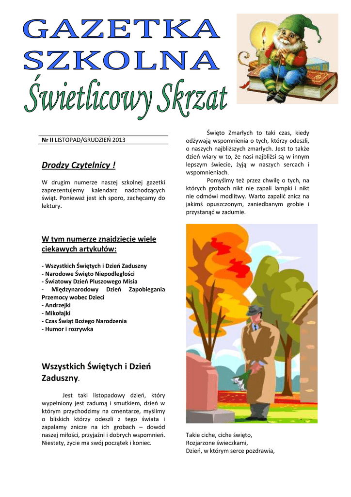 Nr II LISTOPAD/GRUDZIEŃ 2013 Drodzy Czytelnicy ! W drugim numerze naszej szkolnej gazetki zaprezentujemy kalendarz nadchodzących świąt. Ponieważ jest ich sporo, zachęcamy do lektury. Święto Zmarłych to taki czas, kiedy odżywają wspomnienia o tych, którzy odeszli, o naszych najbliższych zmarłych. Jest to także dzień wiary w to, że nasi najbliżsi są w innym lepszym świecie, żyją w naszych sercach i wspomnieniach. Pomyślmy też przez chwilę o tych, na których grobach nikt nie zapali lampki i nikt nie odmówi modlitwy. Warto zapalić znicz na jakimś opuszczonym, zaniedbanym grobie i przystanąć w zadumie. W tym numerze znajdziecie wiele ciekawych artykułów: - Wszystkich Świętych i Dzień Zaduszny - Narodowe Święto Niepodległości - Światowy Dzień Pluszowego Misia - Międzynarodowy Dzień Zapobiegania Przemocy wobec Dzieci - Andrzejki - Mikołajki - Czas Świąt Bożego Narodzenia - Humor i rozrywka Wszystkich Świętych i Dzień Zaduszny. Jest taki listopadowy dzień, który wypełniony jest zadumą i smutkiem, dzień w którym przychodzimy na cmentarze, myślimy o bliskich którzy odeszli z tego świata i zapalamy znicze na ich grobach – dowód naszej miłości, przyjaźni i dobrych wspomnień. Niestety, życie ma swój początek i koniec. Takie ciche, ciche święto, Rozjarzone świeczkami, Dzień, w którym serce pozdrawia, Pamięta Tych, co rozstali się z nami. Narodowe Święto Niepodległości. Święto rozsnute mgliście Nad jesiennym, zadumanym światem, Gdy żywi zmarłym dobrą myśl wyślą, Zmiotą z grobu zeschłe liście, Położą kwiatek. Hanna Łochocka "Dzień zaduszny" Po 123 latach niewoli Polska odzyskała upragnioną niepodległość. W listopadzie dzieci z zerówek wzięły udział w prezentacji przygotowanej przez nauczyciela. Prezentacja dotyczyła sposobu obchodów tego święta oraz uwrażliwienia dzieci na właściwe zachowanie się na cmentarzu. Dzień 11 listopada celebrowany był jako święto upamiętniające odzyskanie niepodległości od roku 1920. W II Rzeczypospolitej w dniu tym zawsze odbywały się defilady wojskowe, msze święte w intencji ojczyzny, uroczystości na szczeblu państwowym. 11 listopada w Belwederze wręczano ordery Virtuti Militari. W tym dniu oddajemy hołd marszałkowi Józefowi Piłsudskiemu, poległym żołnierzom i wszystkim którzy przyczynili się do tego aby Polska była wolna. Dzień ten jest dniem wolnym od pracy. Główne obchody, z udziałem najwyższych władz państwowych, odbywają się w Warszawie na placu marszałka Józefa Piłsudskiego przed Grobem Nieznanego Żołnierza. Dzieci z klas zerówkowych uczciły Narodowe Święto Niepodległości zapoznając się z historią tego święta, wykonując różne prace plastyczne stosowne do tej okazji m.in.: flagi narodowe , kotyliony, biało-czerwone orły. Poznały historię powstania naszego państwa oraz znaczenie naszych symboli narodowych. Rzecznik Praw Dziecka Marek Michalak zainaugurował kampanię "Nie ma dzieci, są ludzie", która - nawiązując do słów Janusza Korczaka - ma przypomnieć dorosłym, że dzieci są ludźmi i mają niezbywalne prawo do szacunku i godnego traktowania. Światowy Dzień Pluszowego Misia Międzynarodowy Dzień Zapobiegania Przemocy wobec Dzieci. Dzień ten obchodzony jest już od 12 lat a powstał z inicjatywy szwajcarskiej Fundacji "Światowy Szczyt Kobiet" (ang. Women's World Summit Foundation, WWSF). Obecnie ponad 700 organizacji pozarządowych ze 125 krajów świata tworzy międzynarodową koalicję, która inicjuje obchody, organizuje krajowe i lokalne akcje, adresuje postulaty i rekomendacje do rządów swoich krajów. Polską organizacją w koalicji jest Fundacja Dzieci Niczyje (FDN) Światowy Dzień Pluszowe go Misia to święto stosunkowo nowe. Zostało ustanowione dopiero 25 listopada 2002 roku dokładnie w setną rocznicę powstania tej popularnej maskotki. Warto przy tej okazji dodać, że z powstaniem pluszowego misia wiąże się cała legenda sięgająca 1902 roku. Popularność misia z rysunku postanowił wykorzystać właściciel skl epu z zabawkami na nowojorskim Brooklynie Morris Mitchom. Na cześć prezydenta pluszaka nazwał "Teddy's Bear" (Teddy – od zdrobnienia imienia Theodore, bear – ang. niedźwiedź). Zgodę na wykorzystanie imienia wydał sam prezydent USA podsumowując to krótkim zdaniem: „Nie sądzę, żeby moje imię było wiele warte w tym niedźwiedzim interesie”. Roosevelt strasznie się mylił. Narody anglojęzyczne do dziś pluszowego misa nazywają po prostu „Teddy's Bear”, a maskotka stała się niekwestionowanym królem zabawek . Dnia 21 listopada odbyło się w naszej szkole uroczyste pasowanie na „Świetliczaka”. W uroczystości wzięli udział uczniowie klas „zero” uczęszczający do świetlicy szkolnej. Dzieci z zapałem uczestniczyły w próbach więc w dniu uroczystości pięknie zaprezentowały wiersz, piosenkę, taniec i uroczystą przysięgę. Na koniec każde dziecko zostało oficjalnie pasowane przez panią Dyrektor na „Świetliczka” .Na pamiątkę wydarzenia uczniowie otrzymali kolorowe medale. z 29 na 30 listopada, w wigilię świętego, patrona Szkocji, Grecji i Rosji. Pierwsza polska wzmianka literacka o nim pojawiła się w 1557 za sprawą Marcina Bielskiego. Dzień ten przypada na końcu lub na początku roku liturgicznego. Andrzejki są specjalną okazją do zorganizowania ostatnich hucznych zabaw przed rozpoczynającym się adwentem. Uczniowie naszej szkoły mieli okazję wziąć udział w zabawie andrzejkowej organizowanej w świetlicy szkolnej. Dzieci mogły wywróżyć sobie kim zostaną w przyszłości, rzucały do celu magicznym grosikiem spełniającym marzenia a także były świadkami jak w czarodziejskim pudełku pojawiły się cukierki. Uroczystość zwieńczona została szaloną zabawą taneczną. Święty Mikołaj Andrzejki Andrzejki (znane też jako Jędrzejki lub Jędrzejówki) wieczór wróżb odprawiany
