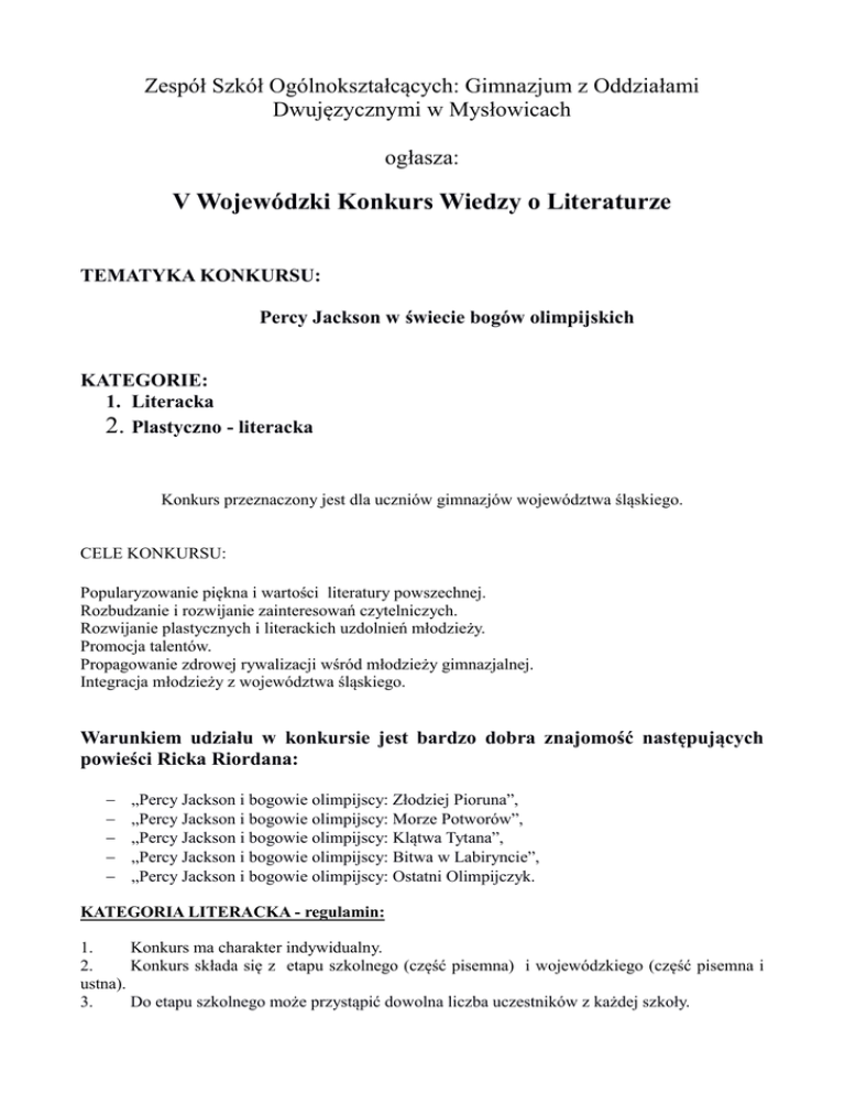 Zespół Szkół Ogólnokształcących: Gimnazjum z Oddziałami Dwujęzycznymi w Mysłowicach ogłasza: V Wojewódzki Konkurs Wiedzy o Literaturze TEMATYKA KONKURSU: Percy Jackson w świecie bogów olimpijskich KATEGORIE: 1. Literacka 2. Plastyczno - literacka Konkurs przeznaczony jest dla uczniów gimnazjów województwa śląskiego. CELE KONKURSU: Popularyzowanie piękna i wartości literatury powszechnej. Rozbudzanie i rozwijanie zainteresowań czytelniczych. Rozwijanie plastycznych i literackich uzdolnień młodzieży. Promocja talentów. Propagowanie zdrowej rywalizacji wśród młodzieży gimnazjalnej. Integracja młodzieży z województwa śląskiego. Warunkiem udziału w konkursie jest bardzo dobra znajomość następujących powieści Ricka Riordana: „Percy Jackson i bogowie olimpijscy: Złodziej Pioruna”, „Percy Jackson i bogowie olimpijscy: Morze Potworów”, „Percy Jackson i bogowie olimpijscy: Klątwa Tytana”, „Percy Jackson i bogowie olimpijscy: Bitwa w Labiryncie”, „Percy Jackson i bogowie olimpijscy: Ostatni Olimpijczyk. KATEGORIA LITERACKA - regulamin: 1. Konkurs ma charakter indywidualny. 2. Konkurs składa się z etapu szkolnego (część pisemna) i wojewódzkiego (część pisemna i ustna). 3. Do etapu szkolnego może przystąpić dowolna liczba uczestników z każdej szkoły. 4. Etap szkolny składa się z pisemnego testu, który organizator odpowiednio wcześniej przesyła do szkoły drogą elektroniczną. Test, składający się z pytań otwartych, będzie sprawdzał znajomość powieści Ricka Riordana. 5. Po przeprowadzeniu etapu szkolnego arkusz testu należy przesłać pocztą do organizatora w tym samym dniu listem poleconym (liczy się data stempla pocztowego) na adres: Zespół Szkół Ogólnokształcących ul. Mickiewicza 6-8 Mysłowice 41-400 z dopiskiem “Percy Jackson”. Wyniki zostaną umieszczone na stronie internetowej www.kosciuszko.pl w zakładce „Szkoła” “Biblioteka” – „Konkursy”. Szkoła, której uczniowie zakwalifikują się do finału, zostanie powiadomiona drogą elektroniczną. 6. Do etapu wojewódzkiego (część pisemna) przechodzi 15 osób z najwyższą liczbą punktów, a do ścisłego finału (część ustna) najlepsza siódemka. Do konkursu obowiązuje: a. znajomość książek Ricka Riordana. b. umiejętność redagowania krótkich form wypowiedzi pisemnej tj. zaproszenia, ogłoszenia, instrukcja, dedykacja. c. umiejętność redagowania dłuższych form wypowiedzi pisemnej tj. listu, charakterystyki, opisu, podania, recenzji, sprawozdania. Terminy: 1. Do 30 listopada 2016 r.- zgłoszenie uczestnictwa szkoły w konkursie (z zaznaczeniem kategorii) drogą elektroniczną na adres: [email protected] Zgłoszenie powinno zawierać: pełną nazwę szkoły wraz z adresem oraz imię, nazwisko i adres mailowy osoby odpowiedzialnej za kontakt z organizatorem i przeprowadzenie etapu szkolnego. Jeżeli do 2.12.2016 r. szkoła nie otrzyma potwierdzenia przyjęcia zgłoszenia – prosimy o kontakt telefoniczny. 2. 15 grudnia 2016 r.- odebranie zestawu pytań na etap szkolny, przesłanego drogą elektroniczną na adres osoby odpowiedzialnej za przeprowadzenie etapu szkolnego (prosimy, aby osoba odpowiedzialna za kontakt z organizatorem potwierdziła otrzymanie zestawu do 15.12.2006 r. do godz. 20:00). 3. 16 grudnia 2016 r. o godz. 9:00 - przeprowadzenie eliminacji szkolnych i odesłanie prac konkursowych w tym samym dniu listem poleconym wraz ze zgodą rodzica ucznia na przetwarzanie danych osobowych! 4. Do 5 stycznia 2017 r. opublikowanie listy uczniów, którzy zakwalifikowali się do etapu wojewódzkiego. 5. 3 lutego 2017 r. o godz. 10:00 finał konkursu w ZSO w Mysłowicach (część pisemna i część ustna). KATEGORIA PLASTYCZNO - LITERACKA – regulamin: 1.Konkurs ma charakter indywidualny. 2.Do konkursu może przystąpić każdy uczeń, który wykona lapbook w oparciu o jeden wybrany tom powieści Ricka Riordana „Percy Jackson i bogowie olimpijscy”. 3. Szkoła spośród wszystkich wykonanych dowolną techniką prac wybiera 3 najlepsze i przesyła na adres: Zespół Szkół Ogólnokształcących ul. Mickiewicza 6-8 Mysłowice 41-400 z dopiskiem “Percy Jackson.” Szczegóły wykonania prac: - Lapbook może zawierać maksymalnie 4 kartki A4, - Technika wykonania pracy dowolna. - Pracę należy wysłać w formie papierowej. - Na pracy należy zamieścić informację zawierającą: imię i nazwisko uczestnika konkursu, nazwę i adres szkoły oraz imię i nazwisko opiekuna. Kryteria oceny: - zgodność treści lapbooka z wybraną częścią powieści „Percy Jackson i bogowie olimpijscy”, - poprawność ortograficzna, interpunkcyjna, składniowa i stylistyczna, - estetyka wykonania, - pomysłowość. W tej kategorii zostaną nagrodzone 3 najlepsze prace spośród wszystkich nadesłanych z całego województwa śląskiego. Terminy: 1. Do 30 listopada 2016 r.- zgłoszenie uczestnictwa szkoły w konkursie (z zaznaczeniem kategorii) drogą elektroniczną na adres: [email protected] Zgłoszenie powinno zawierać: pełną nazwę szkoły wraz z adresem oraz imię, nazwisko i adres mailowy osoby odpowiedzialnej za kontakt z organizatorem i przeprowadzenie etapu szkolnego. Jeżeli do 2.12.2016 r. szkoła nie otrzyma potwierdzenia przyjęcia zgłoszenia – prosimy o kontakt telefoniczny. 2. Do 5 stycznia 2017 r. nadsyłanie prac konkursowych na adres: Zespół Szkół Ogólnokształcących ul. Mickiewicza 6-8 Mysłowice 41-400 z dopiskiem „Percy Jackson” wraz ze zgodą rodzica ucznia na przetwarzanie danych osobowych! 3. Do 13 stycznia 2017 r. opublikowanie nazwisk zwycięzców konkursu na stronie internetowej www.kosciuszko.pl w zakładce “Szkoła – Biblioteka - Konkursy”. Szkoła, której uczniowie zajmą miejsca 1-3 otrzymają również powiadomienie drogą elektroniczną ze szczegółowymi informacjami dotyczącymi gali wręczenia nagród. Rozdanie nagród nastąpi 3 lutego 2017 r. w ZSO w Mysłowicac