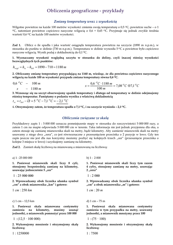 Obliczenia geograficzne - przykłady Zmiany temperatury wraz z wysokością Wilgotne powietrze na każde 100 metrów wysokości zmienia swoją temperaturę o 0,5 OC, powietrze suche – o 1 OC, natomiast powietrze częściowo nasycone wilgocią o 0,6 ÷ 0,65 OC. Przyjmuje się jednak zwykle średnia wartość 0,6 OC na każde 100 metrów wysokości. Zad 1. Oblicz o ile spadła i jaka wartość osiągnęła temperatura powietrza na szczycie (1890 m n.p.m.), w stosunku do punktu w dolinie (730 m n.p.m.). Temperatura w dolinie wynosiła 5 OC a powietrze było częściowo nasycone wilgocią. Wynik podaj z dokładnością do 0,1 OC. 1. Wyznaczamy wysokość względną szczytu w stosunku do doliny, czyli inaczej różnicę wysokości bezwzględnych tych punktów: hwzgl = hsz − hdol = 1890 − 710 = 1180 m 2. Obliczamy zmianę temperatury przypadającą na 1160 m, wiedząc, że dla powietrza częściowo nasyconego wilgocią na każde 100 m wysokości przypada zmiana temperatury równa 0,6 OC. 0,6 O C x − 100 m − 1180 m x= 0,6 O C ⋅ 1180 m = 7,08 O C ≈ 7,1 O C 100 m 3. Wznosząc się na szczyt obserwujemy spadek temperatury i dlatego od temperatury w dolinie odejmujemy różnicę temperatur. Pamiętamy o podaniu wyniku z właściwą dokładnością t sz = t dol − ∆t = 5 O C − 7,1 O C = − 2,1 O C 4. Otrzymujemy zatem, że temperatura spadła o 7,1 OC, i na szczycie wyniosła – 2,1 OC. Obliczenia związane ze skalą Przykładowy zapis 1 : 5 000 000 oznacza pomniejszenie mapy w stosunku do rzeczywistości 5 000 000 razy, a zatem 1 cm na mapie odpowiada 5 000 000 cm w terenie. Taka informacja nie jest jednak przyjemna dla oka, a zatem stosuje się zamianę mianownika skali na metry, bądź kilometry. Aby zamienić mianownik skali na metry usuwamy z niego dwa „zera”, co jest równoznaczne z przesunięciem przecinka o 2 pozycje w lewo. Gdy ten zapis jeszcze nie jest dla nas korzystny możemy pozbyć się kolejnych trzech „zer” (przesunięcie przecinka o kolejne 3 miejsca w lewo) i uzyskujemy zamianę na kilometry. Zad 2. Zamień skalę liczbową na mianowaną a mianowaną na liczbową: a) 1 : 25 000 000 b) 1 : 2 000 1. Ponieważ mianownik skali liczy 8 cyfr, stosujemy bezpośrednią zamianę na kilometry, usuwając jednocześnie 5 „zer” 1. Ponieważ mianownik skali liczy tym razem 4 cyfry, stosujemy zamianę na metry, usuwając 2 „zera” 1 : 25 000 000 1 : 2 000 2. Wprowadzamy obok licznika ułamka symbol „cm” a obok mianownika „km” i gotowe: 2. Wprowadzamy obok licznika ułamka symbol „cm” a obok mianownika „m” i gotowe: 1 cm : 250 km 1 cm : 20 m c) 1 cm – 12,5 km d) 1 cm – 75 m 1. Ponieważ skala mianowana centymetry zamienia na kilometry, musimy usunąć jednostki, a mianownik pomnożyć przez 100 000 1. Ponieważ skala mianowana centymetry zamienia w tym przypadku na metry, usuwamy jednostki, a mianownik mnożymy przez 100 1 : (12,5 · 100 000) 1 : (75 · 100) 2. Wykonujemy mnożenie i otrzymujemy skalę liczbową: 2. Wykonujemy mnożenie i otrzymujemy skalę liczbową: 1 : 1250000 1 : 7500 Zad. 3. Droga krajowa na mapie w skali 1 : 750 000 długość 24 cm. Oblicz jej długość w rzeczywistości. 1. Zamieniamy skalę liczbowa na mianowaną, tak samo jak w zadaniu poprzednim i otrzymujemy: 1 : 750 000 → 1 cm – 7,5 km 2. Korzystając z właściwości proporcji oraz skali mianowanej obliczamy rzeczywistą długość drogi − 1 cm 7,5 km 24 cm − x= x 24 cm ⋅ 7,5 km = 180 km 1 cm 3. Otrzymujemy zatem odpowiedź: Długość drogi krajowej wynosi 180 km. Zad 4. Oblicz powierzchnię gruntów ornych na mapie w skali 1 : 5 000 000, jeśli w terenie ma ono 12 500 km2. 1. Zamieniamy skalę liczbową na mianowaną a następnie podnosimy ją do kwadratu, otrzymując tzw. „skale polową” 1 : 5 000 000 → 1 cm – 50 km (1 cm)2 – (50 km)2 → 1 cm2 – 2 500 km2 2 Korzystając z właściwości proporcji oraz skali „polowej” obliczamy powierzchnię na mapie 1 cm 2 − 2 500 km 2 x − 12 500 km 2 1 cm 2 ⋅ 12 500 km 2 x= = 5 cm 2 2 2 500 km 3. Zapisujemy odpowiedź: Powierzchnia gruntów ornych, na mapie, jest równa 5 cm2. Obliczenia związane z ludnością Demografia to nauka zajmująca się społecznością ludzką. W zakresie jej badań znajdują się m. in.: gęstość zaludnienia G, przyrost naturalny PN, saldo migracji SM, przyrost rzeczywisty PRZ oraz stopy tych wielkości. N , gdzie N – liczba mieszkańców, P – powierzchnia terenu, który oni zamieszkują, P PN = U − Z , gdzie U – liczba żywych urodzeń, Z – liczba zgonów, Przyrost naturalny: U −Z Stopa (współczynnik) przyrostu naturalnego: S PN = ⋅ 1000 ‰ N Saldo migracji: S M = I − E , gdzie I – liczba imigrantów, Z – liczba emigrantów, I −E Stopa (współczynnik) salda migracji: S SM = ⋅ 1000 ‰ , N Przyrost rzeczywisty: PRZ = PN + S M P + SM Stopa (współczynnik) salda migracji: S PR = N ⋅ 1000 ‰ lub S PR = S PN + S SM N Gęstość zaludnienia: G = Przyrost naturalny, saldo migracji i przyrost rzeczywisty a także stopy ww. wielkości mogą być wielkościami zarówno dodatnimi jak i ujemnymi. Należy pamiętać jednak, w jaki sposób interpretować otrzymany wynik i że wielkość i jej stopa muszą mieć dla danego przypadku taki sam znak. Poniższe tabele zawierają dane demograficzne dla województwa wielkopolskiego za rok 2010, niezbędne do prezentacji rozwiązań zadań 5 – 9 Liczba ludności N 3 419 400 osób Powierzchnia P 29 800 km2 Urodzenia żywe U 40 900 osób Imigracje I 42 400 osób Zgony Z 31 000 osób Emigracje E 40 700 osób Zad 5. Oblicz średnia gęstość zaludnienia w województwie wielkopolskim. 1. Liczbę ludności i powierzchnię terenu, który zamieszkuje ta ludność, podstawiamy do wzoru pamiętając o tym, żeby dane były przedstawione w odpowiednich jednostkach: N = 3 419 400 osób P = 29 800 km2 2. Podstawiamy dane do wzoru: G= N 3 419 400 = ≈ 115 osób / km2 P 29 800 2. Otrzymujemy średnią gęstoś