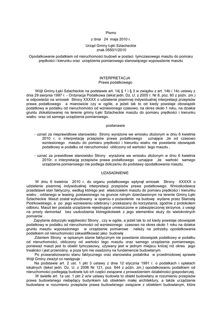 Pismo z dnia 24 maja 2010 r. Urząd Gminy Łęki Szlacheckie znak 0550/1/2010 Opodatkowanie podatkiem od nieruchomości budowli w postaci tymczasowego masztu do pomiaru prędkości i kierunku oraz urządzenia pomiarowego stanowiącego wyposażenie masztu INTERPRETACJA Prawa podatkowego Wójt Gminy Łęki Szlacheckie na podstawie art. 14j § 1 i § 3 w związku z art. 14b i 14c ustawy z dnia 29 sierpnia 1997 r. - Ordynacja Podatkowa (tekst jedn. Dz. U. z 2005 r. Nr 8, poz. 60 z późn. zm.) w odpowiedzi na wniosek Strony XXXXX o udzielenie pisemnej indywidualnej interpretacji przepisów prawa podatkowego a mianowicie czy w ogóle, a jeżeli tak to od kiedy powstaje obowiązek podatkowy w podatku od nieruchomości od wzniesionego czasowo, na okres około 1 roku, na działce gruntu zlokalizowanej na terenie gminy Łęki Szlacheckie masztu do pomiaru prędkości i kierunku wiatru oraz od samego urządzenia pomiarowego. postanawia - uznać za nieprawidłowe stanowisko Strony wyrażone we wniosku złożonym w dniu 6 kwietnia 2010 r. o interpretację przepisów prawa podatkowego uznające ,że od czasowo wzniesionego masztu do pomiaru prędkości i kierunku wiatru nie powstanie obowiązek podatkowy w podatku od nieruchomości obliczony od wartości tego masztu , - uznać za prawidłowe stanowisko Strony wyrażone we wniosku złożonym w dniu 6 kwietnia 2010r. o interpretację przepisów prawa podatkowego uznające ,że wartość samego urządzenia pomiarowego nie podlega doliczeniu do podstawy opodatkowania masztu. UZASADNIENIE W dniu 6 kwietnia 2010 r. do organu podatkowego wpłynął wniosek Strony XXXXX o udzielenie pisemnej indywidualnej interpretacji przepisów prawa podatkowego. Wnioskodawca przedstawił stan faktyczny, według którego jest właścicielem masztu do pomiaru prędkości i kierunku wiatru , oddanego w leasing ,postawionego na gruncie rolnym dzierżawionym na terenie Gminy Łęki Szlacheckie .Maszt został wybudowany w oparciu o pozwolenie na budowę wydane przez Starostę Piotrkowskiego, a po jego wzniesieniu odebrany i przekazany do korzystania, zgodnie z protokołem odbioru. Maszt ten posiada urządzenie rejestrujące umieszczone w zabezpieczonej skrzynce, z uwagi na prosty demontaż bez uszkodzenia któregokolwiek z jego elementów służy do wielokrotnych pomiarów . Zapytanie dotyczyło wątpliwości Strony , czy w ogóle, a jeżeli tak to od kiedy powstaje obowiązek podatkowy w podatku od nieruchomości od wzniesionego czasowo na okres około 1 roku na działce gruntu masztu wyposażonego w urządzenie pomiarowe należy na potrzeby opodatkowania podatkiem od nieruchomości zakwalifikować jako budowlę . Zdaniem Strony w opisanym stanie faktycznym nie powstanie obowiązek podatkowy w podatku od nieruchomości, obliczony od wartości tego masztu oraz samego urządzenia pomiarowego, ponieważ maszt jest to obiekt tymczasowy, używany jest w jednym miejscu krócej niż okres jego trwałości i jest przenośny, a poza tym nie osadzony na fundamencie budowlanym. Po przeanalizowaniu stanu faktycznego oraz stanowiska podatnika w przedmiotowej sprawie Wójt Gminy zważył co następuje : Na podstawie art. 2 ust. 1 pkt 3 ustawy z dnia 12 stycznia 1991 r. o podatkach i opłatach lokalnych (tekst jedn. Dz. U. z 2006 Nr 121, poz. 844 z późn. zm.) opodatkowaniu podatkiem od nieruchomości podlegają budowle lub ich części związane z prowadzeniem działalności gospodarczej. W świetle art. 1a ust. 1 pkt 2 w/w ustawy budowla to obiekt budowlany w rozumieniu przepisów prawa budowlanego niebędący budynkiem lub obiektem małej architektury, a także urządzenie budowlane w rozumieniu przepisów prawa budowlanego związane z obiektem budowlanym, które zapewnia możliwość użytkowania obiektu zgodnie z jego przeznaczeniem. Z uwagi na fakt, iż pojęcie budowli zawarte w art. 1 a ust. 1 pkt. 2 ustawy o podatkach i opłatach lokalnych odwołuje się bezpośrednio do przepisów prawa budowlanego, należy je interpretować zgodnie z ustawą z dnia 7 lipca 1994 r. Prawo budowlane (Dz. U. z 2003 r. nr 207, poz. 2016). W myśl art. 3 pkt. 3 ustawy Prawo budowlane budowlą jest każdy obiekt budowlany nie będący budynkiem lub obiektem małej architektury jak: lotniska, drogi, linie kolejowe, mosty, wiadukty, estakady, tunele, przepusty ,sieci techniczne, wolno stojące maszty antenowe, wolno stojące trwale związane z gruntem urządzenia reklamowe, budowle ziemne, obronne (fortyfikacje), ochronne, hydrotechniczne, zbiorniki, wolno stojące instalacje przemysłowe lub urządzenia techniczne, oczyszczalnie ścieków, składowiska odpadów, stacje uzdatniania wody, konstrukcje oporowe, nadziemne i podziemne przejścia dla pieszych sieci uzbrojenia terenu, budowle sportowe, cmentarze, pomniki, a także części budowlane urządzeń technicznych (kotłów, pieców przemysłowych, elektrowni wiatrowych i innych urządzeń) oraz fundamenty pod maszyny i urządzenia, jako odrębne pod względem technicznym części przedmiotów składających się na całość użytkową. Jednocześnie ustawa o podatkach i opłatach lokalnych nie definiuje pojęcia "obiektów budowlanych", lecz poprzez sformułowanie: "w rozumieniu przepisów prawa budowlanego" odsyła w tym zakresie do unormowań tego prawa. W art. 3 pkt 5 Prawa budowlanego ustalona została - nie unormowana w ustawie o podatkach i opłatach lokalnych - definicja tymczasowego obiektu budowlanego, zgodnie którą należy rozmieć obiekt budowlany przeznaczony do czasowego używania w okresie krótszym od jego trwałości technicznej, przewidziany do przeniesienia w inne miejsce lub rozbiórki, a także obiekt budowlany niepołączony trwale z gruntem, jak: strzelnice, kioski uliczne, pawilony sprzedaży ulicznej i wystawowe, przekrycia namiotowe i powłoki pneumatyczne, urządzenia rozrywkowe, barakowozy, obiekty kontenerowe. W prawie budowlanym pod pojęciem obiektu budowlanego rozumie się "budynek ", "budowlę" i "obiekt małej archit