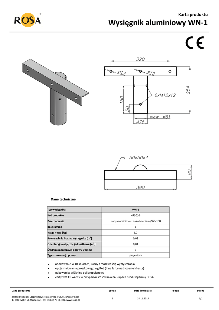 Karta produktu Wysięgnik aluminiowy WN-1 Dane techniczne Typ wysięgnika WN-1 Kod produktu 473010 Przeznaczenie słupy aluminiowe z zakooczeniem Ø60x180 Ilośd ramion 1 Waga netto [kg] 1,2 Powierzchnia boczna wysięgnika [m2] 0,03 Orientacyjna objętośd jednostkowa [m3] 0,01 Średnica montażowa oprawy Ø [mm] x Typ stosowanej oprawy projektory anodowanie w 10 kolorach, każdy z możliwością wybłyszczania opcja malowania proszkowego wg RAL (inne farby na życzenie klienta) pakowanie: włóknina polipropylenowa certyfikat CE ważny w przypadku stosowania na słupach produkcji firmy ROSA Dane producenta Zakład Produkcji Sprzętu Oświetleniowego ROSA Stanisław Rosa 43-109 Tychy, ul. Strefowa 1, tel. +48 32 73 88 901, www.rosa.pl Edycja Data aktualizacji 5 18.11.2014 Podpis Strona 1/1
