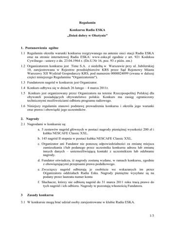 Regulamin Konkursu Radia ESKA „Dzień dobry w Olsztynie” 1. Postanowienia ogólne 1.1 Regulamin określa warunki konkursu rozgrywanego na antenie sieci stacji Radia ESKA oraz na stronie internetowej Radia ESKA: www.eska.pl zgodnie z art. 921 Kodeksu Cywilnego - ustawy z dn. 23.04.1964 r. (Dz.U.Nr 16, poz. 93 z późn. zm.) 1.2 Organizatorem konkursu jest Time S.A. z siedzibą w Warszawie przy ul. Jubilerskiej 10, zarejestrowana w Rejestrze przedsiębiorców KRS przez Sąd Rejonowy Miasta Warszawy XII Wydział Gospodarczy KRS, pod numerem 0000024099 (zwana w dalszej części niniejszego Regulaminu "Organizatorem"). 1.3 Fundatorem nagród w konkursie jest Organizator. 1.4 Konkurs odbywa się w dniach 26 lutego – 4 marca 2011r. 1.5 Konkurs jest organizowany przez Organizatora na terenie Rzeczpospolitej Polskiej dla obywateli posiadających obywatelstwo polskie. Konkurs ma zasięg ograniczony technicznymi możliwościami odbioru programu radiowego. 1.6 Niniejszy regulamin stanowi podstawę prowadzenia konkursu i określa jego warunki oraz prawa i obowiązki jego uczestników. 2. Nagrody 2.1 Nagrodami w konkursie są: a. 5 zestawów nagród głównych w postaci nagrody pieniężnej wysokości 200 zł i kubka NESCAFE Classic XXL. b. 145 nagród II stopnia w postaci kubka NESCAFE Classic XXL. c. Organizator ani Fundator nie ponoszą odpowiedzialności za zmianę miejsca zamieszkania i/lub podanego przez uczestnika konkursu adresu lub zmianę innych danych – uniemożliwiającą kontakt z uczestnikiem lub odebranie nagrody. d. Fundator oświadcza, iż nagrody zostaną wydane, w ramach konkursu, zgodnie z obowiązującymi przepisami prawa podatkowego. e. Zwycięzcy nagród odbierają je osobiście we wskazanych im przez Organizatora oddziałach Radia Eska. Nagrody pieniężne wysyłane są na podany przez laureata numer konta f. Słuchacze, którzy nie odbiorą nagród do 31 marca 2011 roku tracą prawo do tych nagród i ich odbioru. Nagrody te pozostają własnością Fundatora. 3 Zasady konkursu 3.1 W konkursie mogą brać udział osoby zarejestrowane w klubie Radia ESKA. 1/3 3.2 Konkurs trwa od 26 lutego do 4 marca 2011r. 3.3 W czasie trwania konkursu Słuchacze zgłaszają się do dokańczając zdanie „Poranek z NESFACE jest dobry bo…”. Do konkursu można się zgłosić poprzez wypełnienie formularza umieszczonego na stronie www.eska.pl/nescafe_olsztyn lub wysyłanie SMS pod numer 7142 w formacie „NESCAFE Olsztyn, (dokończenie zdania)”. Koszt wysłania SMS wynosi 1,23 zł z VAT. 3.4 Po zakończeniu konkursu między 28 lutego a 6 marca komisja konkursowa wybiera 5 laureatów nagród głównych oraz 145 laureatów nagród II stopnia. 3.5 Laureaci, którzy zgłosili się do konkursu w Internecie powiadamiani są o wygranej i sposobie odebrania nagrody drogą mailową na adres podany w zgłoszeniu. Laureaci, którzy zgłosili się do konkursu SMS-em zostaną powiadomieni o wygranej sms-em zwrotnym na numer, z którego zgłosili się do konkursu. 3.6 Laureaci konkursu w ciągu 7 dni od daty powiadomienia o wygranej zobowiązani są odesłać swoje dane niezbędne do odebrania nagrody do Organizatora na adres mailowy podany w powiadomieniu o wygranej. 3.7 Wyborem laureatów konkursu zajmuje się komisja konkursowa w składzie: Przewodniczący Grzegorz Wilk Członek komisji Michalina Pietrzyk Członek komisji Agata Walęcka o Werdykt komisji konkursowej jest werdyktem ostatecznym w zakresie wyników konkursu. o Nad prawidłowością przebiegu akcji i pracy komisji konkursowej czuwają władze statutowe Organizatora. o Komisja konkursowa potwierdza zgodność przeprowadzenia konkursu z regulaminem. 3.8 Jednej osobie może być przyznana tylko jedna nagroda, przez cały czas trwania konkursu, niezależnie od ilości zgłoszeń dokonanych zgodnie z pkt 3.3 niniejszego regulaminu. 3.9 Organizator zastrzega, że uczestnik, który otrzyma nagrodę w jednej z edycji konkursu nie ma prawa ponownego udziału w konkursie ani prawa do kolejnej nagrody. 3.10 Zwycięzca zobowiązany jest do podania Organizatorowi swoich danych (imię i nazwisko) koniecznych dla celów odebrania nagrody w oddziale Radia ESKA. 4. Zasady uczestnictwa w konkursie 4.1 W konkursie nie mogą brać udziału pracownicy i stali holdingu ZPR S.A. oraz Fundatora. współpracownicy spółek 4.2 Zakaz uczestnictwa w akcji promocyjnej dotyczy również członków najbliższej rodziny podmiotów wymienionych w pkt. 4.1. 4.3 Uczestnikiem konkursu jest osoba, która spełniła wszystkie warunki określone w niniejszym regulaminie. 4.4 Uczestnictwa w konkursie, jak i praw i obowiązków z nim związanych, w tym także prawa do żądania wydania nagrody, nie można przenosić na inne osoby i podmioty. 2/3 4.5 Przez przystąpienie do konkursu uczestnik akceptuje w całości regulamin i zobowiązuje się do przestrzegania określonych w nim zasad, jak również potwierdza, iż spełnia wszystkie warunki, które uprawniają go do udziału w konkursie. 5. Postępowanie reklamacyjne 5.1. Wszelkie zastrzeżenia dotyczące przebiegu konkursu, należy składać Organizatorowi na piśmie, nie później niż 14 dni roboczych od daty jego zakończenia. Reklamacja powinna zawierać imię, nazwisko, nazwę uczestnika, jak również dokładny opis i powód reklamacji. 5.2. W przypadku przesłania reklamacji złożonej za pośrednictwem poczty decyduje data stempla pocztowego. 5.3. Złożone przez uczestników reklamacje będą rozpatrywane przez Organizatora niezwłocznie, jednakże nie później niż w terminie 14 dni od daty złożenia reklamacji. 5.4. Zainteresowani uczestnicy zostaną powiadomieni o rozpatrzeniu reklamacji telefonicznie lub na piśmie, najpóźniej w ciągu 14 dni od daty rozpatrzenia reklamacji przez Organizatora. 6. Postanowienia końcowe 6.1 Pełna treść regulaminu udostępniona będzie do wglądu w siedzibie Organizatora w Warszawie, przy ul. Jubilerskiej 10 oraz w Internecie na stronie konkursowej pod adresem www.es