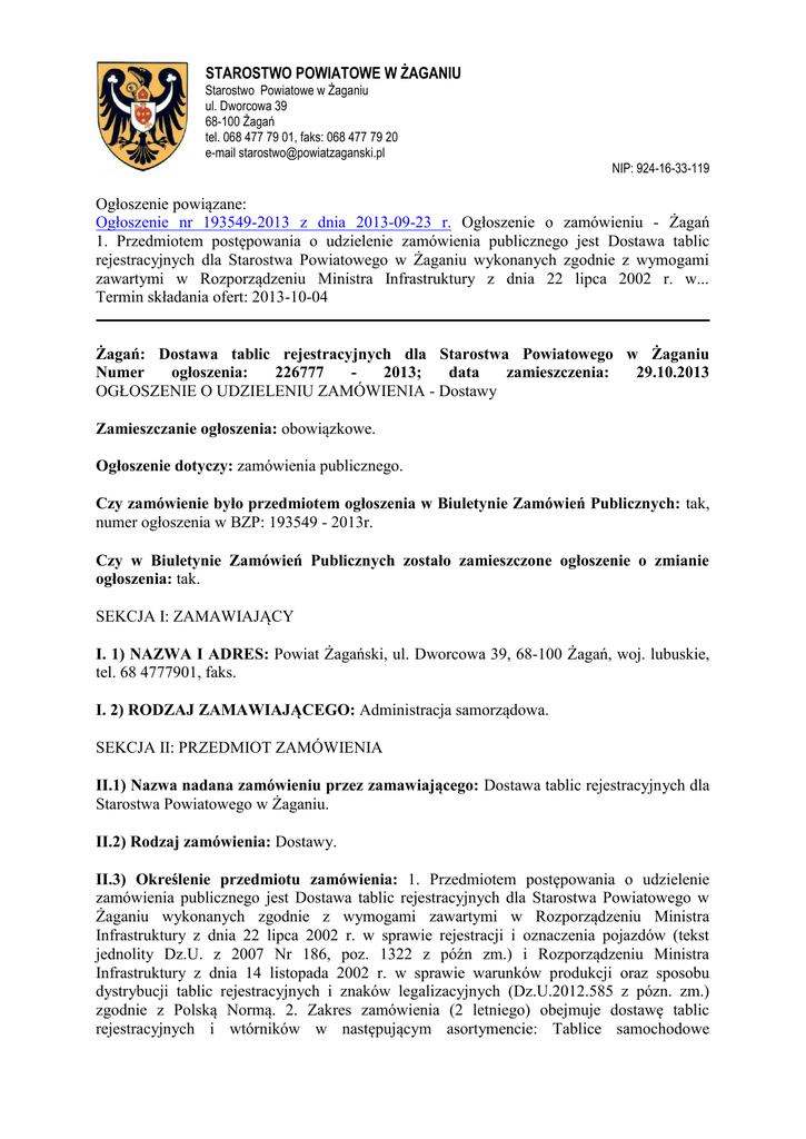 STAROSTWO POWIATOWE W ŻAGANIU Starostwo Powiatowe w Żaganiu ul. Dworcowa 39 68-100 Żagań tel. 068 477 79 01, faks: 068 477 79 20 e-mail [email protected] NIP: 924-16-33-119 Ogłoszenie powiązane: Ogłoszenie nr 193549-2013 z dnia 2013-09-23 r. Ogłoszenie o zamówieniu - Żagań 1. Przedmiotem postępowania o udzielenie zamówienia publicznego jest Dostawa tablic rejestracyjnych dla Starostwa Powiatowego w Żaganiu wykonanych zgodnie z wymogami zawartymi w Rozporządzeniu Ministra Infrastruktury z dnia 22 lipca 2002 r. w... Termin składania ofert: 2013-10-04 Żagań: Dostawa tablic rejestracyjnych dla Starostwa Powiatowego w Żaganiu Numer ogłoszenia: 226777 2013; data zamieszczenia: 29.10.2013 OGŁOSZENIE O UDZIELENIU ZAMÓWIENIA - Dostawy Zamieszczanie ogłoszenia: obowiązkowe. Ogłoszenie dotyczy: zamówienia publicznego. Czy zamówienie było przedmiotem ogłoszenia w Biuletynie Zamówień Publicznych: tak, numer ogłoszenia w BZP: 193549 - 2013r. Czy w Biuletynie Zamówień Publicznych zostało zamieszczone ogłoszenie o zmianie ogłoszenia: tak. SEKCJA I: ZAMAWIAJĄCY I. 1) NAZWA I ADRES: Powiat Żagański, ul. Dworcowa 39, 68-100 Żagań, woj. lubuskie, tel. 68 4777901, faks. I. 2) RODZAJ ZAMAWIAJĄCEGO: Administracja samorządowa. SEKCJA II: PRZEDMIOT ZAMÓWIENIA II.1) Nazwa nadana zamówieniu przez zamawiającego: Dostawa tablic rejestracyjnych dla Starostwa Powiatowego w Żaganiu. II.2) Rodzaj zamówienia: Dostawy. II.3) Określenie przedmiotu zamówienia: 1. Przedmiotem postępowania o udzielenie zamówienia publicznego jest Dostawa tablic rejestracyjnych dla Starostwa Powiatowego w Żaganiu wykonanych zgodnie z wymogami zawartymi w Rozporządzeniu Ministra Infrastruktury z dnia 22 lipca 2002 r. w sprawie rejestracji i oznaczenia pojazdów (tekst jednolity Dz.U. z 2007 Nr 186, poz. 1322 z późn zm.) i Rozporządzeniu Ministra Infrastruktury z dnia 14 listopada 2002 r. w sprawie warunków produkcji oraz sposobu dystrybucji tablic rejestracyjnych i znaków legalizacyjnych (Dz.U.2012.585 z pózn. zm.) zgodnie z Polską Normą. 2. Zakres zamówienia (2 letniego) obejmuje dostawę tablic rejestracyjnych i wtórników w następującym asortymencie: Tablice samochodowe STAROSTWO POWIATOWE W ŻAGANIU Starostwo Powiatowe w Żaganiu ul. Dworcowa 39 68-100 Żagań tel. 068 477 79 01, faks: 068 477 79 20 e-mail [email protected] NIP: 924-16-33-119 jednorzędowe - 11.000 kpl. Tablice samochodowe dwurzędowe - 500 kpl. Tablice samochodowe jednorzędowe indywidualne - 30 kpl. Tablice samochodowe indywidualne dwurzędowe - 10 kpl. Tablice na przyczepy jednorzędowe - 1.000 szt. Tablice na przyczepy dwurzędowe - 400 szt. Tablice motocyklowe - 700 szt. Tablice motocyklowe indywidualne 10 szt. Tablice motorowerowe - 700 szt. Tablice samochodowe jednorzędowe tymczasowe 400 kpl Tablice motocyklowe tymczasowe - 100 szt Tablice motorowerowe tymczasowe 100 szt. Tablice zabytkowe samochodowe - 10 kpl. Wtórniki tablic - 1.600 szt. 3 Wykonawca jest zobowiązany do bezpłatnego złomowania zniszczonych i wycofanych z użytku tablic rejestracyjnych. Wykonawca jest zobowiązany dostarczyć Zamawiającemu w ciągu 30 dni od daty odebrania tablic do złomowania do przedstawienia protokołu z przeprowadzonej kasacji. 4. Podane w pkt III.2. ilości tablic rejestracyjnych stanowią szacunkowe zapotrzebowanie, jakie zamawiający przewiduje zakupić w okresie obowiązywania umowy. 5. Z tytułu niezrealizowania 100% wskazanych w pkt. III.2. ilości tablic rejestracyjnych Wykonawcy nie będą przysługiwały roszczenia przeciwko Zamawiającemu. Ponadto Zamawiający może dokonać zmiany asortymentowej i ilościowej określonej w zamówieniu publicznym w ramach przedmiotu zamówienia. 6. Szczegółowa ilość zamawianych tablic rejestracyjnych będzie określana każdorazowo zamówieniami jednostkowymi. 7. Dostawa przedmiotu zamówienia obejmuje dostawę i wyładunek przedmiotu zamówienia w miejscu wskazanym przez Zamawiającego. 8. Wykonawca użyczy i zainstaluje oprogramowanie umożliwiające elektroniczne składanie zamówień na tablice rejestracyjne. Wykonawca zapewni również przeszkolenie użytkowników w zakresie prawidłowej obsługi oprogramowania. 9. Zamawiający wymaga, aby oprogramowanie posiadało, co najmniej następujące cechy: Łatwy w użyciu program instalacyjny niewymagający zaawansowanej wiedzy. Program taki powinien po zakończeniu działania udostępnić użytkownikowi gotowe do pracy oprogramowanie Program powinien posiadać możliwość automatycznego sprawdzania istnienia nowszej wersji i automatycznej aktualizacji przez Internet Program powinien posiadać dedykowane narzędzie dla administratora pozwalające zarządzać prawami dostępu i automatyzować wykonywanie kopii bezpieczeństwa oraz przywrócenia danych z wykonanej wcześniej kopii Automatyczne tworzenie formularza zamówień na wszystkie rodzaje i wyróżniki tablic, również na wtórniki zgodnie z Rozporządzeniem Ministra Infrastruktury w sprawie rejestracji i oznakowania pojazdów (prosty, intuicyjny formularz zamówień) z możliwością wysyłania ich w formie elektronicznej, w pliku xml, sprawdzanie zgodności wprowadzanych numerów z właściwym Rozporządzeniem Ministra Infrastruktury z dnia 22 lipca 2001 w sprawie rejestracji i oznaczania pojazdów (tekst jednolity - Dz. U z 2007r. Nr 186, poz. 1322, z późniejszymi zmianami) już na etapie tworzenia zamówienia i blokowanie możliwości wpisania niepoprawnych numerów ze szczególnym uwzględnieniem: zgodności długości wprowadzanego numeru oraz położenia liter i cyfr dla poszczególnych typów i odmian, blokowania dla określonych typów tablic niedozwolonych liter, wykluczania dla określonych typów tablic niedopuszczalnych sekwencji cyfr, generowanie pozycji zamówienia zawierających kolejne wolne numery po podaniu jedynie ilości zamawianych tablic oraz ich typu. Wygenerowane w ten sposób zamówienie powinno uwzględniać (pomijać) niedozwo
