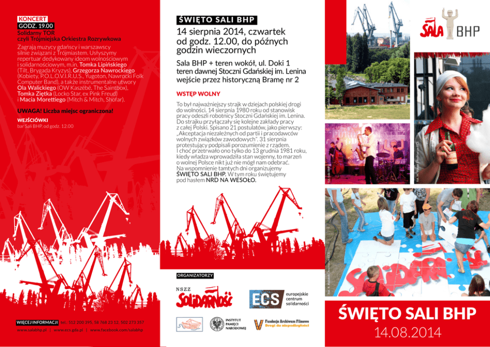 wstęp wolny To był najważniejszy strajk w dziejach polskiej drogi do wolności. 14 sierpnia 1980 roku od stanowisk pracy odeszli robotnicy Stoczni Gdańskiej im. Lenina. Do strajku przyłączały się kolejne zakłady pracy z całej Polski. Spisano 21 postulatów, jako pierwszy: „Akceptacja niezależnych od partii i pracodawców wolnych związków zawodowych”. 31 sierpnia protestujący podpisali porozumienie z rządem. I choć przetrwało ono tylko do 13 grudnia 1981 roku, kiedy władza wprowadziła stan wojenny, to marzeń o wolnej Polsce nikt już nie mógł nam odebrać. Na wspomnienie tamtych dni organizujemy ŚWIĘTO SALI BHP. W tym roku świętujemy pod hasłem NRD NA WESOŁO. ORGANIZATORZY więcej informacji tel.: 512 200 395, 58 768 23 12, 502 273 357 www.salabhp.pl | www.ecs.gda.pl | www.facebook.com/salabhp fot. M. Hasse | Archiwum ECS Sala BHP + teren wokół, ul. Doki 1 teren dawnej Stoczni Gdańskiej im. Lenina wejście przez historyczną Bramę nr 2 fot. R.Kwiatek | Sala BHP, widok z góry wejściówki bar Sali BHP, od godz. 12.00 14 sierpnia 2014, czwartek od godz. 12.00, do późnych godzin wieczornych fot. Sala BHP uwaga! Liczba miejsc ograniczona! Ś wi ę to Sa li B H P fot. R. Kwiatek | Archiwum ECS koncert GODZ. 19.00 Solidarny TOR czyli Trójmiejska Orkiestra Rozrywkowa Zagrają muzycy gdańscy i warszawscy silnie związani z Trójmiastem. Usłyszymy repertuar dedykowany ideom wolnościowym i solidarnościowym, m.in. Tomka Lipińskiego (Tilt, Brygada Kryzys), Grzegorza Nawrockiego (Kobiety, P.O.L.O.V.I.R.U.S., Yugoton, Nawrocki Folk Computer Band), a także instrumentalne utwory Ola Walickiego (OW Kaszëbë, The Saintbox), Tomka Ziętka (Locko Star, ex Pink Freud) i Macia Morettiego (Mitch & Mitch, Shofar). Święto Sali BHP 14.08.2014 Program Kino DLA dzieci godz. 12.00–16.00 Pokażemy kultowe bajki z lat 70. i 80. ubiegłego wieku. ZABAWY PODWÓRKOWE JAK ZA DAWNYCH LAT godz. 12.00–16.00 Będziemy grać w gumę, skakać na skakance, malować… Zabawy i gry poprowadzą animatorzy. Stoczniowe budowanie! godz. 12.00–14.00 wiek: 10+ Zbudujemy razem statek-muzeum oraz wyposażymy go w historyczne eksponaty. Na pokładzie statku powstanie ekspozycja upamiętniająca Sierpień ’80. Wspólnie zbudujemy też styropianowy domek, a wszyscy młodzi budowniczowie wezmą udział w warsztatach plastycznych, muzealnych i historycznych. Zajęcia będą trwały nie dłużej niż 2 godziny. Liczba miejsc ograniczona! zapisy e-mail: [email protected], tel.: 58 768 23 12 Zaprojektuj i stwórz swoją własną jednostkę pływającą! godz. 12.00–16.00 wiek: 5+ Dzieciaki spróbują swoich sił w tworzeniu statków. Do ich budowania wykorzystamy papier i materiały recyklingowe. Sprawdzimy także, czy statki będą się unosiły na wodzie. Wstęp wolny. Zrób stoczniową „SELFIE” godz. 12.00–16.00 AUTOPORTRET Z MINIONEJ EPOKI Zaaranżujemy plan zdjęciowy, będą czekać rekwizyty, aby powstały „selfie” (fotograficzne autoportrety) z minionej epoki – czasów PRL i NRD. KONKURS Z NAGRODAMI godz. 12.00–16.10 NRD na wesoło Jak wyglądało codzienne życie bratniego narodu ze wschodnich Niemiec widziane oczami obywateli PRL? – przynieś pamiątkę rodem z NRD lub jej zdjęcie, podziel się historią i wygraj nagrodę! Szczegóły konkursu na www.facebook.com/salabhp O godz. 16.00 nastąpi ogłoszenie wyników konkursu NRD na wesoło, połączone z prezentacją zebranych pamiątek i gadżetów. Śledź nasz profil na Facebooku i już dzisiaj wystartuj w konkursie NRD na wesoło. nagrody Wycieczka z przewodnikiem po terenach dawnej Stoczni Gdańskiej im. Lenina lub bon o wartości 150 zł do zrealizowania w sklepie Sali BHP oraz gry „Pan tu nie stał” i oryginalne kufle Sali BHP. warsztaty godz. 12.00–19.00 Kącik komputerowy Będzie można się dowiedzieć, m.in. czym różni się technologia 8-bitowa od nowych technologii cyfrowych i zagrać w kultowe gry komputerowe. SEMINARIUM SIERPNIOWE godz. 12.30–16.00 12.30–13.30 Solidarność podsłuchuje WładzĘ Wykład oraz prezentacja archiwalnych zdjęć i sprzętu radiowego legendarnego radiooperatora niezależnej łączności NSZZ „Solidarność” Zygmunta Błażka. Gościem specjalnym będzie sam Zygmunt Błażek, a spotkanie poprowadzi Łukasz Grochowski z Archiwum Komisji Krajowej NSZZ „Solidarność”. 15.00–15.30 Archiwalia Międzyzakładowego Komitetu Strajkowego (MKS) Zdjęcia i dokumenty ilustrujące strajk sprzed 34 lat przedstawi Łukasz Grochowski z Archiwum Komisji Krajowej NSZZ „Solidarność”. 15.30–16.00 Realia polityczne i społeczne PRL i NRD Temat zaprezentuje dr Michał Sempołowicz z Oddziałowego Biura Edukacji Publicznej IPN w Gdańsku. WYCIECZKA Z PRZEWODNIKIEM godz. 14.15 i 15.20 ZWIEDZAMY DAWNĄ STOCZNIę GDAŃSKĄ IM. LENINA Zwiedzimy tereny dawnej stoczni, wspominając strajk w sierpniu 1980 roku. Miejsce zbiórki bar w Sali BHP kino godz. 16.15 Projekcja filmu. Good bye Lenin! Akcja tego niemieckiego komediodramatu rozgrywa się po upadku NRD. Matka głównego bohatera, szczerze wierząca w partię i komunizm, dostaje zawału i zapada w śpiączkę. Gdy się budzi, nie ma już Muru Berlińskiego, a kraje w Europie Środkowej i Wschodniej wkraczają w kapitalizm. W trosce o jej zdrowie syn udaje, że nic się nie zmieniło i odtwarza symbole i detale minionej rzeczywistości. „Good bye Lenin!” w reż. Wolfganga Beckera pochodzi z 2003 roku. Wprowadzenie do filmu poczyni dr Bartosz Filip z Uniwersytetu Gdańskiego (15 minut). Projekcja trwa 121 minut. W PLENERZE godz. 12.00–19.00 grill Będziemy świętować – nawiązując do tegorocznego zawołania przewodniego – pod hasłem: Wurst Und Bier. Przygotowaliśmy niespodzianki rodem z NRD.