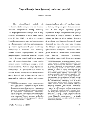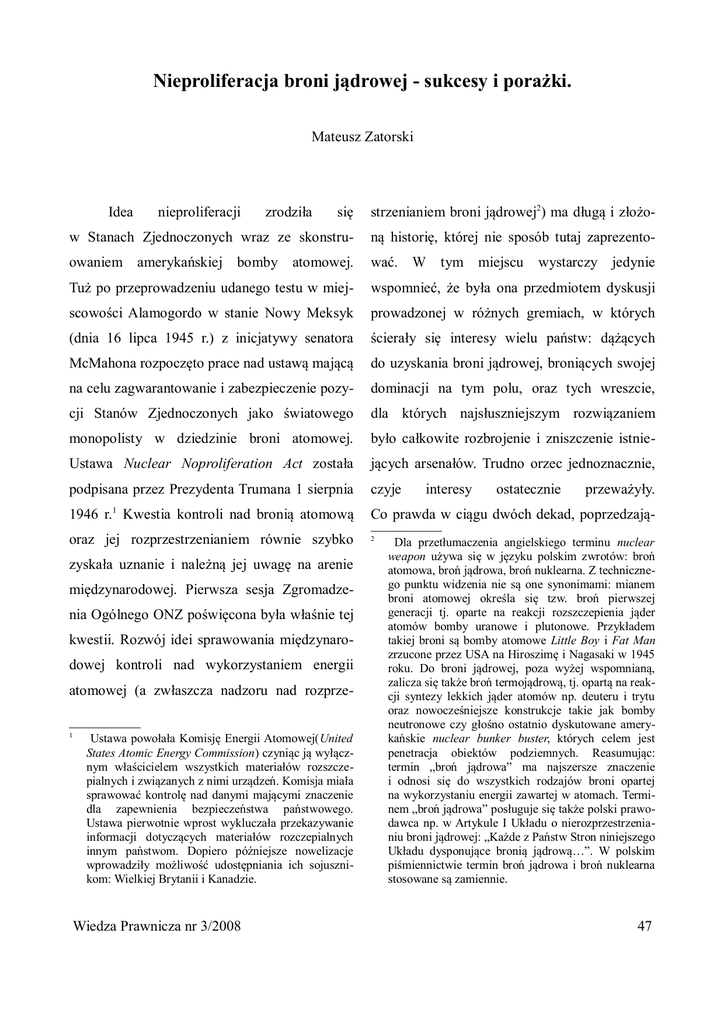 Nieproliferacja broni jądrowej - sukcesy i porażki. Mateusz Zatorski się strzenianiem broni jądrowej2) ma długą i złożo- w Stanach Zjednoczonych wraz ze skonstru- ną historię, której nie sposób tutaj zaprezento- owaniem amerykańskiej bomby atomowej. wać. W tym Tuż po przeprowadzeniu udanego testu w miej- wspomnieć, że była ona przedmiotem dyskusji scowości Alamogordo w stanie Nowy Meksyk prowadzonej w różnych gremiach, w których (dnia 16 lipca 1945 r.) z inicjatywy senatora ścierały się interesy wielu państw: dążących McMahona rozpoczęto prace nad ustawą mającą do uzyskania broni jądrowej, broniących swojej na celu zagwarantowanie i zabezpieczenie pozy- dominacji na tym polu, oraz tych wreszcie, cji Stanów Zjednoczonych jako światowego dla których najsłuszniejszym rozwiązaniem monopolisty w dziedzinie broni atomowej. było całkowite rozbrojenie i zniszczenie istnie- Ustawa Nuclear Noproliferation Act została jących arsenałów. Trudno orzec jednoznacznie, podpisana przez Prezydenta Trumana 1 sierpnia czyje 1946 r.1 Kwestia kontroli nad bronią atomową Co prawda w ciągu dwóch dekad, poprzedzają- oraz jej rozprzestrzenianiem równie szybko 2 Idea nieproliferacji zrodziła zyskała uznanie i należną jej uwagę na arenie międzynarodowej. Pierwsza sesja Zgromadzenia Ogólnego ONZ poświęcona była właśnie tej kwestii. Rozwój idei sprawowania międzynarodowej kontroli nad wykorzystaniem energii atomowej (a zwłaszcza nadzoru nad rozprze1 Ustawa powołała Komisję Energii Atomowej(United States Atomic Energy Commission) czyniąc ją wyłącznym właścicielem wszystkich materiałów rozszczepialnych i związanych z nimi urządzeń. Komisja miała sprawować kontrolę nad danymi mającymi znaczenie dla zapewnienia bezpieczeństwa państwowego. Ustawa pierwotnie wprost wykluczała przekazywanie informacji dotyczących materiałów rozczepialnych innym państwom. Dopiero późniejsze nowelizacje wprowadziły możliwość udostępniania ich sojusznikom: Wielkiej Brytanii i Kanadzie. Wiedza Prawnicza nr 3/2008 interesy miejscu wystarczy jedynie ostatecznie przeważyły. Dla przetłumaczenia angielskiego terminu nuclear weapon używa się w języku polskim zwrotów: broń atomowa, broń jądrowa, broń nuklearna. Z technicznego punktu widzenia nie są one synonimami: mianem broni atomowej określa się tzw. broń pierwszej generacji tj. oparte na reakcji rozszczepienia jąder atomów bomby uranowe i plutonowe. Przykładem takiej broni są bomby atomowe Little Boy i Fat Man zrzucone przez USA na Hiroszimę i Nagasaki w 1945 roku. Do broni jądrowej, poza wyżej wspomnianą, zalicza się także broń termojądrową, tj. opartą na reakcji syntezy lekkich jąder atomów np. deuteru i trytu oraz nowocześniejsze konstrukcje takie jak bomby neutronowe czy głośno ostatnio dyskutowane amerykańskie nuclear bunker buster, których celem jest penetracja obiektów podziemnych. Reasumując: termin „broń jądrowa” ma najszersze znaczenie i odnosi się do wszystkich rodzajów broni opartej na wykorzystaniu energii zawartej w atomach. Terminem „broń jądrowa” posługuje się także polski prawodawca np. w Artykule I Układu o nierozprzestrzenianiu broni jądrowej: „Każde z Państw Stron niniejszego Układu dysponujące bronią jądrową…”. W polskim piśmiennictwie termin broń jądrowa i broń nuklearna stosowane są zamiennie. 47 cych wejście w życie Układu o nierozprzestrze- przede wszystkim finansowych. Państwa dyspo- nianiu broni jądrowej (NPT) w 1970 roku, pięć nujące bronią jądrową z pewnością zaintereso- państw skonstruowało i przetestowało bomby wane są utrzymaniem tego statusu w jak atomowe a większość z nich także bomby najmniej licznym gronie, natomiast państwa nie wodorowe: Stany Zjednoczone (1945), ZSRR dysponujące bronią jądrową to w większości (1949), Wielka Brytania (1952), Francja (1960) państwa, których zwyczajnie na nią nie stać, oraz Chiny (1964). Z drugiej strony jednak i które nie są zainteresowane posiadaniem udało się doprowadzić do zawarcia NPT1, które- takowej broni, dla nich z kolei korzystne jest go znaczenia nie sposób przecenić. uczestnictwo w NPT, gdyż w ten sposób Bipolarny układ stosunków międzynarodowych determinował zarówno uzyskują gwarancje, że nie będą podmiotem przebieg ataku ze strony państw dysponujących bronią negocjacji, jak i ostateczny kształt NPT. ZSRR jądrową a także uzyskują łatwiejszy dostęp do i USA uzgadniały między sobą propozycje pokojowego wykorzystania energii atomowej, tekstu traktatu, by a następnie przedstawić treść na czym z pewnością bardziej im zależy. uzgodnionych postanowień swoim sojuszni- NPT został podpisany dnia 1 lipca 1968 kom2. Porozumienie osiągnięte w taki sposób roku przez trzy państwa posiadające już broń spełniło swoje zadanie o tyle, że państwa posia- jądrową, (tj. USA, Wielką Brytanię i ZSRR) dające broń jądrową można dziś policzyć oraz kilkadziesiąt innych państw. Wszedł on na palcach obu rąk. Przyczyny, z jednej strony w życie dnia 5 marca 1970 roku a zawarty dużej liczby państw stron NPT a z drugie strony został na 25 lat. NPT jest pierwszym traktatem, małej liczby państw posiadających broń jądrową który w sposób kompleksowy nakłada na należy upatrywać po części w obowiązywaniu państwa zobowiązania prawne, których celem NPT, (jako przykład niech posłuży sprawa jest doprowadzenie do nuklearnego rozbrojenia, Niemiec Zachodnich, które podjęły pewne z tym zastrzeżeniem, że utrzymał on status quo starania w celu uzyskania broni jądrowej, przy w zakresie państw posiadających broń jądrową pomocy USA, jednak za sprawą nacisków i nie zobowiązał tych państw expressis verbis ze strony ZSRR Niemcy odstąpiły od swoich do zniszczenia posiadanej broni a jedynie zamierzeń i przystąpiły do NPT jak państwo nie do podjęcia rokowań w do