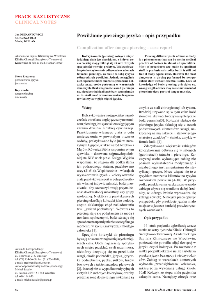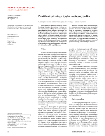 PRACE KAZUISTYCZNE CLINICAL NOTES Jan NIENARTOWICZ Michał SZYDŁO Maciej KIELAN Powikłanie piercingu języka - opis przypadku Complication after tongue piercing – case report Akademicki Szpital Kliniczny we Wrocławiu Klinika Chirurgii Szczękowo-Twarzowej Kierownik: dr hab. n. med. Hanna Gerber Słowa kluczowe: przekłuwanie języka jama ustna Key words: tongue piercing oral cavity Kolczykowanie (piercing) różnych miejsc ludzkiego ciała jest zjawiskiem, z którym coraz częściej mogą zetknąć się lekarze różnych specjalności w swojej praktyce. Większość zabiegów kolczykowania odbywa się w salonach tatuażu i piercingu, co niesie za sobą ryzyko różnorodnych powikłań. Jednak szczególnie niebezpieczne może okazać się założenie kolczyka przez osobę postronną w warunkach domowych. Brak znajomości zasad piercingu np. nieodpowiednia długość tzw. sztangi może m. in. skutkować przemieszczeniem fragmentów kolczyka w głąb mięśni języka. Wstęp Adres do korespondencji: Klinika Chirurgii Szczękowo-Twarzowej ul. Borowska 213, Wrocław tel. (71) 734-36-00, fax. (71) 734-3609, e-mail: [email protected] Autor odpowiedzialny za korespondencję: Michał Szydło ul. Poleska 29/37, 51-354 Wrocław tel. 696 114 656 e-mail: [email protected] 56 Kolczykowanie swojego ciała (współcześnie określane anglojęzycznym terminem piercing) jest zjawiskiem sięgającym zarania dziejów ludzkiej cywilizacji. Przekłuwanie własnego ciała w celu umieszczenia w powstałym otworze ozdoby, praktykowane było już w starożytnym Egipcie, a także wśród Azteków i Majów. Również Biblia wspomina o tym zjawisku – datowana najprawdopodobniej na XIV wiek p.n.e. Księga Wyjścia wspomina, że sługom dla podkreślenia ich podrzędnego statusu, przekłuwano uszy (21:5-6). Współcześnie – w krajach wysokorozwiniętych - kolczykowanie ciała praktykowane jest w celu podkreślenia własnej indywidualności, bądź przeciwnie - aby zaznaczyć swoją przynależność do określonej subkultury, czy grupy społecznej. Niektórzy z praktykujących piercing określają kolczyki jako ozdobę, często deklarując chęć naśladowania tzw. „gwiazd popkultury”. Wówczas to piercing staje się podążaniem za modą i trendami społecznymi, bądź też staje się sposobem na upamiętnienie szczególnego momentu w życiu (zazwyczaj) młodego człowieka [1]. Specjalne kolczyki do piercingu bywają noszone w najróżniejszych miejscach ciała. Obok najczęściej spotykanych miejsc przekłuć, czyli uszu i nosa, niektórzy decydują się na przekłucie wargi, okolic podbródka, języka, języczka podniebienia, pępka, sutków, łuków brwiowych a także narządów płciowych [2]. Inaczej niż w wypadku tradycyjnych złotych lub srebrnych kolczyków, ozdoby przeznaczone do piercingu wykonane są Piercing different parts of human body is a phenomenon that can be met in medical practice of doctors in almost all specialities. Most of procedures are made by qualified stuff in professional studios but it is still not free of many typical risks. However the most dangerous is pircing performed by nonqualified stuff without essential skills. Lack of knowledge of basic piercing principles ex. wrong length of stick may cause movement of pierce into deep parts of tongue muscles. zwykle ze stali chirurgicznej lub tytanu. Rzadziej używane są w tym celu: kość słoniowa, drewno, tworzywa syntetyczne bądź ceramika[3]. Kolczyki służące do piercingu języka składają się z trzech podstawowych elementów: sztagi, nakręcanej na nią nakrętki i stanowiącego właściwą „ozdobę” – ćwieka, zwykle w formie kulki [4]. Zdecydowana większość zabiegów kolczykowania odbywa się w salonach (gabinetach) tatuażu i piercingu. Zazwyczaj osoba wykonująca zabieg nie posiada wykształcenia medycznego i niezbędnego instrumentarium do sterylizacji sprzętu. Może wiązać się to z ryzykiem narażenia klientów na ryzyko różnorakich powikłań [4-18]. W przypadku przekłuwania języka zazwyczaj do zabiegu używa się wenflonu dużej średnicy, w którego światło wprowadza się sztangę (ćwiek). Niniejsza praca opisuje przypadek, gdy przekłucie języka miało miejsce w jeszcze bardziej prowizorycznych warunkach. Opis przypadku 16-letnia pacjentka zgłosiła się wraz z matką na ostry dyżur do Kliniki Chirurgii Szczękowo-Twarzowej Akademickiego Szpitala Klinicznego we Wrocławiu, ponieważ nie potrafiła zdjąć tkwiącej w języku części kolczyka. Po rozmowie z matką pacjentki okazało się, że nastolatka przekuła język bez zgody i wiedzy rodziców. Zabieg w warunkach domowych wykonała „przedsiębiorcza” koleżanka, inkasując za wykonaną usługę kwotę 10zł! Kolczyk ze stopu niklu pacjentka zakupiła sama. Nastający obrzęk oraz OSTRY DYŻUR 2012 • tom 5 • numer 3-4 Rycina 1 zbyt mała długość tzw. sztangi kolczyka spowodowały wciągnięcie kolczyka w obręb mięśni języka. Pomimo odkręcenia nakrętki pacjentka nie była w stanie usunąć całości ozdoby. Kiedy pojawiły się problemy ze zdjęciem kolczyka, nastolatka początkowo próbowała ten fakt ukryć przed rodzicami z obawy o ich reakcję. Kiedy pozostawiona w tkankach ozdoba zaczęła wywoływać ból i obrzęk języka, zdesperowana dziewczyna wyznała matce prawdę. Ta - nie namyślając się długo - zgłosiła się do swojego lekarza rodzinnego, który skierował nastolatkę na tutejszy ostry dyżur. Klinicznie w jamie ustnej można było zaobserwować niewielki obrzęk języka. Widoczna była jedynie górna część ozdoby – kulisty ćwiek. Natomiast otwór na spodniej części języka uległ całkowitemu zamknięciu i wygojeniu, przy jednoczesnym wnicowaniu nakrętki w obręb tkanek języka – z tej przyczyny pacjentka nie była w stanie wyjąć kulistej części kolczyka (rycina 1-2). Po wdrożeniu antybiotykoterapii, przystąpiono do zabiegu: w znieczuleniu miejscowym nasiękowym (Bupivacaina z