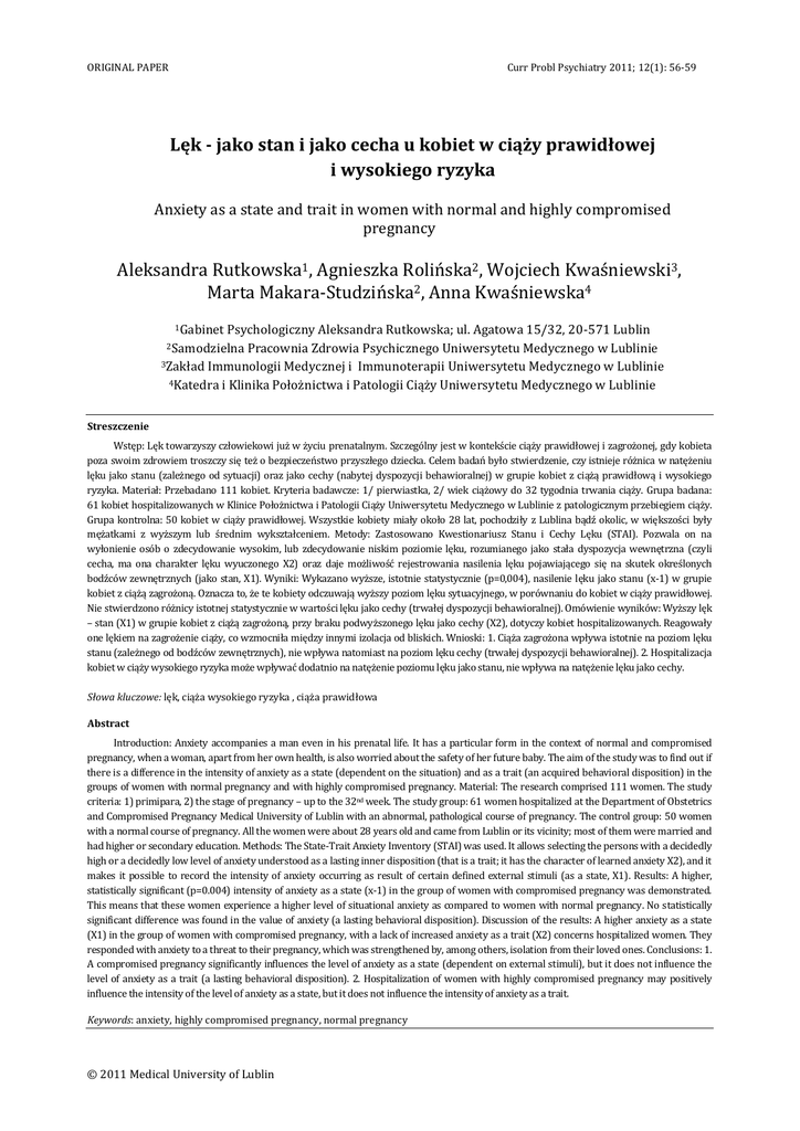 ORIGINAL PAPER Curr Probl Psychiatry 2011; 12(1): 56-59 Lęk - jako stan i jako cecha u kobiet w ciąży prawidłowej i wysokiego ryzyka Anxiety as a state and trait in women with normal and highly compromised pregnancy Aleksandra Rutkowska1, Agnieszka Rolińska2, Wojciech Kwaśniewski3, Marta Makara-Studzińska2, Anna Kwaśniewska4 1Gabinet Psychologiczny Aleksandra Rutkowska; ul. Agatowa 15/32, 20-571 Lublin Pracownia Zdrowia Psychicznego Uniwersytetu Medycznego w Lublinie 3Zakład Immunologii Medycznej i Immunoterapii Uniwersytetu Medycznego w Lublinie 4Katedra i Klinika Położnictwa i Patologii Ciąży Uniwersytetu Medycznego w Lublinie 2Samodzielna Streszczenie Wstęp: Lęk towarzyszy człowiekowi już w życiu prenatalnym. Szczególny jest w kontekście ciąży prawidłowej i zagrożonej, gdy kobieta poza swoim zdrowiem troszczy się też o bezpieczeństwo przyszłego dziecka. Celem badań było stwierdzenie, czy istnieje różnica w natężeniu lęku jako stanu (zależnego od sytuacji) oraz jako cechy (nabytej dyspozycji behawioralnej) w grupie kobiet z ciążą prawidłową i wysokiego ryzyka. Materiał: Przebadano 111 kobiet. Kryteria badawcze: 1/ pierwiastka, 2/ wiek ciążowy do 32 tygodnia trwania ciąży. Grupa badana: 61 kobiet hospitalizowanych w Klinice Położnictwa i Patologii Ciąży Uniwersytetu Medycznego w Lublinie z patologicznym przebiegiem ciąży. Grupa kontrolna: 50 kobiet w ciąży prawidłowej. Wszystkie kobiety miały około 28 lat, pochodziły z Lublina bądź okolic, w większości były mężatkami z wyższym lub średnim wykształceniem. Metody: Zastosowano Kwestionariusz Stanu i Cechy Lęku (STAI). Pozwala on na wyłonienie osób o zdecydowanie wysokim, lub zdecydowanie niskim poziomie lęku, rozumianego jako stała dyspozycja wewnętrzna (czyli cecha, ma ona charakter lęku wyuczonego X2) oraz daje możliwość rejestrowania nasilenia lęku pojawiającego się na skutek określonych bodźców zewnętrznych (jako stan, X1). Wyniki: Wykazano wyższe, istotnie statystycznie (p=0,004), nasilenie lęku jako stanu (x-1) w grupie kobiet z ciążą zagrożoną. Oznacza to, że te kobiety odczuwają wyższy poziom lęku sytuacyjnego, w porównaniu do kobiet w ciąży prawidłowej. Nie stwierdzono różnicy istotnej statystycznie w wartości lęku jako cechy (trwałej dyspozycji behawioralnej). Omówienie wyników: Wyższy lęk – stan (X1) w grupie kobiet z ciążą zagrożoną, przy braku podwyższonego lęku jako cechy (X2), dotyczy kobiet hospitalizowanych. Reagowały one lękiem na zagrożenie ciąży, co wzmocniła między innymi izolacja od bliskich. Wnioski: 1. Ciąża zagrożona wpływa istotnie na poziom lęku stanu (zależnego od bodźców zewnętrznych), nie wpływa natomiast na poziom lęku cechy (trwałej dyspozycji behawioralnej). 2. Hospitalizacja kobiet w ciąży wysokiego ryzyka może wpływać dodatnio na natężenie poziomu lęku jako stanu, nie wpływa na natężenie lęku jako cechy. Słowa kluczowe: lęk, ciąża wysokiego ryzyka , ciąża prawidłowa Abstract Introduction: Anxiety accompanies a man even in his prenatal life. It has a particular form in the context of normal and compromised pregnancy, when a woman, apart from her own health, is also worried about the safety of her future baby. The aim of the study was to find out if there is a difference in the intensity of anxiety as a state (dependent on the situation) and as a trait (an acquired behavioral disposition) in the groups of women with normal pregnancy and with highly compromised pregnancy. Material: The research comprised 111 women. The study criteria: 1) primipara, 2) the stage of pregnancy – up to the 32nd week. The study group: 61 women hospitalized at the Department of Obstetrics and Compromised Pregnancy Medical University of Lublin with an abnormal, pathological course of pregnancy. The control group: 50 women with a normal course of pregnancy. All the women were about 28 years old and came from Lublin or its vicinity; most of them were married and had higher or secondary education. Methods: The State-Trait Anxiety Inventory (STAI) was used. It allows selecting the persons with a decidedly high or a decidedly low level of anxiety understood as a lasting inner disposition (that is a trait; it has the character of learned anxiety X2), and it makes it possible to record the intensity of anxiety occurring as result of certain defined external stimuli (as a state, X1). Results: A higher, statistically significant (p=0.004) intensity of anxiety as a state (x-1) in the group of women with compromised pregnancy was demonstrated. This means that these women experience a higher level of situational anxiety as compared to women with normal pregnancy. No statistically significant difference was found in the value of anxiety (a lasting behavioral disposition). Discussion of the results: A higher anxiety as a state (X1) in the group of women with compromised pregnancy, with a lack of increased anxiety as a trait (X2) concerns hospitalized women. They responded with anxiety to a threat to their pregnancy, which was strengthened by, among others, isolation from their loved ones. Conclusions: 1. A compromised pregnancy significantly influences the level of anxiety as a state (dependent on external stimuli), but it does not influence the level of anxiety as a trait (a lasting behavioral disposition). 2. Hospitalization of women with highly compromised pregnancy may positively influence the intensity of the level of anxiety as a state, but it does not influence the intensity of anxiety as a trait. Keywords: anxiety, highly compromised pregnancy, normal pregnancy © 2011 Medical University of Lublin Lęk - jako stan i jako cecha u kobiet w ciąży prawidłowej i wysokiego ryzyka 57 Wstęp Lęk to emocja towarzysząca człowiekowi przez całe życie, również w życiu prenatalnym. Sam fakt ciąży, zwłaszcza pierwszej, jest dla kobiety zupełnie nową sytuacją i może wywoływać l