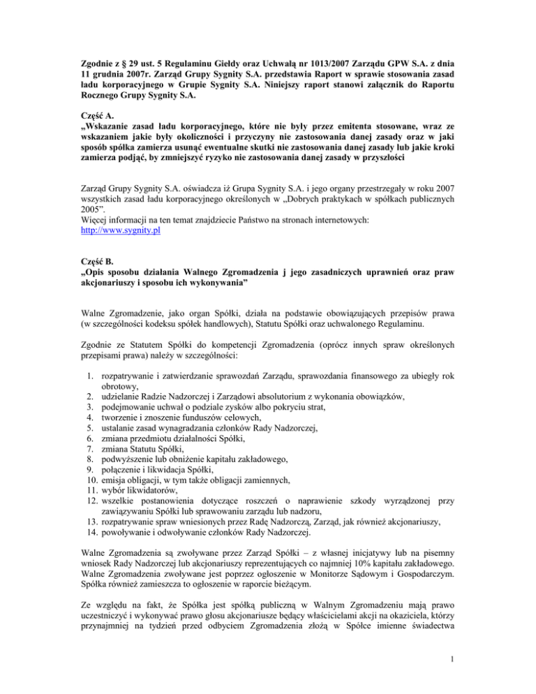 Zgodnie z § 29 ust. 5 Regulaminu Giełdy oraz Uchwałą nr 1013/2007 Zarządu GPW S.A. z dnia 11 grudnia 2007r. Zarząd Grupy Sygnity S.A. przedstawia Raport w sprawie stosowania zasad ładu korporacyjnego w Grupie Sygnity S.A. Niniejszy raport stanowi załącznik do Raportu Rocznego Grupy Sygnity S.A. Część A. „Wskazanie zasad ładu korporacyjnego, które nie były przez emitenta stosowane, wraz ze wskazaniem jakie były okoliczności i przyczyny nie zastosowania danej zasady oraz w jaki sposób spółka zamierza usunąć ewentualne skutki nie zastosowania danej zasady lub jakie kroki zamierza podjąć, by zmniejszyć ryzyko nie zastosowania danej zasady w przyszłości Zarząd Grupy Sygnity S.A. oświadcza iŜ Grupa Sygnity S.A. i jego organy przestrzegały w roku 2007 wszystkich zasad ładu korporacyjnego określonych w „Dobrych praktykach w spółkach publicznych 2005”. Więcej informacji na ten temat znajdziecie Państwo na stronach internetowych: http://www.sygnity.pl Część B. „Opis sposobu działania Walnego Zgromadzenia j jego zasadniczych uprawnień oraz praw akcjonariuszy i sposobu ich wykonywania” Walne Zgromadzenie, jako organ Spółki, działa na podstawie obowiązujących przepisów prawa (w szczególności kodeksu spółek handlowych), Statutu Spółki oraz uchwalonego Regulaminu. Zgodnie ze Statutem Spółki do kompetencji Zgromadzenia (oprócz innych spraw określonych przepisami prawa) naleŜy w szczególności: 1. rozpatrywanie i zatwierdzanie sprawozdań Zarządu, sprawozdania finansowego za ubiegły rok obrotowy, 2. udzielanie Radzie Nadzorczej i Zarządowi absolutorium z wykonania obowiązków, 3. podejmowanie uchwał o podziale zysków albo pokryciu strat, 4. tworzenie i znoszenie funduszów celowych, 5. ustalanie zasad wynagradzania członków Rady Nadzorczej, 6. zmiana przedmiotu działalności Spółki, 7. zmiana Statutu Spółki, 8. podwyŜszenie lub obniŜenie kapitału zakładowego, 9. połączenie i likwidacja Spółki, 10. emisja obligacji, w tym takŜe obligacji zamiennych, 11. wybór likwidatorów, 12. wszelkie postanowienia dotyczące roszczeń o naprawienie szkody wyrządzonej przy zawiązywaniu Spółki lub sprawowaniu zarządu lub nadzoru, 13. rozpatrywanie spraw wniesionych przez Radę Nadzorczą, Zarząd, jak równieŜ akcjonariuszy, 14. powoływanie i odwoływanie członków Rady Nadzorczej. Walne Zgromadzenia są zwoływane przez Zarząd Spółki – z własnej inicjatywy lub na pisemny wniosek Rady Nadzorczej lub akcjonariuszy reprezentujących co najmniej 10% kapitału zakładowego. Walne Zgromadzenia zwoływane jest poprzez ogłoszenie w Monitorze Sądowym i Gospodarczym. Spółka równieŜ zamieszcza to ogłoszenie w raporcie bieŜącym. Ze względu na fakt, Ŝe Spółka jest spółką publiczną w Walnym Zgromadzeniu mają prawo uczestniczyć i wykonywać prawo głosu akcjonariusze będący właścicielami akcji na okaziciela, którzy przynajmniej na tydzień przed odbyciem Zgromadzenia złoŜą w Spółce imienne świadectwa 1 depozytowe, wystawione przez podmiot prowadzący rachunek papierów wartościowych, i nie odbiorą ich przed zakończeniem Zgromadzenia. Uchwały Walnego Zgromadzenia zapadają zwykłą większością głosów oddanych przez akcjonariuszy obecnych na Walnym Zgromadzeniu zgodnie z zasadami określonymi w Statucie i kodeksie spółek handlowych. KaŜda akcja daje na Walnym Zgromadzeniu prawo do jednego głosu. śaden akcjonariusz, w połączeniu z podmiotami od niego zaleŜnymi lub w stosunku do niego dominującymi, w rozumieniu Ustawy z dnia 29 lipca 2005 roku o ofercie publicznej i warunkach wprowadzania instrumentów finansowych do zorganizowanego systemu obrotu oraz o spółkach publicznych, jak równieŜ w połączeniu z innymi podmiotami, w porozumieniu z którymi nabywał akcje, a takŜe w połączeniu z innymi podmiotami, o których mowa w art. 87 ust. 1 i 2 powołanej powyŜej Ustawy, nie moŜe na Walnym Zgromadzeniu Akcjonariuszy wykonywać prawa głosu z więcej niŜ 20% ogólnej liczby akcji spółki. Głosy oddane na Walnym Zgromadzeniu z naruszeniem ograniczenia przewidzianego w niniejszym ustępie uznaje się za nie oddane. Na potrzeby ustalenia ograniczeń, o których mowa, kwity depozytowe wystawione w związku z akcjami Spółki uwaŜa się za akcje Spółki uprawniające do wykonywania prawa głosu w takiej liczbie, jaką posiadacz kwitu depozytowego moŜe uzyskać w wyniku zamiany kwitów depozytowych na akcje Spółki. Ograniczenie wskazane powyŜej nie dotyczy akcjonariuszy, którzy w dniu głosowania posiadać będą we własnym imieniu ponad 51% ogólnej liczby akcji Spółki i którzy uprzednio dokonali wezwania do sprzedaŜy im wszystkich akcji Spółki w trybie określonym w przepisach Ustawy o ofercie publicznej i warunkach wprowadzania instrumentów finansowych do zorganizowanego systemu obrotu oraz o spółkach publicznych. W wypadku określonym w art. 397 Kodeksu Spółek Handlowych, uchwała o rozwiązaniu Spółki wymaga większości 3/4 oddanych głosów. Podjęcie uchwały w sprawie odwołania członków Rady Nadzorczej powołanych przez Walne Zgromadzenie wymaga uchwały podjętej zwykłą większością głosów oddanych, z tym Ŝe za uchwałą musi głosować nie mniej niŜ 20% ogólnej liczby akcji Spółki z tym, Ŝe odwołanie członka Rady na jego wniosek wymaga uchwały podjętej zwykłą większością głosów oddanych Nabycie i zbycie nieruchomości lub udziału w nieruchomości nie wymagają uchwały Walnego Zgromadzenia, o której mowa w art. 393 pkt 4 Kodeksu Spółek Handlowych. W takim przypadku wymagane jest jedynie uzyskanie zgody Rady Nadzorczej wyraŜonej w formie uchwały podjętej większością 3/4 głosów członków Rady Nadzorczej obecnych na posiedzeniu, w obecności co najmniej połowy liczby członków Rady Nadzorczej. Część C. „Skład Osobowy i Zasady Działania Organów Zarządzających i Nadzorczych Spółki oraz ich komitetów”. Z