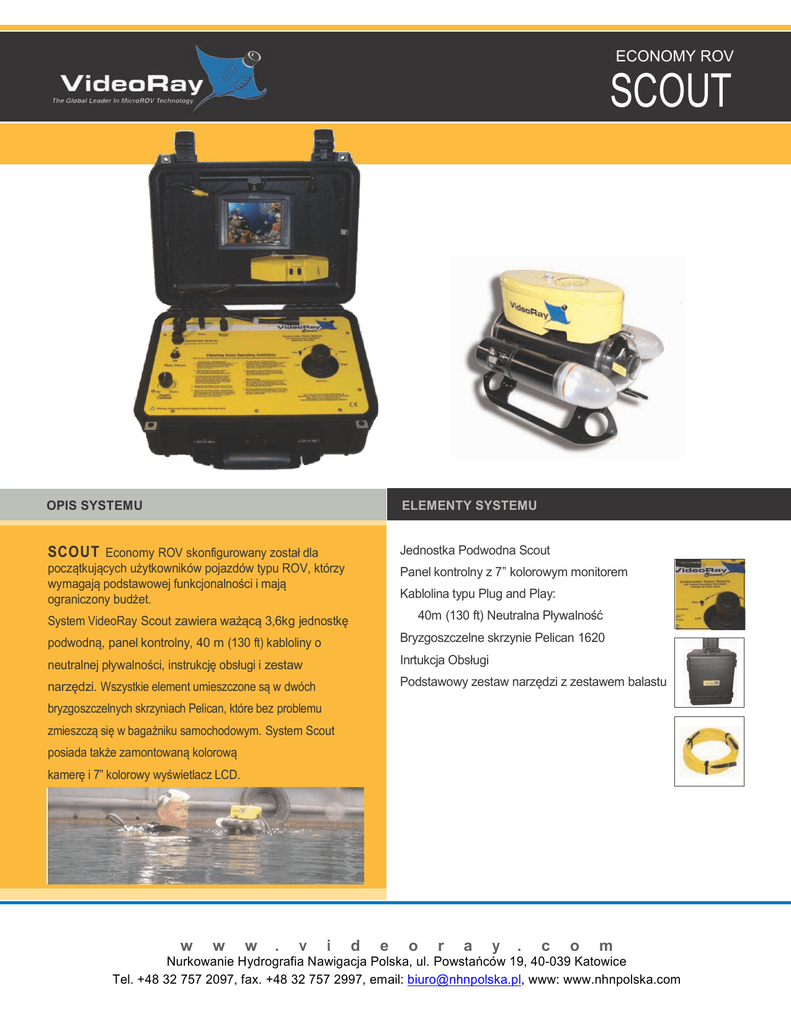 ECONOMY ROV SCOUT OPIS SYSTEMU ELEMENTY SYSTEMU SCOUT Economy ROV skonfigurowany został dla Jednostka Podwodna Scout początkujących użytkowników pojazdów typu ROV, którzy wymagają podstawowej funkcjonalności i mają ograniczony budżet. Panel kontrolny z 7” kolorowym monitorem System VideoRay Scout zawiera ważącą 3,6kg jednostkę 40m (130 ft) Neutralna Pływalność Kablolina typu Plug and Play: podwodną, panel kontrolny, 40 m (130 ft) kabloliny o Bryzgoszczelne skrzynie Pelican 1620 neutralnej pływalności, instrukcję obsługi i zestaw Inrtukcja Obsługi narzędzi. Wszystkie element umieszczone są w dwóch Podstawowy zestaw narzędzi z zestawem balastu bryzgoszczelnych skrzyniach Pelican, które bez problemu zmieszczą się w bagażniku samochodowym. System Scout posiada także zamontowaną kolorową kamerę i 7” kolorowy wyświetlacz LCD. w w w . v i d e o r a y . c o m Nurkowanie Hydrografia Nawigacja Polska, ul. Powstańców 19, 40-039 Katowice Tel. +48 32 757 2097, fax. +48 32 757 2997, email: [email protected], www: www.nhnpolska.com SPECYFIKACJA SYSTEMU Specyfikacja Ogólna Zasilanie Całkowita waga systemu Skrzynie Instrukcja Obsługi Zestaw narzędzi Gwarancja 800 W, 100-240 VAC 32 kg Dwie bryzgoszczelne skrzynie Pelican Wersja papierowa i multimedialna Podstawowy zestaw narzędzi 2 lata Jednostka podwodna Głębokość max. 76 m Wymiary 30.5, 23, 21 cm Waga 3.6 kg Bez zestawu balastowego Balast System balastowy bez narzędzi Napęd Poziomy Kamera Główna Czułość Kąt widzenia Oświetlenie Panel kontrolny Wymiary Waga Wyświetlacz Kontroler Wyjście Video Prędkość max. 1.9 węzła 2 silniki Napęd przekładniowy Śmigła 50mm NTSC lub PAL Przednia – zamontowana w kadłubie. Szeroki kąt widzenia – zoptymalizowany do prac podwodnych. Rozdzielczość 420 linii. 0.3 lux 90° Horizontal/140° Diagonal (2) x 20W Lampy Halogenowe Zmienna intensywność 40.6, 33, 16.5 cm 6.8 kg 7” kolorowy Zintegrowany joystick i pokrętło regulacji głębokości Analogowe Kablolina 40 m Plug and Play 8mm średnicy, 454 kg wytrzymałość na rozerwanie Bęben Dostępny jako upgrade lub standard w modelu Scout X3. Akcesoria Dodatkowe Dla systemów Scout i Scout X3 akcesoria dodatkowe są niedostepne. Pionowy 1 Silnik Przekładniowy Śmigło 45mm
