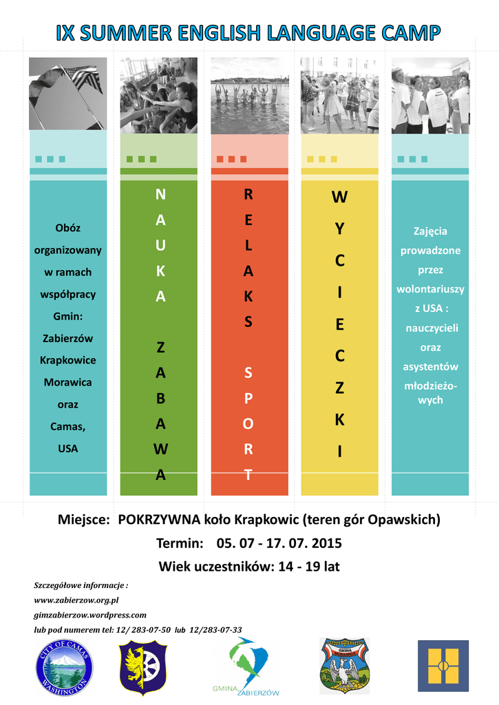 Kliknij, aby dodać zdjęcie Kliknij, aby dodać zdjęcie Kliknij, aby dodać zdjęcie Kliknij, aby dodać zdjęcie N R W Obóz A E organizowany U L Y w ramach K A współpracy A K I S E Gmin: Zabierzów Krapkowice Z C Zajęcia prowadzone przez wolontariuszy z USA : C A S oraz B P Camas, A O K USA W R I A T Morawica Kliknij, aby dodać zdjęcie Z nauczycieli oraz asystentów młodzieżowych Miejsce: POKRZYWNA koło Krapkowic (teren gór Opawskich) Termin: 05. 07 - 17. 07. 2015 Wiek uczestników: 14 - 19 lat Szczegółowe informacje : www.zabierzow.org.pl gimzabierzow.wordpress.com lub pod numerem tel: 12/ 283-07-50 lub 12/283-07-33