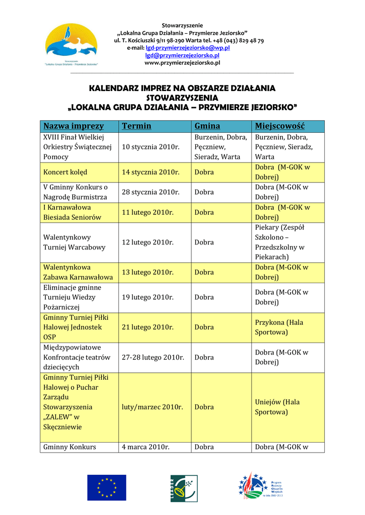 Stowarzyszenie „Lokalna Grupa Działania – Przymierze Jeziorsko” ul. T. Kościuszki 9/11 98-290 Warta tel. +48 (043) 829 48 79 e-mail: [email protected] [email protected] www.przymierzejeziorsko.pl _________________________________________________________________________ KALENDARZ IMPREZ NA OBSZARZE DZIAŁANIA STOWARZYSZENIA „LOKALNA GRUPA DZIAŁANIA – PRZYMIERZE JEZIORSKO” Nazwa imprezy Termin Gmina Miejscowość XVIII Finał Wielkiej Orkiestry Świątecznej Pomocy 10 stycznia 2010r. Burzenin, Dobra, Pęczniew, Sieradz, Warta Koncert kolęd 14 stycznia 2010r. Dobra 28 stycznia 2010r. Dobra 11 lutego 2010r. Dobra 12 lutego 2010r. Dobra 13 lutego 2010r. Dobra Burzenin, Dobra, Pęczniew, Sieradz, Warta Dobra (M-GOK w Dobrej) Dobra (M-GOK w Dobrej) Dobra (M-GOK w Dobrej) Piekary (Zespół Szkolono – Przedszkolny w Piekarach) Dobra (M-GOK w Dobrej) 19 lutego 2010r. Dobra Dobra (M-GOK w Dobrej) 21 lutego 2010r. Dobra Przykona (Hala Sportowa) 27-28 lutego 2010r. Dobra Dobra (M-GOK w Dobrej) luty/marzec 2010r. Dobra Uniejów (Hala Sportowa) 4 marca 2010r. Dobra Dobra (M-GOK w V Gminny Konkurs o Nagrodę Burmistrza I Karnawałowa Biesiada Seniorów Walentynkowy Turniej Warcabowy Walentynkowa Zabawa Karnawałowa Eliminacje gminne Turnieju Wiedzy Pożarniczej Gminny Turniej Piłki Halowej Jednostek OSP Międzypowiatowe Konfrontacje teatrów dziecięcych Gminny Turniej Piłki Halowej o Puchar Zarządu Stowarzyszenia „ZALEW” w Skęczniewie Gminny Konkurs Stowarzyszenie „Lokalna Grupa Działania – Przymierze Jeziorsko” ul. T. Kościuszki 9/11 98-290 Warta tel. +48 (043) 829 48 79 e-mail: [email protected] [email protected] www.przymierzejeziorsko.pl _________________________________________________________________________ Recytatorski I eliminacje – Turniej Gminny Jednostek OSP i Samorządów Mieszkańców II eliminacje – Turniej Gminny Jednostek OSP i Samorządów Mieszkańców III eliminacje – Turniej Gminny Jednostek OSP i Samorządów Mieszkańców Finał Turnieju Gminnego Jednostek OSP i Samorządów Mieszkańców VI Przegląd Nadwarciańskich Wiejskich Zespół Śpiewaczych Brzeg 2010 Regaty żeglarskie w klasie 420 i l’equipe Festyn Rodzinny Przedszkola Samorządowego w Dobrej Festyn majowy 219 Rocznica Konstytucji 3 Maja – akademia Gminny Dzień Strażaka Festyn Rodzinny Dobrej) 7 marca 2010r. Dobra Żeronice (Strażnica OSP) 14 marca 2010r. Dobra Miłkowice (Strażnica OSP) 21 marca 2010r. Dobra Linne (Strażnica OSP) 11 kwietnia 2010r. Dobra Dobra (Zespół Szkół Publicznych w Dobrej) 25 kwietnia 2010r. Pęczniew Brzeg 25 kwietnia 2010r. Pęczniew Wylazłów 1 maja 2010r. Dobra Dobra (Stadion Miejsko-Gminny w Dobrej) 2 maja 2010r. Warta Warta (Amfiteatr miejski) 3 maja 2010r. Dobra Dobra (M-GOK w Dobrej) 9 maja 2010r. Dobra Piekary (OSP) Dobra Piekary (Plac Zespołu SzkolnoPrzedszkolnego w 23 maja 2010r. Stowarzyszenie „Lokalna Grupa Działania – Przymierze Jeziorsko” ul. T. Kościuszki 9/11 98-290 Warta tel. +48 (043) 829 48 79 e-mail: [email protected] [email protected] www.przymierzejeziorsko.pl _________________________________________________________________________ Szkolny Festyn RekreacyjnoSportowy Powiatowy Konkurs Przedszkolaków „Śpiewam i maluję” Święto Szkoły Podstawowej w Warcie Puchar Polski w Windsurfingu „Jeziorsko 2010” V Rajd Ekologiczny „Nadwarciański Szlak” VI Ogólnopolski Turniej Siatkówki Plażowej Nocą Happening profilaktyczny „Bezpieczna i przyjazna szkoła” Wystawa w Skansenie Turniej Sportowo – Fantowy Sobótki w Niechmirowie Dni Warty XIX Dni Dobrej Wieczór Kupały Biesiada z okazji Dnia Matki Obchody 100 Lecia OSP Pęczniew Turniej Szóstek o Piekarach) Dobra (Plac Zespołu Szkół Publicznych w Dobrej) 29-30 maja 2010r. Dobra maj 2010r. Dobra Dobra (M-GOK w Dobrej) maj 2010r. Warta Warta (Amfiteatr miejski) maj 2010r. Dobra Kościanki (Ośrodek „Rafa”) maj 2010r. Burzenin Strumiany (GOSiR) maj/czerwiec 2010r. Burzenin Strumiany (GOSiR) czerwiec 2010r. Warta Warta (Amfiteatr miejski) 6 czerwiec 2010r. Sieradz Sieradz (Skansen) 20 czerwca 2010r. Dobra Rzechta (OSP) 23 czerwca 2010r. Burzenin Niechmirów Zamoście Warta Warta 26-27 czerwca 2010r. 26-27 czerwca 2010r. Dobra Dobra (Plac za MGOK w Dobrej) Mikulice i M-GOK W Dobrej czerwiec 2010r. Dobra czerwiec 2010r. Pęczniew Lubola czerwiec 2010r. Pęczniew Pęczniew Czerwiec/lipiec Dobra Dobra (Stadion Stowarzyszenie „Lokalna Grupa Działania – Przymierze Jeziorsko” ul. T. Kościuszki 9/11 98-290 Warta tel. +48 (043) 829 48 79 e-mail: [email protected] [email protected] www.przymierzejeziorsko.pl _________________________________________________________________________ Puchar Lata 2010r. Gminne Zawody Sportowo-Pożarnicze 4 lipca 2010r. Dobra Zabawa i loteria fantowa 18 lipca 2010r. Dobra Święto „Plinzy” 25 lipca 2010r. Dobra lipiec 2010r. Warta Zaspy Miłkowskie lipiec 2010r. Dobra Mikulice (Boisko) lipiec 2010r. Burzenin Strumiany (GOSiR) lipiec 2010r. Pęczniew Wylazłów lipiec/sierpień 2010r. Dobra Boiska na terenie Gminy Dobra 7 sierpnia 2010r. Dobra 15 sierpnia 2010r. Dobra 15 sierpnia 2010r. Dobra Rzechta (Plac przy Strażnicy OSP) Festyn Bluesowy 18 sierpnia 2010r. Warta Warta (Amfiteatr miejski) Dożynki Gminne Dożynki Gminne Dożynki Gminne, Festyn –Rekreacyjno Sportowy „Eko – Tour” Dożynki Gminne 22 sierpnia 2010r. sierpień 2010r. Dobra Pęczniew Pęczniew sierpień 2010r. Burzenin Strumiany (GOSiR) sierpień 2010r. Warta Regaty o Błękitną Wstęgę Zalewu Jeziorsko Turniej Piłki Nożnej oraz loteria fantowa Ogólnopolski Turniej Siatkówki Plażowej dla Oldboyów Bieg nad Jeziorskiem Gminna Liga Amatorskich Drużyn w Piłce Nożnej Festyn Sportowy Zabawa i loteria fantowa Parafialny Festyn Sportowy dla dzieci i młodzieży o Puchar Sołtysa Miejsko-Gminny w Dobrej) Stadion MiejskoGminny w Dobrej – OSP Żeronice Rzymsko (Strażnica OSP) Rzechta (Strażnica OSP) Piekary (Plac przy Strażnicy OSP) Strac