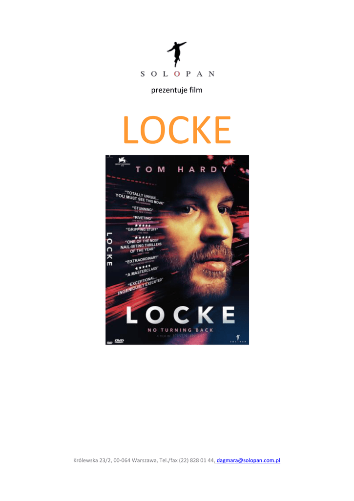 prezentuje film LOCKE Królewska 23/2, 00-064 Warszawa, Tel./fax (22) 828 01 44, [email protected] SYNOPSIS Od dawna oczekiwany, film brytyjskiego scenarzysty i reżysera Stevena Knighta (Koliber) Oparty na oryginalnym scenariuszu nominowanego do Oscara Knighta (Eastern Promises, Dirty Pretty Things) i wyprodukowany przez nominowanego do Oscara Paula Webstera (Anna Karenina, Salmon Fishing in The Yemen, Eastern Promises, Atonement) i Guy Heeley (Hummingbird) z londyoskiej firmy Shoebox. LOCKE to historia jednego człowieka, który przez 90 minut trzymającego w napięciu filmu, zmagając się z czasem, rozwiązuje sprawy wydające się nie do rozwiązania. Ivan Locke ma idealną rodzinę, świetną pracę, a następnego dnia ma nastąpid ukoronowanie jego kariery zawodowej. Jeden telefon zmusza go do podjęcia decyzji która stawia wszystko na jednej szali. LOCKE to wyjątkowy film , który dosłownie wciska w fotel. LOCKE przykuwa uwagę dramatyczną ludzką historią o tym jak życie jednego człowieka bezpowrotnie się zmienia w ciągu jednej nocy jadąc samochodem z Birmingham do Londynu. W trakcie jazdy, Ivan wykonuje kilka druzgocących telefonów do swojej żony Katriny (Ruth Wilson) i dwóch synów (Tom Holland i Bill Milner). Ivan musi też poradzid sobie z telefonami od Bethan, kobiety z którą kiedyś pracował i telefonami z pracy, w tym od swojego szefa Garetha (Ben Daniels), który niechętnie, ale go zwalnia z pracy i od Donala (Andrew Scott), kolegi z pracy, który ma go zastąpid w najważniejszym wyzwaniu zawodowym, którego miał się podjąd Ivan. W świetnych rolach drugoplanowych wystąpili, zdobywca nagrody BAFTA Andrew Scott znany z roli w serialu BBC, Sherlock i renomowany aktor telewizyjny I teatralny, Ben Daniels (Domek z Kart). Synów Ivana grają wschodzące gwiazdy, Tom Holland (The Impossible, How I Live Now) i Bill Milner (Son of Rambow, X Men First Class). KONSTRUKCJA FILMU Akcja filmu LOCKE, w którym gra Tom Hardy jako Ivan Locke, dzieje się w większości w samochodzie. To twarz Ivana widzimy przez cały czas, reszta postaci to głosy które słyszymy w telefonie, czasami zabawne, czasami rozgniewane. Tło tworzą światła samochodów na autostradzie, którą jedzie bohater filmu, oświetlają twarz Ivana jak i ‘demonów’ z którymi walczy. Scenarzysta i reżyser Steven Knight zaczął rozważad naturę filmowania od debiutu reżyserskiego Koliber pod koniec 2012 roku. “Zastanawiałem się czy mogę cały proces sprowadzid do podstaw, wyjaśnia Knight. “Celem jest zebranie ludzi w sali, zgasid światło i przekonad ich do oglądania oraz Królewska 23/2, 00-064 Warszawa, Tel./fax (22) 828 01 44, [email protected] zaangażowania w to co jest na ekranie. Pomysł zainspirowany był sfilmowanymi scenami, które Knight robił do filmu Koliber, były to sceny z jadącego samochodu. “To było fascynujące” przypomina sobie Knight. “Miasta i drogi nocą są piękne, mogę je obserwowad godzinami. Zacząłem się zastanawiad nad historią która miałaby miejsce właśnie w samochodzie” Knight miał na myśli tylko Toma Hardy do roli Ivana Locke i jego precyzyjna gra wynagrodziła te nadzieje. “Tom jak tylko znajdzie się w oku kamery zaraz przyciąga uwagę” mówi Knight. “ Jego złożonośd reakcji i emocji jest genialna. Panuje nad tym jeżeli trzeba i wyzwala jeżeli trzeba. Jest znakomity.” PODSTAWOWE INFORMACJE LOCKE Występują: Tom Hardy Ruth Wilson, Olivia Colman, Andrew Scott, Tom Holland, Bill Milner Scenariusz I Reżyseria Steven Knight Producent Paul Webster Guy Heeley Executive producers Stuart Ford, David Jourdan, Steven Squillante,Joe Wright Zdjęcia: Haris Zambarloukos Dystrybucja: SOLOPAN Data premiery : 11 kwietnia 2014 Królewska 23/2, 00-064 Warszawa, Tel./fax (22) 828 01 44, [email protected]