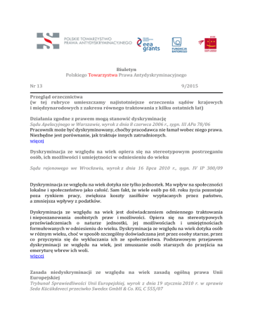 Biuletyn Polskiego Towarzystwa Prawa Antydyskryminacyjnego Nr 13 9/2015 Przegląd orzecznictwa (w tej rubryce umieszczamy najistotniejsze orzeczenia sądów krajowych i międzynarodowych z zakresu równego traktowania z kilku ostatnich lat) Działania zgodne z prawem mogą stanowić dyskryminację Sądu Apelacyjnego w Warszawie, wyrok z dnia 8 czerwca 2006 r., sygn. III APa 78/06 Pracownik może być dyskryminowany, choćby pracodawca nie łamał wobec niego prawa. Niezbędne jest porównanie, jak traktuje innych zatrudnionych. więcej Dyskryminacja ze względu na wiek opiera się na stereotypowym postrzeganiu osób, ich możliwości i umiejętności w odniesieniu do wieku Sądu rejonowego we Wrocławiu, wyrok z dnia 16 lipca 2010 r., sygn. IV IP 300/09 Dyskryminacja ze względu na wiek dotyka nie tylko jednostek. Ma wpływ na społeczności lokalne i społeczeństwo jako całość. Sam fakt, że wiele osób po 60. roku życia pozostaje poza rynkiem pracy, zwiększa koszty zasiłków wypłacanych przez państwo, a zmniejsza wpływy z podatków. Dyskryminacja ze względu na wiek jest doświadczeniem odmiennego traktowania i nieposzanowania osobistych praw i możliwości. Opiera się na stereotypowych przeświadczeniach o naturze jednostki, jej możliwościach i umiejętnościach formułowanych w odniesieniu do wieku. Dyskryminacja ze względu na wiek dotyka osób w różnym wieku, choć w sposób szczególny doświadczana jest przez osoby starsze, przez co przyczynia się do wykluczania ich ze społeczeństwa. Podstawowym przejawem dyskryminacji ze względu na wiek, jest zmuszanie osób starszych do przejścia na emeryturę wbrew ich woli. więcej Zasada niedyskryminacji ze względu na wiek zasadą ogólną prawa Unii Europejskiej Trybunał Sprawiedliwości Unii Europejskiej, wyrok z dnia 19 stycznia 2010 r. w sprawie Seda Kücükdeveci przeciwko Swedex GmbH & Co. KG, C 555/07 Na sądzie krajowym, przed którym zawisł spór między jednostkami, spoczywa obowiązek zagwarantowania przestrzegania zasady niedyskryminacji ze względu na wiek skonkretyzowanej w Dyrektywie Rady 2000/78/WE z dnia 27 listopada 2000 r. ustanawiająca ogólne warunki ramowe równego traktowania w zakresie zatrudnienia i pracy. W razie potrzeby, sąd krajowy powinien odstąpić od stosowania jakichkolwiek sprzecznych z tą zasadą przepisów prawa krajowego, niezależnie od przysługującego mu w wypadkach wskazanych w art. 267 akapit drugi Traktatu o Funkcjonowaniu Unii Europejskiej uprawnienia do zwrócenia się do Trybunału w trybie prejudycjalnym o wykładnię tej zasady. Trybunał stwierdził ponadto, iż zasada niedyskryminacji ze względu na wiek jest zasadą ogólną prawa Unii Europejskiej. więcej Aktualności PTPA Stanowisko PTPA w sprawie weta prezydenta RP do ustawy o uzgodnieniu płci PTPA wyraża ubolewanie i rozczarowanie decyzją prezydenta RP Andrzeja Dudy o zawetowaniu ustawy o uzgodnieniu płci. Ustawa wbrew twierdzeniom Kancelarii Prezydenta RP nie wprowadza żadnych rozwiązań sprzecznych z Konstytucją, a jedynie "cywilizuje" kilkudziesięcioletnią już praktykę sądową w tej kwestii. więcej Nadchodzące wydarzenia Testy dyskryminacyjne jako narzędzie dowodzenia Seminarium będzie poświęcone testom dyskryminacyjnym – nowatorskiej metodzie uprawdopodobniania dyskryminacji, która zdobywa na świecie coraz większą popularność. Dyskryminacja, jako zjawisko jest niezwykle trudna do wykazania, a pozyskanie środków dowodowych na potrzeby np. procesu sądowego jest niejednokrotnie niemożliwe tradycyjnymi metodami. Ważnym zatem jest, aby poszukiwać alternatywnych dróg dowodzenia nierówności. I temu właśnie będzie poświęcone seminarium, na które zaprasza Polskie Towarzystwo Prawa Antydyskryminacyjnego. Uczestnikami seminarium będą prawnicy, przedstawiciele prawnoczłowieczych organizacji pozarządowych, naukowcy oraz przedstawiciele wymiaru sprawiedliwości i innych organów ochrony prawa w Polsce. Swoje prezentacje przedstawią prawnicy – praktycy, Rzecznik Praw Obywatelskich, przedstawiciele rządu, naukowcy, a także organizacje pozarządowe, które zdecydowały się na zastosowanie metody testów dyskryminacyjnych. Seminarium odbędzie się 28 października br. w Warszawie, w siedzibie Fundacji im. S. Batorego, ul. Sapieżyńska 10a. Proszę o potwierdzania swojego uczestnictwa w seminarium do 20 września na adres: [email protected] Forum Różnorodności Polskie Towarzystwo Prawa Antydyskryminacyjnego oraz Stefana Batorego zapraszają na Forum Fundacja im. Różnorodności 2015 – Razem przeciw dyskryminacji! 16 – 17 listopada 2015 r. w Warszawie Już w listopadzie organizacje działające na rzecz równego traktowania będą miały okazję wymienić się swoimi doświadczeniami. Porozmawiamy o trudnościach, z jakimi borykają się organizacje przeciwdziałające dyskryminacji oraz o wyzwaniach, jakie przed nimi stoją. Forum nie jest ani konferencją ani warsztatem - nazywamy je antykonferencją. Opierając się na własnych doświadczeniach wspólnie napiszemy wyjątkową książkę o historii ruchu równościowego w Polsce. Odczarujemy pojęcie „systemu” i nauczymy się, jak uważne obserwowanie otaczającej nas rzeczywistości może pomóc nam w działaniu na rzecz równego traktowania. Stworzymy własny protest song, który wspólnie odśpiewamy. Ukojenia będziemy szukać wedle wyboru - w pokoju wytchnień lub podczas wieczornej imprezy w wyjątkowym miejscu. Chcemy się wzajemnie wzmacniać i wspierać. Chcemy uczyć się od siebie nawzajem, patrząc na nasze doświadczenia z różnych perspektyw. Chcemy przeżyć wspólnie święto organizacji równościowych z całej Polski! Zapraszamy już teraz do wypełnienia formularza rejestracyjnego. Udział w wydarzeniu jest bezpłatny. „Forum Różnorodności 2015 – Razem przeciw dyskryminacji” jest organizowane przez Polskie Towarzystwo Prawa Antydyskryminacyjnego oraz Fundację im. Stefana Batoreg