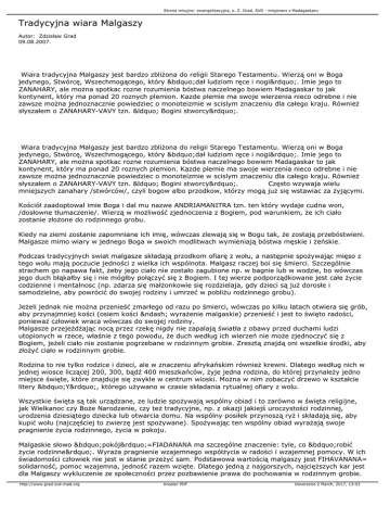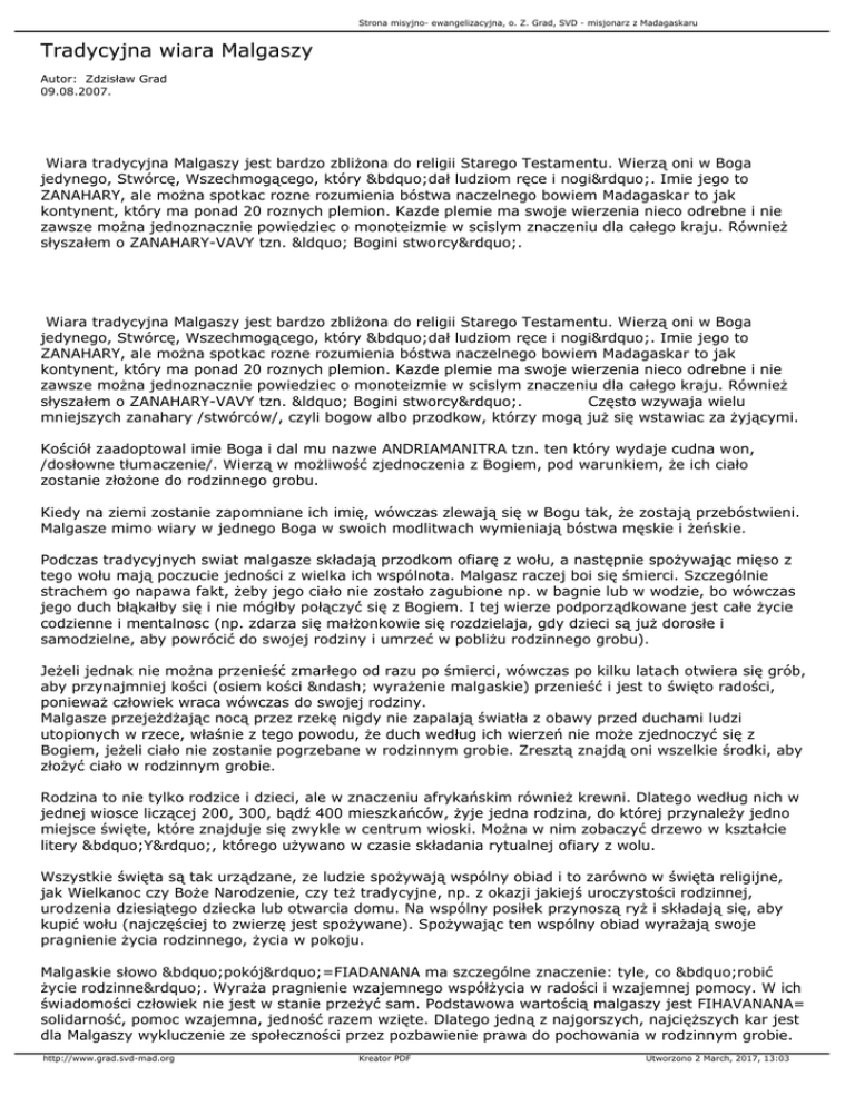 Strona misyjno- ewangelizacyjna, o. Z. Grad, SVD - misjonarz z Madagaskaru Tradycyjna wiara Malgaszy Autor: Zdzisław Grad 09.08.2007. Wiara tradycyjna Malgaszy jest bardzo zbliżona do religii Starego Testamentu. Wierzą oni w Boga jedynego, Stwórcę, Wszechmogącego, który „dał ludziom ręce i nogi”. Imie jego to ZANAHARY, ale można spotkac rozne rozumienia bóstwa naczelnego bowiem Madagaskar to jak kontynent, który ma ponad 20 roznych plemion. Kazde plemie ma swoje wierzenia nieco odrebne i nie zawsze można jednoznacznie powiedziec o monoteizmie w scislym znaczeniu dla całego kraju. Również słyszałem o ZANAHARY-VAVY tzn. “ Bogini stworcy”. Wiara tradycyjna Malgaszy jest bardzo zbliżona do religii Starego Testamentu. Wierzą oni w Boga jedynego, Stwórcę, Wszechmogącego, który „dał ludziom ręce i nogi”. Imie jego to ZANAHARY, ale można spotkac rozne rozumienia bóstwa naczelnego bowiem Madagaskar to jak kontynent, który ma ponad 20 roznych plemion. Kazde plemie ma swoje wierzenia nieco odrebne i nie zawsze można jednoznacznie powiedziec o monoteizmie w scislym znaczeniu dla całego kraju. Również słyszałem o ZANAHARY-VAVY tzn. “ Bogini stworcy”. Często wzywaja wielu mniejszych zanahary /stwórców/, czyli bogow albo przodkow, którzy mogą już się wstawiac za żyjącymi. Kościół zaadoptowal imie Boga i dal mu nazwe ANDRIAMANITRA tzn. ten który wydaje cudna won, /dosłowne tłumaczenie/. Wierzą w możliwość zjednoczenia z Bogiem, pod warunkiem, że ich ciało zostanie złożone do rodzinnego grobu. Kiedy na ziemi zostanie zapomniane ich imię, wówczas zlewają się w Bogu tak, że zostają przebóstwieni. Malgasze mimo wiary w jednego Boga w swoich modlitwach wymieniają bóstwa męskie i żeńskie. Podczas tradycyjnych swiat malgasze składają przodkom ofiarę z wołu, a następnie spożywając mięso z tego wołu mają poczucie jedności z wielka ich wspólnota. Malgasz raczej boi się śmierci. Szczególnie strachem go napawa fakt, żeby jego ciało nie zostało zagubione np. w bagnie lub w wodzie, bo wówczas jego duch błąkałby się i nie mógłby połączyć się z Bogiem. I tej wierze podporządkowane jest całe życie codzienne i mentalnosc (np. zdarza się małżonkowie się rozdzielaja, gdy dzieci są już dorosłe i samodzielne, aby powrócić do swojej rodziny i umrzeć w pobliżu rodzinnego grobu). Jeżeli jednak nie można przenieść zmarłego od razu po śmierci, wówczas po kilku latach otwiera się grób, aby przynajmniej kości (osiem kości – wyrażenie malgaskie) przenieść i jest to święto radości, ponieważ człowiek wraca wówczas do swojej rodziny. Malgasze przejeżdżając nocą przez rzekę nigdy nie zapalają światła z obawy przed duchami ludzi utopionych w rzece, właśnie z tego powodu, że duch według ich wierzeń nie może zjednoczyć się z Bogiem, jeżeli ciało nie zostanie pogrzebane w rodzinnym grobie. Zresztą znajdą oni wszelkie środki, aby złożyć ciało w rodzinnym grobie. Rodzina to nie tylko rodzice i dzieci, ale w znaczeniu afrykańskim również krewni. Dlatego według nich w jednej wiosce liczącej 200, 300, bądź 400 mieszkańców, żyje jedna rodzina, do której przynależy jedno miejsce święte, które znajduje się zwykle w centrum wioski. Można w nim zobaczyć drzewo w kształcie litery „Y”, którego używano w czasie składania rytualnej ofiary z wolu. Wszystkie święta są tak urządzane, ze ludzie spożywają wspólny obiad i to zarówno w święta religijne, jak Wielkanoc czy Boże Narodzenie, czy też tradycyjne, np. z okazji jakiejś uroczystości rodzinnej, urodzenia dziesiątego dziecka lub otwarcia domu. Na wspólny posiłek przynoszą ryż i składają się, aby kupić wołu (najczęściej to zwierzę jest spożywane). Spożywając ten wspólny obiad wyrażają swoje pragnienie życia rodzinnego, życia w pokoju. Malgaskie słowo „pokój”=FIADANANA ma szczególne znaczenie: tyle, co „robić życie rodzinne”. Wyraża pragnienie wzajemnego współżycia w radości i wzajemnej pomocy. W ich świadomości człowiek nie jest w stanie przeżyć sam. Podstawowa wartością malgaszy jest FIHAVANANA= solidarność, pomoc wzajemna, jedność razem wzięte. Dlatego jedną z najgorszych, najcięższych kar jest dla Malgaszy wykluczenie ze społeczności przez pozbawienie prawa do pochowania w rodzinnym grobie. http://www.grad.svd-mad.org Kreator PDF Utworzono 2 March, 2017, 13:03 Strona misyjno- ewangelizacyjna, o. Z. Grad, SVD - misjonarz z Madagaskaru W kulturze malgaskiej młodzi nigdy nie decydowali o swoim małżeństwie. Jest to sprawa zbyt poważna, aby młodym, niedoświadczonym powierzać zakładanie rodziny, dlatego decydują ich rodzice. Ale obecnie to się zmienia, może jeszcze na oddalonych w buszu wioskach, ale i tam juz zauważyłem, ze mlodzi maja coraz wiecej do powiedzenia. Mówią córce: przenieś się do sąsiedniej wioski, idź do swojego męża. Przygotowują nieco bagaży i kiedy przybywa do domu wtedy jest przyjmowana tak, jak każdy przybysz. Mieszkańcy wioski ją witają i od tej pory małżonkowie przebywają razem. W niektórych plemionach podczas uroczystości przyjęcia małżonki młodzi jedzą wspólną łyżką i widelcem i od tej pory razem mieszkają, razem uprawiają to samo pole i w ten sposób powstaje nowa rodzina. W moich plemionach Antambahoaka, Antemoro i Besimisaraka mlodzi sa uznani za małżeństwo po rytualnym błogosławieństwie krola wioski, to nazywa się tradycyjny slub. Ale ze względu na zmiany socjalne jego trwałość nie jest pewna, dlatego i Kościół np. w mojej diecezji Mananjary, tego slubu nie uznaje za naturalny w sensie prawa kanonicznego. Co do ślubu kościelnego, nigdy go nie udzielamy, jesli nie ma slubu tradycyjnego, nie ma sensu, rozpadnie się szybko. To co zauważyłem, ze ludzie (przynajmniej wielu z nich) boją się ślubować do końca życia, dlatego śluby kościelne są,w busz