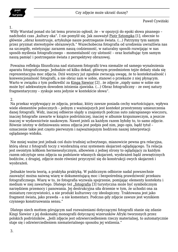 Czy zdjęcie może ukraść duszę? Paweł Cywiński 1. Willy Warstad ponad sto lat temu proroczo ogłosił, że – w opozycji do epoki słowa pisanego – nadchodzi czas „kultury oka”. I nie pomylił się. Jak zauważył Piotr Sztompka [1], obecnie to głównie „obraz konstruuje, artykułuje nasze postrzeganie świata. (…) Patrzymy tym samym przez pryzmat stereotypów obrazowych.” Wszechobecna fotografia od urodzenia uwrażliwia nas na szczegóły, estetyzując zarazem naszą codzienność, w naturalny sposób rozwijając w nas sposób myślenia fotograficznego – momentalność czy ulotność – oraz kształtując tym samym naszą pamięć i postrzeganie świata z perspektywy obrazowej. Poważna refleksja filozoficzna nad statusem fotografii trwa niemalże od samego wynalezienia aparatu fotograficznego. Jednakże od kilku dekad, głównym przedmiotem tejże debaty stała się reprezentacyjna moc zdjęcia. Dziś wszyscy już zgodnie zwracają uwagę, że to kontekstualność i konwencjonalność fotografii, a nie obraz sam w sobie, stanowi o przekazie z niej płynącym. Warto w związku z tym podkreślić za Kingą Siewior [2] , że zdjęcie „nigdy samo w sobie nie może być adekwatnym dowodem istnienia zjawiska. (…) Obraz fotograficzny – ze swej natury fragmentaryczny – zyskuje sens jedynie w kontekście słowa”. 2. Na przekaz wypływający ze zdjęcia, przekaz, który zawsze posiada cechy wartościujące, wpływa wiele elementów pobocznych – jednym z ważniejszych jest kontekst przestrzenny umieszczenia danej fotografii. Widz, inaczej odbierze slajdy u znajomych podczas suto zakrapianego wieczoru, inaczej fotografie zawarte w książce podróżniczej, inaczej w albumie krajoznawczym, a jeszcze inaczej w wydawnictwie naukowym. Nawet jeżeli za każdym razem byłoby to, to samo zdjęcie. Równie istotny w definiowaniu sensu zdjęcia jest podpis pod nim, jego opis, bądź tytuł – oznaczenie takie jest często pierwszym i najważniejszym bodźcem naszej interpretacji oglądanego widoku. Nie mniej ważne jest jednak coś dużo trudniej uchwytnego, mianowicie pewna gra relacyjna, którą obraz z fotografii toczy z wyobraźnią oraz systemem skojarzeń oglądającego. Ta relacja jest swoistym kółkiem hermeneutycznym, albowiem z jednej strony to oglądający za każdym razem odczytuje sens zdjęcia na podstawie własnych skojarzeń, wyobrażeń bądź zewnętrznych bodźców, z drugiej, zdjęcie może również przyczynić się do konstrukcji owych skojarzeń i wyobrażeń. Jednakże teoria teorią, a praktyka praktyką. W publicznym odbiorze nadal powszechnie zauważyć można naiwną wiarę w dokumentującą moc i bezpośrednią prawdziwość przekazu fotograficznego. Wiarę w to, że fotografia wyzwala spojrzenie, pomijając elementy kontekstu i medium w niej zawartego. Dlatego też „fotografia [3] turystyczna może być symbolicznym narzędziem przemocy i panowania. Jej destrukcyjna siła drzemie w tym, że uchodzi ona za miniaturę rzeczywistości, a nie produkt kulturowy czy ideologiczny. Traktowana jest jako fragment świata, jako prawda – a nie komentarz. Podczas gdy zdjęcie zawsze jest wynikiem czynnego konstruowania sensu.” Dlatego niech mottem górującym nad rozważeniami dotyczącymi fotografii stanie się zdanie Kingi Siewior z jej doskonałej monografii dotyczącej wizerunków Afryki tworzonych przez polskich podróżników. „Jeśli zdjęcie jest odzwierciedleniem rzeczy materialnej, to automatycznie staje się i odzwierciedleniem niematerialnego sposobu jej widzenia.” 3. A jak turyści widzą świat? Fotografia wakacyjna bardzo często jest reprodukcją „turystycznego spojrzenia”. Spojrzenia, które jest wypadkową turystycznych praktyk i wyobrażeń o świecie. Czym owo spojrzenie jest? „W 1976 roku [4] Dean MacCannell napisał książkę, która zrewolucjonizowała dotychczasowe myślenie o turystyce: Turysta. Nowa teoria klasy próżniaczej. Zwrócił on w niej uwagę, iż pierwszy kontakt zwiedzającego z określonym obiektem turystycznym (...), zazwyczaj nie polega na zetknięciu się z nim samym, lecz z jakimś jego przedstawieniem – w przewodniku turystycznym, folderze reklamowym, programie telewizyjnym, artykule internetowym czy choćby na widokówce. O krok dalej poszedł inny wybitny socjolog, John Urry – stwierdził on, że turyści często wcale nie podziwiają rzeczywistych widoków, a skupiają się wyłącznie na wyszukiwaniu tychże wyidealizowanych przedstawień. A to poszukiwanie przez zwiedzających owych charakterystycznych znaków potwierdzających ich wyobrażenie o wakacyjnym miejscu nazwał spojrzeniem turysty” Turystyczne spojrzenie jest więc szukaniem tego co się kojarzy i czego się spodziewa. Tym samym współcześni turyści – obywatele kultury oka – stali się kolekcjonerami obrazów i poruszają się w doskonale wcześniej zobrazowanych przestrzeniach, pozytywnie ocenionych jako wartościowe z punktu widzenia atrakcyjności turystycznej przez turystycznych narratorów. 4. Idąc dalej tym tropem, fotografia turystyczna stała się zaledwie konsekwencją interpretacji konkretnej rzeczywistości. Interpretacji, której fundamenty powstały na długo przed samym momentem wykonania zdjęcia. Jaki z tego może wyłonić się wniosek? Jak zauważyła Kinga Siewior turystyczne: „spojrzenie, a także praktyki jego reprezentacji (wizualizacji i tekstualizacji) okazują się nierozerwalnie związane z czynnikami zewnętrznymi. Powstałe w efekcie obrazy przedstawiają nie świat obiektywny sam w sobie, ale raczej jego podmiotowe interpretacje.” Zwracam uwagę na słowo „podmiotowe” – pamiętając, że sytuacja ta dotyczy często fotografowania innych ludzi, czyli jest elementem relacji interpersonalnych. A fotografowanie człowieka, jest czymś o wiele bardziej skomplikowanym etycznie niż fotografowanie wodospadu czy samochodu. Emanuel Levinas w swojej filozofii dialogu i wielkich rozwa