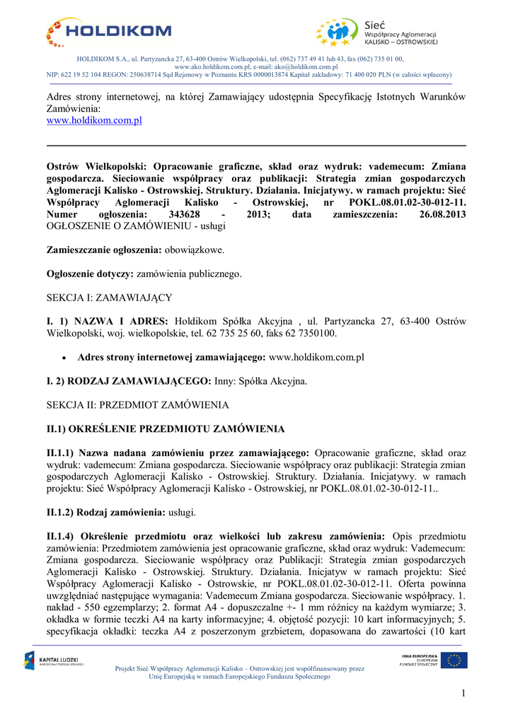 HOLDIKOM S.A., ul. Partyzancka 27, 63-400 Ostrów Wielkopolski, tel. (062) 737 49 41 lub 43, fax (062) 735 01 00, www.ako.holdikom.com.pl, e-mail: [email protected] NIP: 622 19 52 104 REGON: 250638714 Sąd Rejonowy w Poznaniu KRS 0000013874 Kapitał zakładowy: 71 400 020 PLN (w całości wpłacony) Adres strony internetowej, na której Zamawiający udostępnia Specyfikację Istotnych Warunków Zamówienia: www.holdikom.com.pl Ostrów Wielkopolski: Opracowanie graficzne, skład oraz wydruk: vademecum: Zmiana gospodarcza. Sieciowanie współpracy oraz publikacji: Strategia zmian gospodarczych Aglomeracji Kalisko - Ostrowskiej. Struktury. Działania. Inicjatywy. w ramach projektu: Sieć Współpracy Aglomeracji Kalisko - Ostrowskiej, nr POKL.08.01.02-30-012-11. Numer ogłoszenia: 343628 2013; data zamieszczenia: 26.08.2013 OGŁOSZENIE O ZAMÓWIENIU - usługi Zamieszczanie ogłoszenia: obowiązkowe. Ogłoszenie dotyczy: zamówienia publicznego. SEKCJA I: ZAMAWIAJĄCY I. 1) NAZWA I ADRES: Holdikom Spółka Akcyjna , ul. Partyzancka 27, 63-400 Ostrów Wielkopolski, woj. wielkopolskie, tel. 62 735 25 60, faks 62 7350100. Adres strony internetowej zamawiającego: www.holdikom.com.pl I. 2) RODZAJ ZAMAWIAJĄCEGO: Inny: Spółka Akcyjna. SEKCJA II: PRZEDMIOT ZAMÓWIENIA II.1) OKREŚLENIE PRZEDMIOTU ZAMÓWIENIA II.1.1) Nazwa nadana zamówieniu przez zamawiającego: Opracowanie graficzne, skład oraz wydruk: vademecum: Zmiana gospodarcza. Sieciowanie współpracy oraz publikacji: Strategia zmian gospodarczych Aglomeracji Kalisko - Ostrowskiej. Struktury. Działania. Inicjatywy. w ramach projektu: Sieć Współpracy Aglomeracji Kalisko - Ostrowskiej, nr POKL.08.01.02-30-012-11.. II.1.2) Rodzaj zamówienia: usługi. II.1.4) Określenie przedmiotu oraz wielkości lub zakresu zamówienia: Opis przedmiotu zamówienia: Przedmiotem zamówienia jest opracowanie graficzne, skład oraz wydruk: Vademecum: Zmiana gospodarcza. Sieciowanie współpracy oraz Publikacji: Strategia zmian gospodarczych Aglomeracji Kalisko - Ostrowskiej. Struktury. Działania. Inicjatyw w ramach projektu: Sieć Współpracy Aglomeracji Kalisko - Ostrowskie, nr POKL.08.01.02-30-012-11. Oferta powinna uwzględniać następujące wymagania: Vademecum Zmiana gospodarcza. Sieciowanie współpracy. 1. nakład - 550 egzemplarzy; 2. format A4 - dopuszczalne +- 1 mm różnicy na każdym wymiarze; 3. okładka w formie teczki A4 na karty informacyjne; 4. objętość pozycji: 10 kart informacyjnych; 5. specyfikacja okładki: teczka A4 z poszerzonym grzbietem, dopasowana do zawartości (10 kart Projekt Sieć Współpracy Aglomeracji Kalisko – Ostrowskiej jest współfinansowany przez Unię Europejską w ramach Europejskiego Funduszu Społecznego 1 HOLDIKOM S.A., ul. Partyzancka 27, 63-400 Ostrów Wielkopolski, tel. (062) 737 49 41 lub 43, fax (062) 735 01 00, www.ako.holdikom.com.pl, e-mail: [email protected] NIP: 622 19 52 104 REGON: 250638714 Sąd Rejonowy w Poznaniu KRS 0000013874 Kapitał zakładowy: 71 400 020 PLN (w całości wpłacony) informacyjnych), wyposażona w skrzydła blokujące z dwóch stron, papier kredowy o gramaturze co najmniej 350 gm2, lub więcej, pełen kolor (full color) 4+4, foliowanie folią z obu stron; 6. specyfikacja kart informacyjnych: papier kredowy matowy o gramaturze co najmniej 250 gm2, lub więcej, pełen kolor (full color) 4+4, karty informacyjne zadrukowane dwustronnie; 7. ilość kart informacyjnych zadrukowanych dwustronnie kolorem 4+4: 10 kart (+- 0 kart); 8. pozycja zawierać będzie: treść, grafikę (wykresy, schematy, rysunki, loga itp.), fotografie; 9. Zamawiający przewiduje w niniejszym zamówieniu prawo opcji, tj. przedmiotem zamówienia jest wykonanie 550 egzemplarzy vademecum o którym mowa wyżej, z tym że Zamawiający zastrzega sobie prawo do zmniejszenia rzeczywistej ilości zamawianych egzemplarzy. Minimalny zakres zamówienia wynosi: 350 sztuk. Publikacja: ,Strategia zmian gospodarczych Aglomeracji Kalisko - Ostrowskiej. Struktury. Działania. Inicjatywy 1. nakład - 550 egzemplarzy; 2. format A4 - dopuszczalne +- 1 mm różnicy na każdym wymiarze; 3. oprawa klejona; 4. objętość pozycji: 130 stron + okładka miękka (2 strony); 5. specyfikacja okładki: papier kreda matowa o gramaturze co najmniej 350 gm2, kolor 4+0, foliowanie folią matową + lakier wybiórczy; 6. specyfikacja stron wewnętrznych: papier kreda matowa o gramaturze co najmniej 130 gm2, kolor 4+4, 7. ilość kolorowych stron: minimum 80. 8. ilość stron: 130. 9. pozycja zawierać będzie: treść, grafikę (wykresy, schematy, rysunki, loga itp.), fotografie. 10. Zamawiający przewiduje w niniejszym zamówieniu prawo opcji, tj. przedmiotem zamówienia jest wykonanie 550 egzemplarzy publikacji o której mowa wyżej, z tym że Zamawiający zastrzega sobie prawo do zmniejszenia rzeczywistej ilości zamawianych egzemplarzy. Minimalny zakres zamówienia wynosi: 350 sztuk. W ramach zamówienia Wykonawca zobowiązany jest do: 1. wykonania 3 rodzajów okładek dla publikacji według zaleceń dostarczonych przez Zamawiającego (1 z 3 rodzajów okładek będzie wykorzystana dwukrotnie, z uwzględnieniem skalowania rozmiaru do formatu publikacji); 2. zapewnienia 3 różnych ilustracji (zdjęć, obrazków) do okładek (Zamawiający nie wymaga zdjęć przedstawiających konkretne obiekty czy osoby. Powinny to być zdjęcia/ilustracje związane z tematyką publikacji tzn. biznesem, przedsiębiorczością, gospodarką. Wybór ilustracji nastąpi w porozumieniu z Zamawiającym); 3. składu i łamania tekstu z uwzględnieniem tabel, wykresów i rycin; 4. opracowania graficznego: tabel, wykresów, ozdobnych elementów graficznych w nagłówku i marginesach stron według wskazówek Zamawiającego (tabele i wykresy powinny być sformatowane i opracowane graficzne wg jednolitego wzoru); 5. przygotowania publikacji do druku i przedstawienia do ostatecznej akceptacji Zamawiającemu przed rozpoczęciem druku; 6. dostosowania grubości grzbie