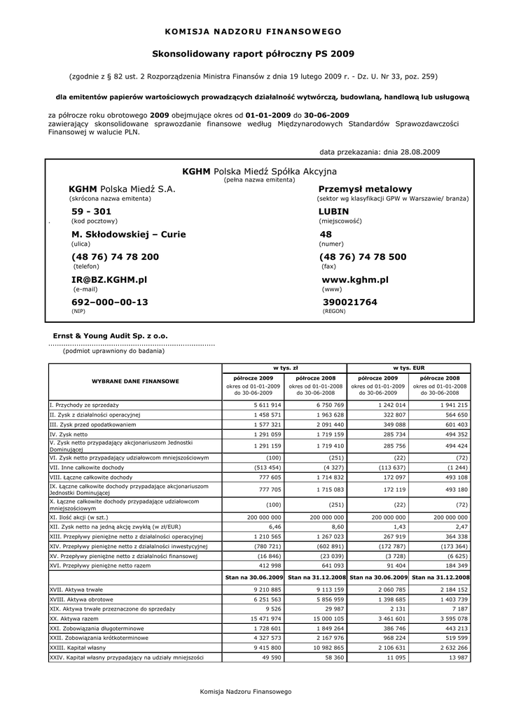 KOMISJA NADZORU FINANSOWEGO Skonsolidowany raport półroczny PS 2009 (zgodnie z § 82 ust. 2 Rozporządzenia Ministra Finansów z dnia 19 lutego 2009 r. - Dz. U. Nr 33, poz. 259) dla emitentów papierów wartościowych prowadzących działalność wytwórczą, budowlaną, handlową lub usługową za półrocze roku obrotowego 2009 obejmujące okres od 01-01-2009 do 30-06-2009 zawierający skonsolidowane sprawozdanie finansowe według Międzynarodowych Standardów Sprawozdawczości Finansowej w walucie PLN. data przekazania: dnia 28.08.2009 KGHM Polska Miedź Spółka Akcyjna (pełna nazwa emitenta) . KGHM Polska Miedź S.A. Przemysł metalowy (skrócona nazwa emitenta) (sektor wg klasyfikacji GPW w Warszawie/ branŜa) 59 - 301 LUBIN (kod pocztowy) (miejscowość) M. Skłodowskiej – Curie 48 (ulica) (numer) (48 76) 74 78 200 (48 76) 74 78 500 (telefon) (fax) [email protected] www.kghm.pl (e-mail) (www) 692–000–00-13 390021764 (NIP) (REGON) Ernst & Young Audit Sp. z o.o. ............................................................................. (podmiot uprawniony do badania) w tys. zł w tys. EUR półrocze 2009 półrocze 2008 półrocze 2009 półrocze 2008 okres od 01-01-2009 do 30-06-2009 okres od 01-01-2008 do 30-06-2008 okres od 01-01-2009 do 30-06-2009 okres od 01-01-2008 do 30-06-2008 I. Przychody ze sprzedaŜy 5 611 914 6 750 769 1 242 014 1 941 215 II. Zysk z działalności operacyjnej 1 458 571 1 963 628 322 807 564 650 III. Zysk przed opodatkowaniem 1 577 321 2 091 440 349 088 601 403 IV. Zysk netto 1 291 059 1 719 159 285 734 494 352 V. Zysk netto przypadający akcjonariuszom Jednostki Dominującej 1 291 159 1 719 410 285 756 494 424 WYBRANE DANE FINANSOWE VI. Zysk netto przypadający udziałowcom mniejszościowym (100) (251) (22) (72) (513 454) (4 327) (113 637) (1 244) VIII. Łączne całkowite dochody 777 605 1 714 832 172 097 493 108 IX. Łączne całkowite dochody przypadające akcjonariuszom Jednostki Dominującej 777 705 1 715 083 172 119 493 180 (100) (251) (22) (72) 200 000 000 200 000 000 200 000 000 200 000 000 6,46 8,60 1,43 2,47 XIII. Przepływy pienięŜne netto z działalności operacyjnej 1 210 565 1 267 023 267 919 364 338 XIV. Przepływy pienięŜne netto z działalności inwestycyjnej (173 364) VII. Inne całkowite dochody X. Łączne całkowite dochody przypadające udziałowcom mniejszościowym XI. Ilość akcji (w szt.) XII. Zysk netto na jedną akcję zwykłą (w zł/EUR) (780 721) (602 891) (172 787) XV. Przepływy pienięŜne netto z działalności finansowej (16 846) (23 039) (3 728) (6 625) XVI. Przepływy pienięŜne netto razem 412 998 641 093 91 404 184 349 Stan na 30.06.2009 Stan na 31.12.2008 Stan na 30.06.2009 Stan na 31.12.2008 XVII. Aktywa trwałe 9 210 885 9 113 159 2 060 785 2 184 152 XVIII. Aktywa obrotowe 6 251 563 5 856 959 1 398 685 1 403 739 9 526 29 987 2 131 7 187 15 471 974 15 000 105 3 461 601 3 595 078 XXI. Zobowiązania długoterminowe 1 728 601 1 849 264 386 746 443 213 XXII. Zobowiązania krótkoterminowe 4 327 573 2 167 976 968 224 519 599 XXIII. Kapitał własny 9 415 800 10 982 865 2 106 631 2 632 266 49 590 58 360 11 095 13 987 XIX. Aktywa trwałe przeznaczone do sprzedaŜy XX. Aktywa razem XXIV. Kapitał własny przypadający na udziały mniejszości Komisja Nadzoru Finansowego GRUPA KAPITAŁOWA KGHM POLSKA MIEDŹ S.A. RAPORT BIEGŁEGO REWIDENTA Z PRZEGLĄDU SPRAWOZDANIA FINANSOWEGO ZA I PÓŁROCZE 2009 ROKU Lubin, sierpień 2009 roku GRUPA KAPITAŁOWA KGHM POLSKA MIEDŹ S.A. OŚWIADCZENIE ZARZĄDU W SPRAWIE RZETELNOŚCI SPORZĄDZENIA SPRAWOZDANIA FINANSOWEGO Lubin, sierpień 2009 roku OŚWIADCZENIE ZARZĄDU KGHM POLSKA MIEDŹ S.A. W SPRAWIE RZETELNOŚCI SPORZĄDZENIA SKONSOLIDOWANEGO SPRAWOZDANIA FINANSOWEGO Według naszej najlepszej wiedzy półroczne skonsolidowane sprawozdanie finansowe i dane porównywalne sporządzone zostały zgodnie z obowiązującymi zasadami rachunkowości, odzwierciedlają w sposób prawdziwy, rzetelny i jasny sytuację majątkową i finansową Grupy Kapitałowej KGHM Polska Miedź S.A. oraz wynik finansowy Grupy Kapitałowej. Półroczne sprawozdanie z działalności Grupy Kapitałowej zawiera prawdziwy obraz rozwoju i osiągnięć oraz sytuacji Grupy Kapitałowej KGHM Polska Miedź S.A., w tym opis podstawowych zagroŜeń i ryzyka. Podpisy Podpisy wszystkich Członków Zarządu Data Imię i Nazwisko 25.08.2009 r. Herbert Wirth 25.08.2009 r. Maciej Tybura 25.08.2009 r. Ryszard Janeczek Stanowisko /Funkcja Prezes Zarządu I Wiceprezes Zarządu Wiceprezes Zarządu Podpis GRUPA KAPITAŁOWA KGHM POLSKA MIEDŹ S.A. OŚWIADCZENIE ZARZĄDU W SPRAWIE PODMIOTU UPRAWNIONEGO DO BADANIA SPRAWOZDAŃ FINANSOWYCH Lubin, sierpień 2009 roku OŚWIADCZENIE ZARZĄDU KGHM POLSKA MIEDŹ S.A. W UPRAWNIONEGO DO BADANIA SPRAWOZDAŃ FINANSOWYCH SPRAWIE PODMIOTU Podmiot uprawniony do badania sprawozdań finansowych, dokonujący przeglądu półrocznego skonsolidowanego sprawozdania finansowego, został wybrany zgodnie z przepisami prawa. Podmiot ten oraz biegli rewidenci dokonujący tego przeglądu spełnili warunki do wydania bezstronnego i niezaleŜnego raportu z przeglądu, zgodnie z obowiązującymi przepisami i normami zawodowymi. Podpisy Podpisy wszystkich Członków Zarządu Data Imię i Nazwisko 25.08.2009 r. Herbert Wirth 25.08.2009 r. Maciej Tybura 25.08.2009 r. Ryszard Janeczek Stanowisko /Funkcja Prezes Zarządu I Wiceprezes Zarządu Wiceprezes Zarządu Podpis GRUPA KAPITAŁOWA KGHM POLSKA MIEDŹ S.A. SKONSOLIDOWANE SPRAWOZDANIE FINANSOWE ZA I PÓŁROCZE 2009 ROKU Lubin, sierpień 2009 roku Grupa Kapitałowa KGHM Polska Miedź S.A. Półroczne skonsolidowane sprawozdanie finansowe sporządzone według MSSF zatwierdzonych przez Unię Europejską za okres od 1 stycznia 2009 r. do 30 czerwca 2009 r. (kwoty w tabelach wyraŜone są w tys. złotych, o ile nie podano inaczej) Spis treści do skonsolidowanego sprawozdania finansowego Nota Skonsolidowane sprawozdanie z sytuacji finansowej Strona 3 Skonsol