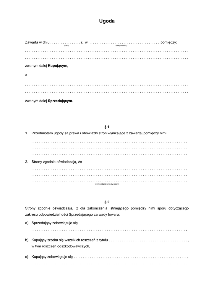 Ugoda Zawarta w dniu . . . . . . . . . . . . . . . . . r. w . . . . . . . . . . . . . . . . . . . . . . . . . . . . . . . . . . . . . . . pomiędzy: (data) (miejscowość) ........................................................................................... .........................................................................................., zwanym dalej Kupującym, a ........................................................................................... .........................................................................................., zwanym dalej Sprzedającym. §1 1. Przedmiotem ugody są prawa i obowiązki stron wynikające z zawartej pomiędzy nimi ....................................................................................... ....................................................................................... ....................................................................................... 2. Strony zgodnie oświadczają, że ....................................................................................... ....................................................................................... ....................................................................................... (wymienić przyczynę(y) sporu) §2 Strony zgodnie oświadczają, iż dla zakończenia istniejącego pomiędzy nimi sporu dotyczącego zakresu odpowiedzialności Sprzedającego za wady towaru: a) Sprzedający zobowiązuje się . . . . . . . . . . . . . . . . . . . . . . . . . . . . . . . . . . . . . . . . . . . . . . . . . . . . . . . . . . . . . ......................................................................................, b) Kupujący zrzeka się wszelkich roszczeń z tytułu . . . . . . . . . . . . . . . . . . . . . . . . . . . . . . . . . . . . . . . . . . . , w tym roszczeń odszkodowawczych, c) Kupujący zobowiązuje się . . . . . . . . . . . . . . . . . . . . . . . . . . . . . . . . . . . . . . . . . . . . . . . . . . . . . . . . . . . . . . . . ....................................................................................... §3 Kupujący niniejszym pokwitowuje odbiór sumy, o której mowa w § 2 pkt a). §4 Obie strony zgodnie oświadczają, że nie roszczą wobec siebie żadnych pretensji w związku z zawarciem i wykonaniem umowy z . . . . . . . . . . . . . . . . . . r. §5 W sprawach nieuregulowanych zastosowanie znajdą przepisy Kodeksu cywilnego. §6 Umowę sporządzono w . . . . . . . . jednobrzmiących egzemplarzach, po . . . . . . . . . dla każdej ze stron. ....................... .......................... (podpis Kupującego) (podpis Sprzedającego)