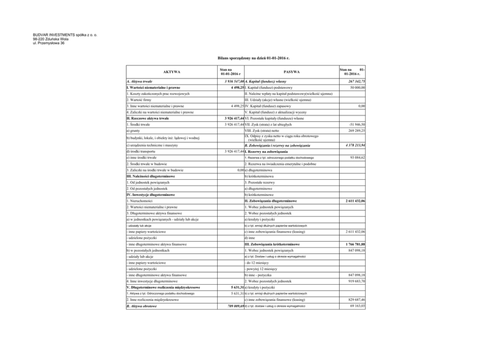 BUDVAR INVESTMENTS spółka z o. o. 98-220 Zduńska Wola ul. Przemysłowa 36 Bilans sporządzony na dzień 01-01-2016 r. AKTYWA A. Aktywa trwałe I. Wartości niematerialne i prawne 1. Koszty zakończonych prac rozwojowych 2. Wartość firmy 3. Inne wartości niematerialne i prawne 4. Zaliczki na wartości niematerialne i prawne Stan na 01-01-2016 r PASYWA 3 936 547,00 A. Kapitał (fundusz) własny 4 498,25 I. Kapitał (fundusz) podstawowy 3 926 417,44 VII. Zysk (strata) z lat ubiegłych c) urządzenia techniczne i maszyny VIII. Zysk (strata) netto IX. Odpisy z zysku netto w ciągu roku obrotowego (wielkość ujemna) B. Zobowiązania i rezerwy na zobowiązania -51 946,50 269 289,25 4 378 213,94 3 926 417,44 I. Rezerwy na zobowiązania e) inne środki trwałe 1. Rezerwa z tyt. odroczonego podatku dochodowego 2. Środki trwałe w budowie 2. Rezerwa na świadczenia emerytalne i podobne 3. Zaliczki na środki trwałe w budowie 0,00 V. Kapitał (fundusz) z aktualizacji wyceny 3 926 417,44 VI. Pozostałe kapitały (fundusze) własne d) środki transportu 50 000,00 III. Udziały (akcje) własne (wielkość ujemna) 4 498,25 IV. Kapitał (fundusz) zapasowy 1. Środki trwałe b) budynki, lokale, i obiekty inż. lądowej i wodnej 267 342,75 II. Należne wpłaty na kapitał podstawowy(wielkość ujemna) II. Rzeczowe aktywa trwałe a) grunty Stan na 0101-2016 r. 93 084,62 0,00 a) długoterminowa III. Należności długoterminowe b) krótkoterminowa 1. Od jednostek powiązanych 3. Pozostałe rezerwy 2. Od pozostałych jednostek a) długoterminowe IV. Inwestycje długoterminowe b) krótkoterminowe 1. Nieruchomości II. Zobowiązania długoterminowe 2. Wartości niematerialne i prawne 1. Wobec jednostek powiązanych 3. Długoterminowe aktywa finansowe 2. Wobec pozostałych jednostek a) w jednostkach powiązanych - udziały lub akcje a) kredyty i pożyczki - udzaiały lub akcje b) z tyt. emisji dłużnych papierów wartościowych - inne papiery wartościowe c) inne zobowiązania finansowe (leasing) - udzielone pożyczki d) inne - inne długoterminowe aktywa finansowe III. Zobowiązania krótkoterminowe b) w pozostałych jednostkach 1. Wobec jednostek powiązanych - udziały lub akcje a) z tyt. Dostaw i usług o okresie wymagalności - inne papiery wartościowe - do 12 miesięcy 2 611 432,06 2 611 432,06 1 766 781,88 847 098,18 - udzielone pożyczki - powyżej 12 miesięcy - inne długoterminowe aktywa finansowe b) inne - pożyczka 847 098,18 4. Inne inwestycje długoterminowe 2. Wobec pozostałych jednostek 919 683,70 V. Długoterminowe rozliczenia międzyokresowe 5 631,31 a) kredyty i pożyczki 1. Aktywa z tyt. Odroczonego podatku dochodowego 5 631,31 b) z tyt. emisji dłużnych papierów wartościowych 2. Inne rozliczenia międzyokresowe B. Aktywa obrotowe c) inne zobowiązania finansowe (leasing) 829 687,46 709 009,69 d) z tyt. dostaw i usług o okresie wymagalności 69 163,03 BUDVAR INVESTMENTS spółka z o. o. 98-220 Zduńska Wola ul. Przemysłowa 36 69 163,03 0,00 - do 12 miesięcy I. Zapasy 1. Materiały - powyżej 12 miesięcy 2. Półprodukty i produkty w toku e) zaliczki otrzymane na dostawy 3. Produkty gotowe f) zobowiązania wekslowe 4. Towary g) z tyt. podatków,ceł,ubezpieczeń i innych świadczeń 5. Zaliczki na dostawy h) z tyt. wynagrodzeń 6 147,11 II. Należności krótkoterminowe 241 260,36 i) inne 1. Należności od jednostek powiązanych 199 848,96 3. Fundusze specjalne a) z tyt.dostaw i usług, o okresie spłaty: 199 848,96 IV. Rozliczenia międzyokresowe - do 12 miesięcy 199 848,96 1. Ujemna wartość firmy 103,20 - powyżej 12 miesięcy 2. Inne rozliczenia międzyokresowe b) inne a) długoterminowe 2. Należności od pozostałych jednostek 41 411,40 b) krótkoterminowe a) z tyt. dostaw i usług, o okresie spłaty: 41 411,40 - do 12 miesięcy 41 411,40 14 582,90 0,00 - powyżej 12 miesięcy b) z tyt. podatków, dotacji, ceł, ubezp. społ. i zdrow. i innych świadczeń c) inne d) dochodzone na drodze sądowej III. Inwestycje krótkoterminowe 423 102,02 1. Krótkoterminowe aktywa finansowe 423 102,02 a) w jednostkach powiązanych - udziały lub akcje - inne papiery wartościowe - udzielone pożyczki - inne krótkoterminowe aktywa finansowe b) w pozostałych jednostkach - udziały lub akcje - inne papiery wartościowe - udzielone pożyczki - inne krótkoterm. aktywa finansowe c) środki pieniężne i inne aktywa pieniężne 423 102,02 - środki pieniężne w kasie i na rachunkach 423 102,02 - inne środki pieniężne - inne aktywa pieniężne 2. Inne inwestycje krótkoterminowe IV. Krótkoterminowe rozliczenia międzyokresowe Aktywa razem Zduńska Wola dnia 18-02-2016 r. Sporządziła: Alicja Leśniak Gówna Księgowa 44 647,31 4 645 556,69 Pasywa razem Marek Trzciński Prezes Zarządu 4 645 556,69