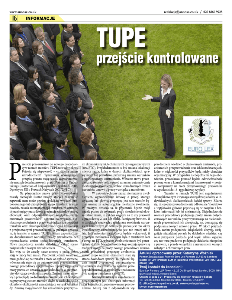 www.anonse.co.uk 16| informacje [email protected] / 020 8166 9928 TUPE przejście kontrolowane P rzejście pracowników do nowego pracodawcy w ramach transferu TUPE to trudny okres. Pojawia się niepewność – co dalej z moim zatrudnieniem? Tymczasem, obowiązujące przepisy prawne mają na celu zagwarantowanie naszych dotychczasowych praw (Transfer of Undertakings (Protection of Employment) Regulations 2006, Dyrektywa UE o Prawach Nabytych 2001/23/EC). Na płaszczyźnie prawa pracy wprowadzone zostały niezwykle istotne zasady, których znajomość zapewnić nam może pewien spokój na wypadek proponowanego lub przeprowadzanego transferu. A mianowicie, zasada automatycznego transferu, co oznacza, iż przejmujący pracodawca przejmuje wszystkie prawa, obowiązki oraz odpowiedzialność względem przejmowanych pracowników; ochrona na wypadek niesłusznego zwolnienia z pracy w związku (tj. z powodu) transferu oraz obowiązek informacji oraz konsultacji z przejmowanymi pracownikami. W praktyce oznacza to, że transfer w ramach TUPE ma nam zapewnić nasze dotychczasowe warunki i zasady zatrudnienia bez wprowadzania zmian spowodowanych transferem. Nowy pracodawca niejako ‘dziedziczy’ całość spraw związanych z naszym zatrudnieniem. Tak więc co do zasady nasze umowy o pracę pozostają w mocy bez zmian. Pracownik jednak wcale nie musi godzić się na transfer i może on zgłosić sprzeciw, wówczas nie staje się on automatycznie pracownikiem nowego pracodawcy a jego umowa o pracę wygasa na mocy prawa, co oznacza, iż nie wchodzą tu w grę przepisy dotyczące zwolnienia z pracy. Zmiany naszej umowy o pracę będą co do zasady nieważne jeśli ich wyłączną przyczyną jest sam transfer, chyba że zachodzą ściśle określone okoliczności uzasadniające wyjątek od zasady. Zmiany mogą bowiem być uzasadnione przyczyna- mi ekonomicznymi, technicznymi czy organizacyjnymi przedzeniem wiedzieć o planowanych zmianach, pro(tzw. ETO). Przykładem może tu być zmiana lokalizacji cedurze ich przeprowadzenia oraz ich konsekwencjach, miejsca pracy, która w danych okolicznościach spra- które w większości przypadków będą miały charakter wy może być prawdziwą przyczyną zmiany warunków organizacyjny. W przypadku niedopełnienia tego obodotychczasowego zatrudnienia. Wówczas nowy praco- wiązku, pracodawca ponosić będzie odowiedzialność dawca chroniony będzie przed zarzutem automatycznie prawną wraz z konsekwencjami finansowymi w postaniesłusznego zwolnienia wobec uzasadnionych zmian ci kompensaty na rzecz przejmowanego pracownika warunków umowy o pracę w związku z transferem. w wysokości do 13- tygodniowej wypłaty. W zakresie ochrony przed niesłusznym zwol- Transfer w ramach TUPE jest zagadnieniem nieniem, wypowiedzenie umowy o pracę, którego skomplikowanym i wymaga szczegółowej analizy w inwyłączną lub główną przyczyną jest sam transfer bę- dywidualnych okolicznościach każdej sprawy. Zdarza dzie uznane za automatycznie niesłuszne zwolnienie. się, iż jego przeprowadzenie nie odbywa się ‘modelowo’ W praktyce oznacza to, iż pracownik będzie mógł a wątpliwości głównie pojawiają się w związku z brawnieść pozew do trybunału pracy niezależnie od okre- kiem informacji lub jej niejasnością. Niejednokrotnie su zatrudnienia, to jest bez względu na to czy pracował również pracodawcy podejmują próby zmian dotychu pracodawcy 2 lata lub mniej. Pamiętamy bowiem, iż czasowych warunków pracy wymuszając na nieświadow ‘zwykłych’ sprawach o niesłuszne zwolnienie warun- mych pracownikach ich akceptację, np. domagając się kiem koniecznym do wniesienia pozwu jest tzw. okres podpisania nowych umów o pracę. W takich przypadkwalifikacyjny zatrudnienia, to jest nie mniej niż 2 kach, zanim podejmiecie jakąkolwiek decyzję, zasięlata. Jeśli natomiast pracodawca będzie wykazywał, iż gnijcie niezależnej porady by dokładnie wiedzieć, czy przyczyna zwolnienia związana była z transferem lecz wasz przypadek podpada pod wąski zakres wyjątku, z uwagi na ETO, wówczas zwolnienie może być poten- czy też wasz pradawca podejmuje działania niezgodne cjalnie słuszne. Niejednokrotnie tego rodzaju sprawy są z prawem, a przede wszystkim z naruszeniem waszych trudne z uwagi na próby nowego pracodawcy zatuszo- nabytych i chronionych praw. wania prawdziwej przyczyny zwolnienia, Artukuł opracowany przez Katarzynę Woźniak wobec czego ważnym elementem staje się Partner Zarządzający/ Prawnik Euro Lex Partners LLP (City London) strona dowodowa sprawy. To trybunał bę- Master of Law (Poland) LLM in Business International Law (UK) LLB dzie musiał dysponować wystarczającym (Hons) (UK) materiałem dla uznania na zasadzie praw- Twój kontakt do kancelarii: dopodobieństwa, iż zwolnienie spodowane Euro Lex Partners LLP, Tower 42, 25 Old Broad Street, London, EC2N 1HN, było samym transferem a nie ETO. (przy stacji metra Liverpoool Street) Niezwykle istotnym zagadnieniem Otwarte w godz 9-21- Pracujemy dla klientów również w Sobotę proceduralnym jest obowiązek informacji Tel. 020 8144 8363, Mob 07837214987, Mob 077 7226 0251, oraz konsultacji z przejmowanymi pracow- E: [email protected], www.eurolexpartners.eu nikami. Muszą oni z odpowiednim wy- skype: eurolexpartners