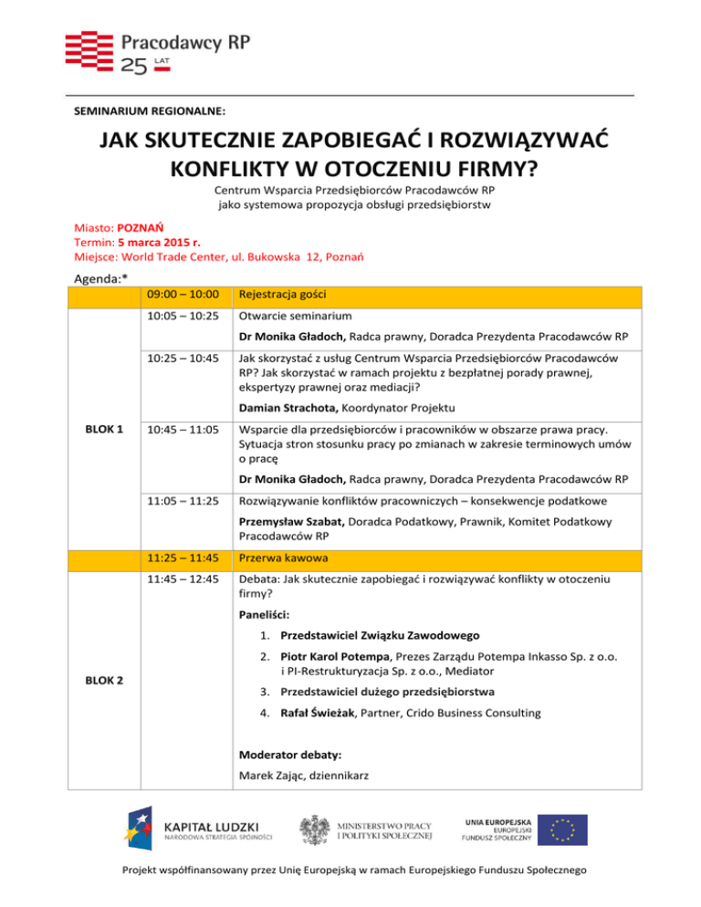 SEMINARIUM REGIONALNE: JAK SKUTECZNIE ZAPOBIEGAĆ I ROZWIĄZYWAĆ KONFLIKTY W OTOCZENIU FIRMY? Centrum Wsparcia Przedsiębiorców Pracodawców RP jako systemowa propozycja obsługi przedsiębiorstw Miasto: POZNAŃ Termin: 5 marca 2015 r. Miejsce: World Trade Center, ul. Bukowska 12, Poznań Agenda:* 09:00 – 10:00 Rejestracja gości 10:05 – 10:25 Otwarcie seminarium Dr Monika Gładoch, Radca prawny, Doradca Prezydenta Pracodawców RP 10:25 – 10:45 Jak skorzystać z usług Centrum Wsparcia Przedsiębiorców Pracodawców RP? Jak skorzystać w ramach projektu z bezpłatnej porady prawnej, ekspertyzy prawnej oraz mediacji? Damian Strachota, Koordynator Projektu BLOK 1 10:45 – 11:05 Wsparcie dla przedsiębiorców i pracowników w obszarze prawa pracy. Sytuacja stron stosunku pracy po zmianach w zakresie terminowych umów o pracę Dr Monika Gładoch, Radca prawny, Doradca Prezydenta Pracodawców RP 11:05 – 11:25 Rozwiązywanie konfliktów pracowniczych – konsekwencje podatkowe Przemysław Szabat, Doradca Podatkowy, Prawnik, Komitet Podatkowy Pracodawców RP 11:25 – 11:45 Przerwa kawowa 11:45 – 12:45 Debata: Jak skutecznie zapobiegać i rozwiązywać konflikty w otoczeniu firmy? Paneliści: 1. Przedstawiciel Związku Zawodowego BLOK 2 2. Piotr Karol Potempa, Prezes Zarządu Potempa Inkasso Sp. z o.o. i PI-Restrukturyzacja Sp. z o.o., Mediator 3. Przedstawiciel dużego przedsiębiorstwa 4. Rafał Świeżak, Partner, Crido Business Consulting Moderator debaty: Marek Zając, dziennikarz Projekt współfinansowany przez Unię Europejską w ramach Europejskiego Funduszu Społecznego Zagadnienia: Jaka jest geneza konfliktów pomiędzy pracodawcami a pracownikami? Z jakimi problemami spotykają się mali i duzi przedsiębiorcy? Czy są to podobne problemy, czy też zupełnie inne? Co można zrobić, by zapobiegać konfliktom na linii pracownik – pracodawca, pracownik – pracownik? W jaki sposób można rozwiązywać konflikty pracownicze? Czy usługi tj. bezpłatne porady, ekspertyzy prawne, mediacje proponowane przez Centrum Wsparcia Przedsiębiorców Pracodawców RP są odpowiedzią na potrzeby pracodawców i pracowników? 12:45 – 13:30 Lunch 13:30 – 14:00 Jak wdrażać w firmie mechanizmy work-life balance? Case study pt.: Prorodzinny przedsiębiorca Symulacja mediacji 14:00 – 14:25 Czym są i jak powinny wyglądać mediacje? Michał Kuszyk, Związek Pracodawców Polskie Miedzi, członek Komisji Trójstronnej, Mediator BLOK 3 14:25 – 14:45 Tło i metody łagodzenia konfliktów w zespole projektowym Michał Siuda, IPMA Polska, Project Manager w projektach z branży IT 14:45 – 15:00 Podsumowanie seminarium Damian Strachota, Koordynator Projektu BLOK 4 15:00 – 15:20 Przerwa kawowa 15:20 – 17:00 Networking – wymiana doświadczeń; podczas tej części wszystkie zainteresowane strony będą mogły spotkać się z zespołem projektowym, który odpowie na pytania związane z udziałem w projekcie. *Pracodawcy RP zastrzegają sobie prawo do zmiany programu seminarium. Projekt współfinansowany przez Unię Europejską w ramach Europejskiego Funduszu Społecznego
