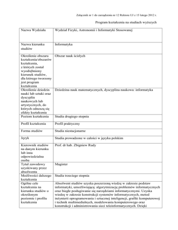 Załącznik nr 1 do zarządzenia nr 12 Rektora UJ z 15 lutego 2012 r. Program kształcenia na studiach wyższych Nazwa Wydziału Wydział Fizyki, Astronomii i Informatyki Stosowanej Nazwa kierunku studiów Informatyka Określenie obszaru Obszar nauk ścisłych kształcenia/obszarów kształcenia, z których został wyodrębniony kierunek studiów, dla którego tworzony jest program kształcenia Określenie dziedzin Dziedzina nauk matematycznych, dyscyplina naukowa: informatyka nauki lub sztuki oraz dyscyplin naukowych lub artystycznych, do których odnoszą się efekty kształcenia Studia drugiego stopnia Poziom kształcenia Profil kształcenia Profil praktyczny Forma studiów Studia niestacjonarne Język Studia prowadzone w całości w języku polskim Kierownik studiów na danym kierunku lub inna odpowiedzialna osoba Tytuł zawodowy uzyskiwany przez absolwenta Możliwości dalszego kształcenia Ogólne cele kształcenia na kierunku studiów o określonym poziomie i profilu kształcenia Prof. dr hab. Zbigniew Rudy Magister Studia trzeciego stopnia Absolwent studiów uzyska poszerzoną wiedzę w zakresie podstaw informatyki, umożliwiającą: algorytmizację problemów informatycznych oraz biegłe posługiwanie się narzędziami informatycznymi. Uzyska wiedzę w zakresie konstrukcji systemów informatycznych, metod inżynierii oprogramowania i sztucznej inteligencji, grafiki komputerowej i technik multimedialnych, modelowania komputerowego oraz konstrukcji i administrowania sieci teleinformatycznych. Dzięki Związek kształcenia na kierunku studiów o określonym poziomie i profilu kształcenia z misją i strategią uczelni Różnice w stosunku do innych programów o podobnie zdefiniowanych celach i efektach kształcenia prowadzonych na uczelni Możliwości zatrudnienia Wymagania wstępne Zasady rekrutacji przyswojonej wiedzy absolwent uzyska wszechstronne narzędzia do zastosowania informatyki przy rozwiązywaniu problemów naukowych, produkcyjnych, militarnych i innych. Uniwersytet jest powołany do kształcenia i wychowywania oraz prowadzenia badań naukowych. Przez swoją działalność i osobisty przykład członków jego społeczności Uniwersytet przygotowuje Ojczyźnie ludzi dojrzałych do samodzielnego rozwiązywania zadań, jakie stwarza współczesne życie, uczestniczy w rozwoju nauki, ochrony zdrowia, sztuki i innych dziedzin kultury, kształci i wychowuje studentów, a także kadrę naukową, zgodnie z ideami humanizmu i tolerancji, w duchu szacunku dla prawdy i sumiennej pracy, poszanowania praw i godności człowieka, patriotyzmu, demokracji, honoru oraz odpowiedzialności za losy Społeczeństwa i Ojczyzny. Kierunek studiów informatyka prowadzony jest przez Uniwersytet Jagielloński również w Wydziale Matematyki i Informatyki. Studia prowadzone przez Wydział FAIS maja profil praktyczny, korzystają z ogromnego doświadczenia Wydziału dotyczącego badań w dziedzinie nauk ścisłych. Absolwent może znaleźć zatrudnienie jako: analityk i projektant systemów informatycznych, konsultant w zakresie informatyzacji obszaru zarządzania w przedsiębiorstwach oraz instytucjach, specjalista programowania systemów informatycznych, administrator systemów komputerowych, pracownik naukowo-badawczy w dziedzinie informatyki stosowanej lub nauk szczegółowych , pracownik laboratoriów i instytutów badawczo-rozwojowych przemysłu i usług, ośrodków meteorologicznych, centrów analiz ekonomicznych, ośrodków badań statystycznych, itp., nauczyciel informatyki (po uzyskaniu dodatkowych uprawnień pedagogicznych). Do podjęcia studiów upoważnione są osoby legitymujące się dyplomem ukończenia studiów wyższych (co najmniej licencjata) na kierunkach informatyka, astronomia, fizyka, matematyka, biofizyka, chemia, fizyka techniczna, studia interdyscyplinarne o charakterze matematycznoprzyrodniczym, inżynierskich, ekonomicznych, zarządzania i bankowości, humanistycznych z elementami informatyki. Podstawą ustalenia listy rankingowej kandydatów są wyniki postępowania kwalifikacyjnego obliczone w oparciu o wynik rozmowy kwalifikacyjnej, który jest liczbą z zakresu od 0 do 100, podaną z dokładnością do dwóch miejsc po przecinku. Szczegółowe informacje dotyczące sposobu ustalania wyników z poszczególnych elementów kryteriów kwalifikacji, a także wszystkie pozostałe informacje o zasadach kwalifikacji na studia II stopnia znajdują się na stronie internetowej http://www.rekrutacja.uj.edu.pl. Szczegółowe informacje dotyczące kwalifikacji (skrót) Rozmowa kwalifikacyjna ma na celu jedynie umożliwienie kandydatowi dodatkowego uściślenia lub wyjaśnienia informacji o zaliczonych kursach, znajdujących się w przesłanej przez niego na etapie rejestracji kserokopii suplementu dyplomu lub wypisu z przebiegu ukończonych studiów. Formuła spotkania nie przewiduje jakiejkolwiek formy sprawdzania wiedzy lub umiejętności kandydata. Liczba punktów ustalana jest wyłącznie na podstawie dokumentacji, jako liczba procent zrealizowanych przez kandydata w ramach ukończonych studiów wyższych treści programowych w odniesieniu do ramowych treści programowych określonych w standardach kształcenia dla kierunku informatyka (http://www.bip.nauka.gov.pl/_gAllery/23/62/2362/45_informatyka.pdf). Liczba punktów ECTS konieczna do uzyskania kwalifikacji Część programu kształcenia realizowana w postaci zajęć dydaktycznych wymagających bezpośredniego udziału nauczycieli akademickich i studentów Łączna liczba punktów ECTS, którą student musi uzyskać na zajęciach wymagających bezpośredniego udziału nauczycieli akademickich i studentów Łączna liczba punktów ECTS, którą student musi uzyskać w ramach zajęć z zakresu nauk podstawowych, do których odnoszą się efekty kształcenia dla określonego kierunku, poziomu i profilu kształcenia Łączna liczba 120 ECTS 1. Na studiach stacjonarnych co najmniej połowa programu kształcenia jest realizowan