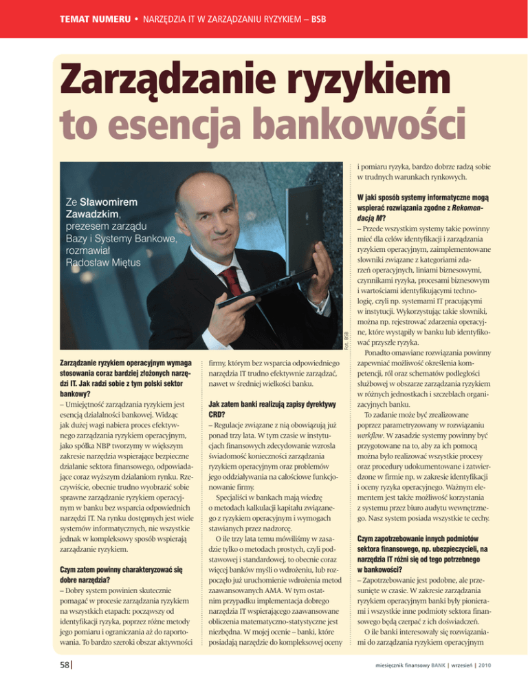 TEMAT NUMERU • Narzędzia IT w zarządzaniu ryzykiem – BSB Zarządzanie ryzykiem to esencja bankowości i pomiaru ryzyka, bardzo dobrze radzą sobie w trudnych warunkach rynkowych. Fot. BSB Ze Sławomirem Zawadzkim, prezesem zarządu Bazy i Systemy Bankowe, rozmawiał Radosław Miętus Zarządzanie ryzykiem operacyjnym wymaga stosowania coraz bardziej złożonych narzędzi IT. Jak radzi sobie z tym polski sektor bankowy? – Umiejętność zarządzania ryzykiem jest esencją działalności bankowej. Widząc jak dużej wagi nabiera proces efektywnego zarządzania ryzykiem operacyjnym, jako spółka NBP tworzymy w większym zakresie narzędzia wspierające bezpieczne działanie sektora finansowego, odpowiadające coraz wyższym działaniom rynku. Rzeczywiście, obecnie trudno wyobrazić sobie sprawne zarządzanie ryzykiem operacyjnym w banku bez wsparcia odpowiednich narzędzi IT. Na rynku dostępnych jest wiele systemów informatycznych, nie wszystkie jednak w kompleksowy sposób wspierają zarządzanie ryzykiem. Czym zatem powinny charakteryzować się dobre narzędzia? – Dobry system powinien skutecznie pomagać w procesie zarządzania ryzykiem na wszystkich etapach: począwszy od identyfikacji ryzyka, poprzez różne metody jego pomiaru i ograniczania aż do raportowania. To bardzo szeroki obszar aktywności 58| firmy, którym bez wsparcia odpowiedniego narzędzia IT trudno efektywnie zarządzać, nawet w średniej wielkości banku. Jak zatem banki realizują zapisy dyrektywy CRD? – Regulacje związane z nią obowiązują już ponad trzy lata. W tym czasie w instytucjach finansowych zdecydowanie wzrosła świadomość konieczności zarządzania ryzykiem operacyjnym oraz problemów jego oddziaływania na całościowe funkcjonowanie firmy. Specjaliści w bankach mają wiedzę o metodach kalkulacji kapitału związanego z ryzykiem operacyjnym i wymogach stawianych przez nadzorcę. O ile trzy lata temu mówiliśmy w zasadzie tylko o metodach prostych, czyli podstawowej i standardowej, to obecnie coraz więcej banków myśli o wdrożeniu, lub rozpoczęło już uruchomienie wdrożenia metod zaawansowanych AMA. W tym ostatnim przypadku implementacja dobrego narzędzia IT wspierającego zaawansowane obliczenia matematyczno-statystyczne jest niezbędna. W mojej ocenie – banki, które posiadają narzędzie do kompleksowej oceny W jaki sposób systemy informatyczne mogą wspierać rozwiązania zgodne z Rekomendacją M? – Przede wszystkim systemy takie powinny mieć dla celów identyfikacji i zarządzania ryzykiem operacyjnym, zaimplementowane słowniki związane z kategoriami zdarzeń operacyjnych, liniami biznesowymi, czynnikami ryzyka, procesami biznesowym i wartościami identyfikującymi technologię, czyli np. systemami IT pracującymi w instytucji. Wykorzystując takie słowniki, można np. rejestrować zdarzenia operacyjne, które wystąpiły w banku lub identyfikować przyszłe ryzyka. Ponadto omawiane rozwiązania powinny zapewniać możliwość określenia kompetencji, ról oraz schematów podległości służbowej w obszarze zarządzania ryzykiem w różnych jednostkach i szczeblach organizacyjnych banku. To zadanie może być zrealizowane poprzez parametryzowany w rozwiązaniu workflow. W zasadzie systemy powinny być przygotowane na to, aby za ich pomocą można było realizować wszystkie procesy oraz procedury udokumentowane i zatwierdzone w firmie np. w zakresie identyfikacji i oceny ryzyka operacyjnego. Ważnym elementem jest także możliwość korzystania z systemu przez biuro audytu wewnętrznego. Nasz system posiada wszystkie te cechy. Czym zapotrzebowanie innych podmiotów sektora finansowego, np. ubezpieczycieli, na narzędzia IT różni się od tego potrzebnego w bankowości? – Zapotrzebowanie jest podobne, ale przesunięte w czasie. W zakresie zarządzania ryzykiem operacyjnym banki były pionierami i wszystkie inne podmioty sektora finansowego będą czerpać z ich doświadczeń. O ile banki interesowały się rozwiązaniami do zarządzania ryzykiem operacyjnym miesięcznik finansowy bank | wrzesień | 2010 Narzędzia IT w zarządzaniu ryzykiem • TEMAT NUMERU już 4–5 lat temu, to instytucje z sektora ubezpieczeniowego zaczynają o tym poważnie myśleć dopiero teraz. Wynika to oczywiście z terminów wprowadzenia w życie odpowiednich regulacji oraz uwarunkowań zewnętrznych związanych np. z kryzysem finansowym. Zarówno w bankach, jak i towarzystwach ubezpieczeniowych istnieją podobne metody identyfikacji, pomiaru i ograniczania ryzyka, co powoduje, że wdrażane może być w tych podmiotach to samo narzędzie, oczywiście z uwzględnieniem specyfiki poszczególnych organizacji. celów w procesach biznesowych banku oraz wzrost zaufania klientów do banku. Oczywiście wdrożenie takiego rozwiązania znacznie skraca czas potrzebny na realizację zadań związanych z samym zarządzaniem ryzykiem operacyjnym oraz poprawę jakości wykonania tych zadań, przy zwiększonej kontroli wykorzystywanych zasobów. Chcę w tym miejscu zaznaczyć, że systemy zarządzania ryzykiem odgrywają coraz większą rolę w eliminacji obszarów przynoszących straty i w dużej mierze wspomagają proces budowania wartości marki. Które z etapów zarządzania ryzykiem wspomagają narzędzia IT? – Chcę jeszcze raz podkreślić, że dobre narzędzie IT w zakresie zarządzania ryzykiem operacyjnym powinno wspierać proces zarządzania ryzykiem na wszystkich jego etapach. Powinno automatyzować rejestrację informacji o zdarzeniach operacyjnych, pomiar i ocenę ryzyka oraz wdrażanie i monitorowanie działań zaradczych służących jego ograniczaniu. W każdym przypadku użytkownik, któremu w ramach systemu przydzielono do wykonania konkretne zadanie związane z ryzykiem operacyjnym, powinien być dodatkowo informowany o tym np. poprzez dostarczenie wiadomości e-mailowej. To znacznie podwyższa sprawność przepływu informacji w ramach systemu, co przekłada się wpros
