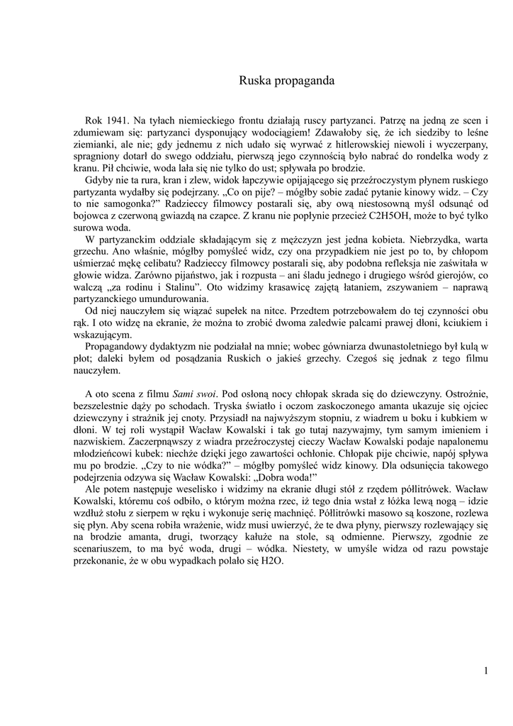Ruska propaganda Rok 1941. Na tyłach niemieckiego frontu działają ruscy partyzanci. Patrzę na jedną ze scen i zdumiewam się: partyzanci dysponujący wodociągiem! Zdawałoby się, że ich siedziby to leśne ziemianki, ale nie; gdy jednemu z nich udało się wyrwać z hitlerowskiej niewoli i wyczerpany, spragniony dotarł do swego oddziału, pierwszą jego czynnością było nabrać do rondelka wody z kranu. Pił chciwie, woda lała się nie tylko do ust; spływała po brodzie. Gdyby nie ta rura, kran i zlew, widok łapczywie opijającego się przeźroczystym płynem ruskiego partyzanta wydałby się podejrzany. „Co on pije? – mógłby sobie zadać pytanie kinowy widz. – Czy to nie samogonka?” Radzieccy filmowcy postarali się, aby ową niestosowną myśl odsunąć od bojowca z czerwoną gwiazdą na czapce. Z kranu nie popłynie przecież C2H5OH, może to być tylko surowa woda. W partyzanckim oddziale składającym się z mężczyzn jest jedna kobieta. Niebrzydka, warta grzechu. Ano właśnie, mógłby pomyśleć widz, czy ona przypadkiem nie jest po to, by chłopom uśmierzać mękę celibatu? Radzieccy filmowcy postarali się, aby podobna refleksja nie zaświtała w głowie widza. Zarówno pijaństwo, jak i rozpusta – ani śladu jednego i drugiego wśród gierojów, co walczą „za rodinu i Stalinu”. Oto widzimy krasawicę zajętą łataniem, zszywaniem – naprawą partyzanckiego umundurowania. Od niej nauczyłem się wiązać supełek na nitce. Przedtem potrzebowałem do tej czynności obu rąk. I oto widzę na ekranie, że można to zrobić dwoma zaledwie palcami prawej dłoni, kciukiem i wskazującym. Propagandowy dydaktyzm nie podziałał na mnie; wobec gówniarza dwunastoletniego był kulą w płot; daleki byłem od posądzania Ruskich o jakieś grzechy. Czegoś się jednak z tego filmu nauczyłem. A oto scena z filmu Sami swoi. Pod osłoną nocy chłopak skrada się do dziewczyny. Ostrożnie, bezszelestnie dąży po schodach. Tryska światło i oczom zaskoczonego amanta ukazuje się ojciec dziewczyny i strażnik jej cnoty. Przysiadł na najwyższym stopniu, z wiadrem u boku i kubkiem w dłoni. W tej roli wystąpił Wacław Kowalski i tak go tutaj nazywajmy, tym samym imieniem i nazwiskiem. Zaczerpnąwszy z wiadra przeźroczystej cieczy Wacław Kowalski podaje napalonemu młodzieńcowi kubek: niechże dzięki jego zawartości ochłonie. Chłopak pije chciwie, napój spływa mu po brodzie. „Czy to nie wódka?” – mógłby pomyśleć widz kinowy. Dla odsunięcia takowego podejrzenia odzywa się Wacław Kowalski: „Dobra woda!” Ale potem następuje weselisko i widzimy na ekranie długi stół z rzędem półlitrówek. Wacław Kowalski, któremu coś odbiło, o którym można rzec, iż tego dnia wstał z łóżka lewą nogą – idzie wzdłuż stołu z sierpem w ręku i wykonuje serię machnięć. Półlitrówki masowo są koszone, rozlewa się płyn. Aby scena robiła wrażenie, widz musi uwierzyć, że te dwa płyny, pierwszy rozlewający się na brodzie amanta, drugi, tworzący kałuże na stole, są odmienne. Pierwszy, zgodnie ze scenariuszem, to ma być woda, drugi – wódka. Niestety, w umyśle widza od razu powstaje przekonanie, że w obu wypadkach polało się H2O. 1