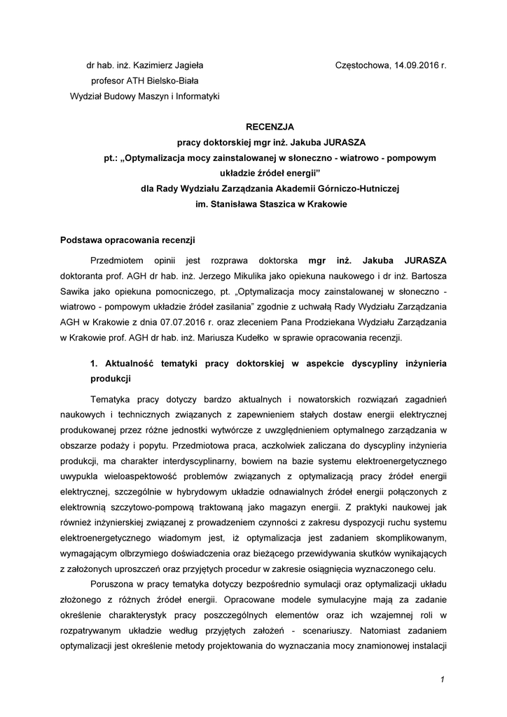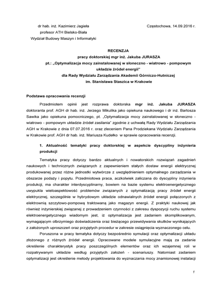 dr hab. inż. Kazimierz Jagieła Częstochowa, 14.09.2016 r. profesor ATH Bielsko-Biała Wydział Budowy Maszyn i Informatyki RECENZJA pracy doktorskiej mgr inż. Jakuba JURASZA pt.: „Optymalizacja mocy zainstalowanej w słoneczno - wiatrowo - pompowym układzie źródeł energii” dla Rady Wydziału Zarządzania Akademii Górniczo-Hutniczej im. Stanisława Staszica w Krakowie Podstawa opracowania recenzji Przedmiotem opinii jest rozprawa doktorska mgr inż. Jakuba JURASZA doktoranta prof. AGH dr hab. inż. Jerzego Mikulika jako opiekuna naukowego i dr inż. Bartosza Sawika jako opiekuna pomocniczego, pt. „Optymalizacja mocy zainstalowanej w słoneczno wiatrowo - pompowym układzie źródeł zasilania” zgodnie z uchwałą Rady Wydziału Zarządzania AGH w Krakowie z dnia 07.07.2016 r. oraz zleceniem Pana Prodziekana Wydziału Zarządzania w Krakowie prof. AGH dr hab. inż. Mariusza Kudełko w sprawie opracowania recenzji. 1. Aktualność tematyki pracy doktorskiej w aspekcie dyscypliny inżynieria produkcji Tematyka pracy dotyczy bardzo aktualnych i nowatorskich rozwiązań zagadnień naukowych i technicznych związanych z zapewnieniem stałych dostaw energii elektrycznej produkowanej przez różne jednostki wytwórcze z uwzględnieniem optymalnego zarządzania w obszarze podaży i popytu. Przedmiotowa praca, aczkolwiek zaliczana do dyscypliny inżynieria produkcji, ma charakter interdyscyplinarny, bowiem na bazie systemu elektroenergetycznego uwypukla wieloaspektowość problemów związanych z optymalizacją pracy źródeł energii elektrycznej, szczególnie w hybrydowym układzie odnawialnych źródeł energii połączonych z elektrownią szczytowo-pompową traktowaną jako magazyn energii. Z praktyki naukowej jak również inżynierskiej związanej z prowadzeniem czynności z zakresu dyspozycji ruchu systemu elektroenergetycznego wiadomym jest, iż optymalizacja jest zadaniem skomplikowanym, wymagającym olbrzymiego doświadczenia oraz bieżącego przewidywania skutków wynikających z założonych uproszczeń oraz przyjętych procedur w zakresie osiągnięcia wyznaczonego celu. Poruszona w pracy tematyka dotyczy bezpośrednio symulacji oraz optymalizacji układu złożonego z różnych źródeł energii. Opracowane modele symulacyjne mają za zadanie określenie charakterystyk pracy poszczególnych elementów oraz ich wzajemnej roli w rozpatrywanym układzie według przyjętych założeń - scenariuszy. Natomiast zadaniem optymalizacji jest określenie metody projektowania do wyznaczania mocy znamionowej instalacji 1 fotowoltaicznej oraz turbin wiatrowych, która pozwoli na zrealizowanie określonych funkcji celu. W rozprawie doktorskiej za funkcję celu przyjęto minimalizację wymiany energii pomiędzy układem źródeł PV-TW-ESP oraz korzystającym z nich odbiorcą a krajowym systemem elektroenergetycznym. Oznacza to w praktyce, iż wobec producenta energii elektrycznej pochodzącej z układu PV-TW-ESP zarówno konsument zużywający określony wolumen energii jak i operator systemu elektroenergetycznego stawiają pewne wymagania co do ilości i jakości dostarczonej energii. Recenzowana praca doktorska porusza zagadnienia zawarte w czterech następujących obszarach: • Organizacja i zarządzanie produkcjami i usługami – w pracy podjęto problem organizacji procesu wytwarzania energii pod kątem roli i zadań poszczególnych źródeł energii; • Systemy wspomagania decyzji. Zarządzanie wiedzą produkcyjną – w rozprawie przedstawiono modele matematyczne dla określonych pięciu scenariuszy służące do wspomagania w procesie podejmowania decyzji; • Prognozowanie w przedsiębiorstwie. Modelowanie i symulacja komputerowa – w dysertacji zbudowano model symulacyjny odwzorowujący proces produkcyjny polegający na wytwarzaniu energii elektrycznej w układzie hybrydowym typu PV-TW-ESP. Konstrukcja takiego modelu pozwala na dokonanie analizy roli poszczególnych elementów procesu/systemu oraz zbadanie wpływu poszczególnych zmiennych na kompleksowe funkcjonowanie w ujęciu globalnym; • Optymalizacja łańcuchów dostaw i logistyka – według Komitetu Inżynierii Produkcji (KIP) nacisk w tym obszarze położony jest na symulację i optymalizację przepływu materiałów (w przypadku recenzowanej pracy rolę materiałów przejmuje energia elektryczna krążąca w hybrydowym układzie organizacyjnym PV-TW-ESP) w celu dostarczenia i zaspokojenia odbiorcy w oczekiwane dobro. Należy również podkreślić, iż w pracy podjęto zagadnienie ciągłości procesu rozumiane tutaj jako ciągłość dostaw określonego wolumenu energii elektrycznej – pojęcie niezawodności dostaw energii elektrycznej. 2. Charakterystyka i ocena merytoryczna rozprawy doktorskiej Rozprawa liczy łącznie 183 strony i podzielona została na pięć zasadniczych rozdziałów uzupełnionych spisem bibliograficznym (rozdział szósty) oraz załącznikiem będącym zbiorem uzyskanych wyników, który obejmuje 32 strony dla pięciu przyjętych scenariuszy do opracowanych modeli optymalizacyjnych. Cytowana literatura zamieszczona w spisie bibliograficznym zawiera 166 pozycji publikacji krajowych i zagranicznych, przepisów prawnych oraz stron www, w tym 6 publikacji Doktoranta: współautorskich - 5 i samodzielnych - 1. Przed rozdziałem "Wprowadzenie" Autor na pierwszych trzech stronach zamieszcza wykazy oznaczeń i skrótów oraz oznaczeń dla przyjętych modeli matematycznych. Dalej bardzo staranie prezentuje krótkie streszczenia napisane w języku polskim, angielskim i niemieckim. 2 Rozdział pierwszy to „Wprowadzenie”, w którym Autor na bazie krótkiego syntetycznego opisu integracji niedyspozycyjnych komplementarnych odnawialnych źródeł energii z krajowym systemem energetycznym współpracującym z magazynami energii (elektrowniami szczytowopompowymi) prezentuje cztery zasadnicze cele pracy, które stanowią fundament do udowodnienia postawionej hipotezy o brzmieniu: " Metoda prz