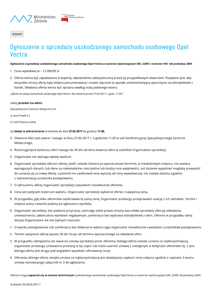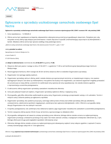 10.02.2017 Ogłoszenie o sprzedaży uszkodzonego samochodu osobowego Opel Vectra Ogłoszenie o sprzedaży uszkodzonego samochodu osobowego Opel Vectra o numerze rejestracyjnym DKL 22WE i numerze VIN rok produkcji 2005 1. Cena wywoławcza – 12 000,00 zł 2. Oferta winna być zapakowana w kopertę, odpowiednio zabezpieczoną przed jej przypadkowym otwarciem. Pożądane jest, aby wszystkie strony oferty były kolejno ponumerowane i trwale złączone w sposób uniemożliwiający wysunięcie się którejkolwiek z kartek. Składana oferta winna być opisana według niżej podanego wzoru: „Oferta na zakup samochodu osobowego Opel Vectra. Nie otwierać przed 27.02.2017 r. godz. 11.00 .” należy przesłać na adres: Specjalistyczne Centrum Medyczne S.A. ul. Jana Pawła II 2 57-320 Polanica-Zdrój lub złożyć w sekretariacie w terminie do dnia 27.02.2017 do godziny 11.00. 3. Otwarcie ofert jest jawne i nastąpi w dniu 27.02.2017 r. o godzinie 11.00 w sali konferencyjnej Specjalistycznego Centrum Medycznego. 4. Rozstrzygnięcie konkursu ofert nastąpi do 30 dni od dnia otwarcia ofert w siedzibie Organizatora sprzedaży 5. Organizator nie wymaga wpłaty wadium. 6. Organizator sprzedaży odrzuci ofertę, jeżeli: została złożona po wyznaczonym terminie, w niewłaściwym miejscu; nie zawiera wymaganych danych, lub dane są niekompletne, nieczytelne lub budzą inne wątpliwości, zaś złożenie wyjaśnień mogłoby prowadzić do uznania jej za nową ofertę; uczestnik nie zaoferował ceny wyższej od ceny wywoławczej; nie została złożona zgodnie z reprezentacją uczestnika postępowania. 7. O odrzuceniu oferty organizator sprzedaży zawiadomi niezwłocznie oferenta. 8. Cena jest jedynym kryterium wyboru. Organizator sprzedaży wybierze ofertę z najwyższą ceną. 9. W przypadku, gdy kilku oferentów zaoferowało tę samą cenę, Organizator przetargu przeprowadzi aukcję z ich udziałem. Termin i miejsce aukcji zostanie podany po ogłoszeniu wyników. 10. Organizator sprzedaży, bez podania przyczyny, zastrzega sobie prawo zmiany warunków sprzedaży albo jej odwołania, unieważnienia, zakończenia wynikiem negatywnym, zamknięcia bez wybrania którejkolwiek z ofert. Oferent w przypadku takiej decyzji Organizatora nie ma żadnych roszczeń. 11. O wyniku postępowania, lub zamknięciu bez dokonania wyboru jego organizator niezwłocznie zawiadomi uczestników postępowania. 12. Termin związania ofertą wynosi 30 dni licząc od terminu wyznaczonego na składanie ofert. 13. W przypadku odstąpienia od zawarcia umowy sprzedaży przez oferenta, którego oferta została uznana za najkorzystniejszą, organizator przetargu unieważnia przetarg w tej części lub może zawrzeć umowę z następnym w kolejności oferentem (tj. z tym, którego oferta jest druga pod względem wysokości oferowanej ceny) 14. Oferenta, którego oferta została uznana za najkorzystniejszą jest obowiązany zapłacić cenę nabycia zgodnie z zapisami 3 wzoru umowy stanowiącego załącznik nr 3 do ogłoszenia. Oferenci mogą zapoznać się ze stanem technicznym uszkodzonego samochodu osobowego Opel Vectra o numerze rejestracyjnym DKL 22WE rok produkcji 2005: w dniach 20-24.02.2017 r w godzinach 800 – 1500 w Specjalistycznym Centrum Medycznym S.A. ul. Jana Pawła II 2 w Polanicy-Zdroju, po uprzednim uzgodnieniu z Panią Dominiką Tust-Kopeć tel: 748 621 146 Oferta powinna zawierać 1. Osoby fizyczne przystępujące do postępowania wraz z ofertą winny załączyć kopię dowodu osobistego. Osoby lub podmioty prowadzące działalność gospodarczą wraz z ofertą zobowiązani są załączyć aktualne zaświadczenie o wpisie do ewidencji działalności gospodarczej lub odpis z KRS-u; 2. Wypełniony formularz ofertowy stanowiący załącznik nr 1 do ogłoszenia o sprzedaży; 3. Oświadczenie oferenta, że zapoznał się z warunkami sprzedaży i przyjmuje te warunki bez zastrzeżeń stanowiący załącznik nr 2 do ogłoszenia o sprzedaży; 4. Zaakceptowany wzór umowy sprzedaży stanowiący załącznik nr 3 do ogłoszenia o sprzedaży. Szczegółowe informacje dotyczące oferty w załączeniu. Pliki do pobrania: Ogłoszenie o sprzedaży uszkodzonego samochodu osobowego Opel Vectra 892,0 KB DOC File Ministerstwo Zdrowia dokłada wszelkich starań, aby zawarte w tym miejscu dane były rzetelne, wyczerpujące i aktualne. Jednak mają one charakter wyłącznie informacyjny i nie mogą stanowić podstawy do jakichkolwiek roszczeń. Jeżeli opublikowany artykuł nie może zostać prawidłowo odczytany przez czytnik ekranu, prosimy o zgłoszenie tego poprzez przycisk „Zgłoś uwagę do artykułu”. Postaramy się jak najszybciej udostępnić bardziej czytelny plik dla osób korzystających z czytników ekranu. Opublikowany przez: Data publikacji: Rafał Babraj 10.02.2017 13:32 Ostatnio zmieniony przez: Data ostatniej zmiany: Rafał Babraj 10.02.2017 13:36