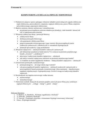 Ćwiczenie K KOMPUTEROWA SYMULACJA IMPULSU NERWOWEGO 1. Podstawowe pojęcia i prawa opisujące własności układów przewodzących sygnały elektryczne (opór elektryczny, przewodnictwo, natężenie, napięcie elektryczne, prawo Ohma, natężenie pola elektrycznego, pojemność elektryczna). 2. Budowa neuronu, aksony melinowane i niemelinowane. przypisanie poszczególnym częściom składowym (dendryty, ciało komórki i akson) ich roli w funkcjonowaniu neuronu. 3. Własności elektryczne błony i potencjał błonowy selektywność błony definicja potencjału błonowego rola pojemności elektrycznej błony pojęcie potencjału równowagowego i jego wartości dla poszczególnych jonów (sodowych, potasowych i chlorkowych) w warunkach fizjologicznych potencjał spoczynkowy i jego pochodzenie 4. Własności napięciowo – zależnych kanałów sodowych i potasowych jak funkcjonuje pojedynczy kanał jonowy? Co oznacza na poziomie pojedynczego kanału „otwarcie” i „zamknięcie”? aktywacja i inaktywacja kanałów napięciowo – zależnych jak należy rozumieć napięciową zależność na poziomie pojedynczego kanału? co wiadomo na temat zagadnienia struktura – funkcja kanałów napięciowo – zależnych? 5. Generowanie potencjału czynnościowego potencjał progowy – od czego zależy jego wartość? rola poszczególnych kanałów napięciowo – zależnych (sodowych i potasowych) w poszczególnych fazach potencjału czynnościowego: (faza narastania – depolaryzacja), opadania (repolaryzacja) i hyperpolaryzacja. Zwrócić uwagę na inaktywację kanałów sodowych. 6. Rozchodzenie się impulsu nerwowego wzdłuż aksonu: melinowanego niemelinowanego 7. Omówienie technik służących do pomiaru prądów jonowych przez błony przy ustalonym napięciu błonowych – „voltage – clamp” i „patch – clamp”. Zalecana literatura: 1. S. Miękisz, A. Hendrich; „Wybrane zagadnienia z biofizyki” 2. A. Pilawski; „Podstawy biofizyki” 3. Z. Traczyk; „Fizjologia człowieka z elementami fizjologii stosowanej i klinicznej” 4. Giese; „Fizjologia komórki” Uniwersytet Medyczny we Wrocławiu Katedra Biofizyki Zakład Biofizyki Ćwiczenie 10 Komputerowa symulacja potencjału czynnościowego aksonu Podpis prowadzącego ćwiczenia ............................................................. ............................................................ Imię i nazwisko studenta Wydział: Data Stopień zaliczenia Grupa studencka: Grupa ćwiczeniowa: I. ELEKTROFIZJOLOGIA IMPULSU NERWOWEGO 1. Przerysować na papierze milimetrowym kształt krzywej pobudzenia dla komórki w warunkach standardowych. 2. Dla podanych w Tabeli 1 wartości cm zmierzyć wartość progową prądu pobudzającego (z dokładnością do 0.5 µA). Przerysować na papier milimetrowy przykład krzywej bez wzbudzenia potencjału czynnościowego. 3. Przyjmując cm= 2 mF/cm2 oraz I = 30 µA/cm2 zwiększać T2 co 0.05 ms aż do wartości, przy której będzie ponownie generowany potencjał czynnościowy. 4. Wartość T2 znalezioną w punkcie 3 pomniejszyć o 0.1 ms i następnie zwiększać wartość V m tak, by był generowany ponownie potencjał czynnościowy. Vm [mV] -60 -60 -60 cm [mF/cm2] 1.0 2.0 2.0 2.0 Tabela 1 I T2 [µA/cm2] [ms] 1.5 1.5 30.0 30.0 Vmax [mV] Tmax [ms] Po wypełnieniu tabeli powrócić do wartości standardowych. II. FARMAKOKINETYKA IMPULSU NERWOWEGO 5. Znaleźć minimalne stężenie TTX blokujące powstawanie potencjału czynnościowego i parametry otrzymanej w tym przypadku krzywej wpisać do 1-go wiersza Tabeli 2. 6. Przy uzyskanym w punkcie 5 stężeniu TTX zmniejszać przewodnictwo kanałów potasowych gK bezpośrednio albo zmieniać TEA, tak aby ponownie generowany był potencjał czynnościowy. Parametry otrzymanej w tym przypadku krzywej wpisać do wiersza 2 Tabeli 2. 7. Powrócić do wielkości standardowych. Używając różnych stężeń TEA zbadać jak toksyna ta wpływa na przebieg potencjału czynnościowego. Przykładową symulację wpisać do wiersza 3 Tabeli 2, a odpowiadającą jej krzywą przerysować na papier milimetrowy. Stężenie [nM] TTX-1 TTX-2 TEA-1 TEA-2 TEA-3 Tabela 2 gNa gK [mS/cm2] [mS/cm2] Vmax [mV] - Tmax [ms] -