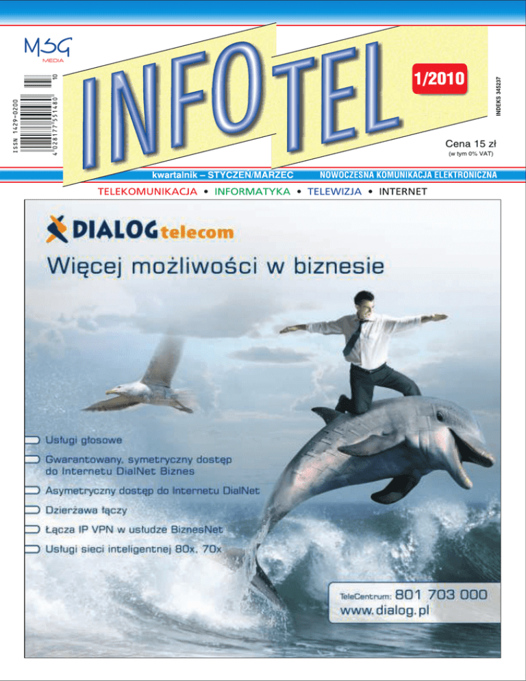 SPIS TREŒCI Warto wiedzieæ, ¿e... ..................................................................................................... 6–9 Telekomunikacja INDEKS 345237 numer 1 (105), rok dziesi¹ty styczeñ/marzec 2010 PL ISSN 1429-0200 Cena 15 z³ (w tym 0% VAT) Nak³ad: 10 000 egz. Wydawca: MSG Rynek dla u¿ytkowników, a nie dla urzêdników........................................................... 10 Realny problem niewykorzystania œrodków UE XXI Targi INTERTELECOM 2010 .............................................................................. 12–13 Najwiêksza w Europie Œrodkowo-Wschodniej impreza bran¿y IT Wolnoœæ wyboru ....................................................................................................... 14–15 Udany rok Netii Z operatora infrastrukturalnego do telekomunikacyjnego ......................................... 16 Konwergentne by³y ju¿ scyzoryki MEDIA MSG – Media s.c. M. Kantowicz, G. Kantowicz ul. Chwytowo 2, 85-223 Bydgoszcz tel. 052 325 83 10; fax 052 373 52 43 e-mail: [email protected] www.msgmedia.pl www.techbox.pl Nadszed³ czas telewizji cyfrowej ................................................................................... 17 Us³ugi interaktywne stwarzaj¹ nowe mo¿liwoœci Rada programowa Przewodnicz¹cy: prof. dr hab. in¿. Ryszard S. Choraœ – Uniwersytet Technologiczno-Przyrodniczy Bydgoszcz Cz³onkowie: prof. dr hab. in¿. Daniel Józef Bem – Politechnika Wroc³awska, prof. dr hab. in¿. Andrzej Dobrogowski – Politechnika Poznañska, prof. dr hab. in¿. Andrzej Jajszczyk – Akademia Górniczo-Hutnicza Kraków, prof. dr hab. Józef Modelski – Politechnika Warszawska, dr in¿. Marian Molski – Uniwersytet Technologiczno-Przyrodniczy Bydgoszcz, prof. dr hab. in¿. Józef WoŸniak – Politechnika Gdañska. Nowe multipleksery LANEX-u........................................................................................ 24 Optymalizacja w sieciach dostêpowych Dyrektor wydawnictwa Marek Kantowicz tel. 052 325 83 11; kom. 509 767 051 e-mail: [email protected] Redaktor naczelny Grzegorz Kantowicz tel. 052 325 83 11; kom. 501 022 030 e-mail: [email protected] Oddzia³ redakcji w Warszawie ul. Rostworowskiego 34/13, 01-496 Warszawa tel. 022 685 52 05 Mieczys³aw Borkowski, kom. 696 07 75 63 e-mail: [email protected] [email protected] Adam Koz³owski Wykorzystanie portali spo³ecznoœciowych w firmach ...........................................30–31 Wycieki danych i brak polityki bezpieczeñstwa Korekta Ewa Winiecka Marketing Janusz Fornalik tel. 052 325 83 17; kom. 501 081 200 fax 052 325 83 29 e-mail: [email protected] DTP: Czes³aw Winiecki tel. 052 325 83 14; kom. 728 496 599 e-mail: [email protected] Redakcja zastrzega sobie prawo skracania i adiustacji materia³ów. Materia³y nie zamawiane nie bêd¹ zwracane. Wszystkie materia³y objête s¹ prawem autorskim. Przedruk artyku³ów tylko za zgod¹ redakcji. Redakcja nie ponosi odpowiedzialnoœci za treœæ reklam i ma prawo odmówiæ publikacji bez podania przyczyny. Druk: Drukarnia ABEDIK Sp. z o.o. 85-861 Bydgoszcz, ul. Glinki 84 tel./fax 052 370 07 10 e-mail: [email protected]; http://www.abedik.pl Grzegorz Kantowicz Najnowsze trendy na targach CeBIT 2010.............................................................. 18–22 Z lotu ptaka nad CeBIT-em Altar IVVR – nowe spojrzenie na komunikacjê ............................................................ 23 Telefoniczna platforma œwiadczenia us³ug wideo Przemys³aw Misiak Kierunki rozwoju sieci operatorskich ........................................................................... 26 Protokó³ IP lub ramki Ethernet Grzegorz Kantowicz Perspektywy na 2010 rok ............................................................................................... 27 Rynek telekomunikacyjny w Polsce Grzegorz Kantowicz Inteligentny dom dla Kowalskiego ................................................................................ 28 Homebox: rewolucyjna oferta w dziedzinie i-bezpieczeñstwa, i-domotyki oraz i-energii Grzegorz Kantowicz Kolejny krok do IPv6....................................................................................................... 29 Wytyczanie standardów wydajnoœci systemów bezpieczeñstwa w sieciach IPv6 MIIMÔ – nowa jakoœæ w zarz¹dzaniu sieci¹ ..................................................................32 Telewizja Grzegorz Kantowicz aMazing – pierwszy interaktywny kana³ telewizyjny ................................................... 34 Nowe mo¿liwoœci telewizji cyfrowej Edyta Kosowska Bitwa o klienta na polskim rynku triple play ................................................................ 35 Plany inwestycyjne najwiêkszych operatorów kablowych Informatyka Grzegorz Kantowicz E-Pañstwo a Polska... ............................................................................................... 36–39 Diagnoza stanu polskiej administracji elektronicznej Marta Redziñska Webusability w firmie ..................................................................................................... 40 Przyjazne stront WWW Grzegorz Kantowicz Technologia AIR na urz¹dzenia przenoœne ...................................................................41 Nowe narzêdzia programistyczne na urz¹dzenia przenoœne Internet Grzegorz Kantowicz Handel fa³szywymi kartami kredytowymi kwitnie .................................................. 42–43 Przestêpcy wychodz¹ z podziemia Grzegorz Kantowicz Dzieci maj¹ dostêp do szkodliwych treœci ............................................................. 43–44 Z³a strona Internetu Grzegorz Kantowicz Jak bezpiecznie „tweetowaæ” ........................................................................................ 45 10 porad dla bloggerów PROGRAM IX Kongres INFOTELA „KOMUNIKACJA ELEKTRONICZNA – KONWERGENCJA US£UG; INTEGRACJA LUDZI” 13–14 kwietnia 2010 roku, sala kongresowa: hala MOSiR, ul. Stefanow