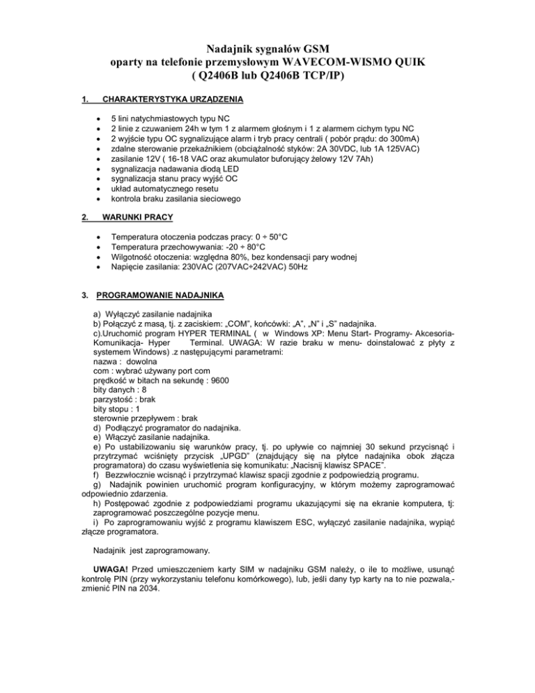 Nadajnik sygnałów GSM oparty na telefonie przemysłowym WAVECOM-WISMO QUIK ( Q2406B lub Q2406B TCP/IP) 1. CHARAKTERYSTYKA URZĄDZENIA • • • • • • • • • 2. 5 lini natychmiastowych typu NC 2 linie z czuwaniem 24h w tym 1 z alarmem głośnym i 1 z alarmem cichym typu NC 2 wyjście typu OC sygnalizujące alarm i tryb pracy centrali ( pobór prądu: do 300mA) zdalne sterowanie przekaźnikiem (obciążalność styków: 2A 30VDC, lub 1A 125VAC) zasilanie 12V ( 16-18 VAC oraz akumulator buforujący żelowy 12V 7Ah) sygnalizacja nadawania diodą LED sygnalizacja stanu pracy wyjść OC układ automatycznego resetu kontrola braku zasilania sieciowego WARUNKI PRACY • • • • Temperatura otoczenia podczas pracy: 0 ÷ 50°C Temperatura przechowywania: -20 ÷ 80°C Wilgotność otoczenia: względna 80%, bez kondensacji pary wodnej Napięcie zasilania: 230VAC (207VAC÷242VAC) 50Hz 3. PROGRAMOWANIE NADAJNIKA a) Wyłączyć zasilanie nadajnika b) Połączyć z masą, tj. z zaciskiem: „COM”, końcówki: „A”, „N” i „S” nadajnika. c).Uruchomić program HYPER TERMINAL ( w Windows XP: Menu Start- Programy- AkcesoriaKomunikacja- Hyper Terminal. UWAGA: W razie braku w menu- doinstalować z płyty z systemem Windows) .z następującymi parametrami: nazwa : dowolna com : wybrać używany port com prędkość w bitach na sekundę : 9600 bity danych : 8 parzystość : brak bity stopu : 1 sterownie przepływem : brak d) Podłączyć programator do nadajnika. e) Włączyć zasilanie nadajnika. e) Po ustabilizowaniu się warunków pracy, tj. po upływie co najmniej 30 sekund przycisnąć i przytrzymać wciśnięty przycisk „UPGD” (znajdujący się na płytce nadajnika obok złącza programatora) do czasu wyświetlenia się komunikatu: „Nacisnij klawisz SPACE”. f) Bezzwłocznie wcisnąć i przytrzymać klawisz spacji zgodnie z podpowiedzią programu. g) Nadajnik powinien uruchomić program konfiguracyjny, w którym możemy zaprogramować odpowiednio zdarzenia. h) Postępować zgodnie z podpowiedziami programu ukazującymi się na ekranie komputera, tj: zaprogramować poszczególne pozycje menu. i) Po zaprogramowaniu wyjść z programu klawiszem ESC, wyłączyć zasilanie nadajnika, wypiąć złącze programatora. Nadajnik jest zaprogramowany. UWAGA! Przed umieszczeniem karty SIM w nadajniku GSM należy, o ile to możliwe, usunąć kontrolę PIN (przy wykorzystaniu telefonu komórkowego), lub, jeśli dany typ karty na to nie pozwala,zmienić PIN na 2034. 4. Funkcja alarmowej. centralki alarmowej lub nadajnika podłączanego do zewnętrznej centralki Nadajnik może spełniać funkcję prostej centrali alarmowej. Do dyspozycji mamy pięć linii natychmiastowych (L1,L2,L3,L4,L5), całodobową cichą (S), całodobową głośną (24), wejście (B) przełączające tryb pracy: NOC/DZIEŃ. Za pomocą wyjść OC możemy sterować syrenę alarmową (OUT1),sygnalizować uzbrojenie / rozbrojenie objektu (OUT2) .Programowanie trybu pracy następuje przez odpowiednie zaprogramowanie przez programator RS i program komunikacyjny HYPER TERMINAL zawarty w systemie WINDOWS. Czas działania syreny alarmowej to ~90 sekund 5. Podłączanie urządzeń zewnętrznych. Uwaga! 1) Wszelkie połączenia należy wykonywać przy odłączonym zasilaniu. 2) Radiatory stabilizatorów napięcia znajdują się na potencjale różnym od 0V. Zwarcie ich ze sobą, bądź elektryczne połączenie z jakimkolwiek elementem metalowym może spowodować zniszczenie urządzenia. a) Wejście „A” jest to wejście przełączające linie: L1 do L5 w stan aktywny. Jeśli urządzenie wykorzystujemy jako samodzielną centralkę alarmową, wejście to służy do uzbrajania (stan wysoki) lub rozbrajania (stan niski) systemu alarmowego. Jeśli urządzenie jest podłączane do zewnętrznej centralki alarmowej, wejście to należy pozostawić niepodłączone, lub przyłączyć do +12VDC, aby wejścia L1÷L5 pozostawały stale aktywne. b) Linie: L1 do L5 mają charakter linii natychmiastowych typu NC. Rozwarcie danej linii z masą, lub połączenie danej linii z + VBAATT na czas powyżej 20ms powoduje wyzwolenie linii i przekazanie sygnału o alarmie do centrum monitorowania, o ile wejście „A” znajduje się w stanie wysokim, tj. zwarte z plusem zasilania, lub pozostaje nieodłączone (tryb nocny). c) Linię „N”, typu NC, 24- godzinną cichą,- wykorzystać jako linię napadową. d) Linię „S”,typu NC, 24- godzinną głośną,- wykorzystać jako linię sabotażową. e) Do zacisków: „ARMED” można (poprzez rezystor ograniczający prąd) podłączyć diodę sygnalizującą, że centralka jest uzbrojona. Na stykach występuje w tym stanie napięcie: 12VDC. Maksymalny pobór prądu: 0,5A. f) Do zacisków: „SIREN” należy przyłączyć syrenę alarmową zachowując biegunowość połączeń i uwzględniając dopuszczalną obciążalność styków: 0,5A/12VDC. g) Do zacisków: „REL” ( bezbiegunowe styki przekaźnika o obciążalności: 2A/30VDC lub: 1A/125VAC) można przyłączyć urządzenie zewnętrzne sterowane ze stacji monitorującej. h) Do zacisków : „TRAFO” podłączyć (o ile nie zostały podłączone fabrycznie) zaciski uzwojenia wtórnego transformatora sieciowego o parametrach: 16÷18VAC/ 14÷20W/ 230VAC i) Do zacisków: „VBATT” po wykonaniu wszystkich podłączeń opisanych powyżej,- podłączyć odpowiednio akumulator żelowy 12V 7Ah. Akumulator jest ładowany prądem o napięciu max.13.7VDC±0,2V i zmiennym natężeniu o wartości ograniczonej do ok. 0,2A. j) Do zacisków: „VSENS” przyłączyć (zasilanie czujek (z zachowaniem biegunowości). Pobór prądu nie może przekraczać 200mA. k) Do zacisków: „VBATT” po wykonaniu wszystkich podłączeń opisanych powyżej,- podłączyć odpowiednio akumulator żelowy 12V 7Ah 6. Sterowanie przekaźnikiem. Urządzenie posiada wyjście przekaźnikowe , oznaczone jako „REL”, które jest sterowane za pomocą wiadomości SMS wysyłan