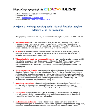 Niepubliczne przedszkole KOLOROWY BALONIK Adres ; Warszawa-Targówek ul św Wincentego 130 Kontakt 791 594 900 e-mail ; [email protected] strona internetowa ; www.kolorowybalonik.pl Miejsce z którego według opinii dzieci Rodzice zwykle odbierają je za wcześnie Do dyspozycji Rodziców jesteśmy od poniedziałku do piątku w godzinach 7.00 – 18.00 1. Bezpieczeństwo – kodowany dostęp do przedszkola, wyposażenie sal i ogródka przedszkolnego w atestowane meble i sprzęt. Własny parking dla Rodziców. W przedszkolu wdrożonych jest 6 procedur bezpieczeństwa. Prowadzimy edukację dla dzieci i rodziców o bezpieczeństwie komunikacji w sieci internetowej. 2. Grupy - trzy oddziały przedszkole dla dzieci 2,5 - 3letnich, 4 letnich oraz 5 letnich realizujących roczne przygotowanie gotowości szkolnej w oddziale „ZERÓWKA”. W każdej grupie opieka dwóch nauczycieli. 3. Własna kuchnia zgodna z wymogami Sanepid - sami gotujemy cztery pyszne posiłki dla dzieci z uwzględnieniem dziecięcego podniebienia i diet. Własnej roboty ciasta, ciasteczka, pizza, placuszki, racuszki i pierożki….. Wdrożony system HACCP rekomendowany przez Światową Organizację Zdrowia oraz wymagany prawem Unii Europejskiej. 4. Miejsce przyjazne dziecku – nasze przedszkole zostało nagrodzone Nagrodą główną Komitetu Ochrony Praw Dziecka w konkursie „Świat Przyjazny Dziecku” jako miejsce gdzie spełniają się dziecięce marzenia , gdzie wszystkie problemy małego człowieka są ważne i natychmiast rozwiązywane. W roku 2013 otrzymaliśmy Certyfikat Kubusiowego Przyjaciela Natury oraz certyfikat Kreatywnego Przedszkola Akademii Play-Doh. Przedszkole otrzymało certyfikat Lidera Usług 2014. 5. Standardy europejskie – bezpośrednie sąsiedztwo Bródnowskiego Paru Leśnego ( 20m) w którym zlokalizowane są ścieżki edukacyjne, duże przestronne sale , wyposażenie multimedialne, personel pedagogiczny to sprawdzona i wykwalifikowana kadra, 6. Języki obce – stawiamy na komunikację europejską. Język angielski codziennie w małych grupach, dwóch nauczycieli języka angielskiego pracujących na stałe, język francuski oraz hiszpański dwa razy w tygodniu. 7. Indywidualne podejście – praca z dzieckiem z orzeczeniem oraz z dzieckiem szczególnie zdolnym. W przedszkolu prowadzone są zajęcia kompensacyjno-korygujące, logopedia, opracowujemy indywidualne plany edukacyjno-terapeutyczne. Zajęcia prowadzone przez pedagoga, logopedę i psychologa. Wszyscy specjaliści ściśle współpracują z rodzicami. Realizujemy program pomocy psychologiczno-pedagogicznej dla dzieci ze orzeczonymi dysfunkcjami bądź brakami edukacyjnymi. 8. Pracujemy w oparciu m.in. o następujące metody: Glottodydaktyka – przygotowanie do nauki czytania i pisania wg. Prof. Bronisława Rocławskiego Plan Daltoński wg. Helen Parkhurst oceniony jako wzorowe narzędzie we współczesnej edukacji Dziecięca Matematyka wg. Ewy Zielińskiej i Edyty Gruszczyk-Kolczyńskiej Edukacja przez Ruch – zajęcia judo i tańca towarzyskiego Elementy Ruchu Rozwijającego Weroniki Sherborne Metoda Projektu Badawczego Metoda Klanzy – pedagogika zabawy Metoda Cudowne Dziecko – program wszechstronnej stymulacji wg. A. Czerskiej 9. Rozwój dziecka – realizacja podstawy programowej przygotowująca dziecko do podjęcia nauki w szkole bez żadnych barier. Wydarzenia – koncerty, teatrzyki kukiełkowe i aktorskie, warsztaty edukacyjne, liczni goście, Wycieczki autokarowe i piesze Wyjścia do groty solnej Wyjścia do kina Konkursy i występy dzieci Zajęcia teatralne Zajęcia ruchowe – taniec towarzyski, zumba, aerobik, judo Dodatkowe zajęcia z malarstwa, gliny i malarstwa sztalugowego