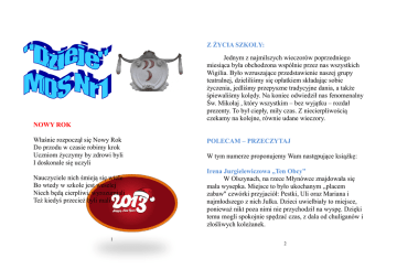 Z ŻYCIA SZKOŁY: Jednym z najmilszych wieczorów poprzedniego miesiąca była obchodzona wspólnie przez nas wszystkich Wigilia. Było wzruszające przedstawienie naszej grupy teatralnej, dzieliliśmy się opłatkiem składając sobie życzenia, jedliśmy przepyszne tradycyjne dania, a także śpiewaliśmy kolędy. Na koniec odwiedził nas fenomenalny Św. Mikołaj , który wszystkim – bez wyjątku – rozdał prezenty. To był ciepły, miły czas. Z niecierpliwością czekamy na kolejne, równie udane wieczory. NOWY ROK Właśnie rozpoczął się Nowy Rok Do przodu w czasie robimy krok Uczniom życzymy by zdrowi byli I doskonale się uczyli Nauczyciele nich śmieją się wiele Bo wtedy w szkole jest weselej Niech będą cierpliwi, wyrozumiali Też kiedyś przecież byli mali POLECAM – PRZECZYTAJ W tym numerze proponujemy Wam następujące książkę: Irena Jurgielewiczowa „Ten Obcy” W Olszynach, na rzece Młynówce znajdowała się mała wysepka. Miejsce to było ukochanym ,,placem zabaw" czwórki przyjaciół: Pestki, Uli oraz Mariana i najmłodszego z nich Julka. Dzieci uwielbiały to miejsce, ponieważ nikt poza nimi nie przychodził na wyspę. Dzięki temu mogli spokojnie spędzać czas, z dala od chuliganów i złośliwych koleżanek. 1 2 Pewnego dnia, z przerażeniem odkryli, że w ich sekretnym miejscu ktoś obcy urządził sobie kryjówkę. Stali bywalcy wyspy chcieli koniecznie odszukać intruza, który zagościł na ich terytorium. Poszukiwania nie trwały długo. Dziewczyny prawie od razu znalazły nieproszonego gościa. Był nim kilkunastoletni chłopiec. Wycieńczony, chudy i w podartym ubraniu spał pod drzewem. Dziewczęta spostrzegły też, że przybysz ma mocno skaleczoną nogę… CIEKAWI LUDZIE „Kto wie, może wyprawa w kosmos?” Kilka słów o Marku Kamińskim Urodzony 24. marca 1964 w Gdańsku. Polski polarnik, podróżnik, żeglarz, pisarz, fotograf, przedsiębiorca. Mam rodzinę, żonę i dwójkę dzieci - Pole i Kaya. Każdego dnia rano piję zieloną herbatę gdzieś niedaleko plaży, a potem spaceruję wzdłuż morza. Staram się również znaleźć trochę wolnego czasu na moje sportowe hobby. Poza tym, uwielbiam czytać książki, ponieważ dają mi one wewnętrzny spokój i możliwość naładowania życiowych baterii. 3 Jako pierwszy na świecie zdobył całkiem sam biegun północny bez pomocy z zewnątrz. 27 grudnia 1995r. Zdobył biegun południowy. Oto wspomnienie: Zostałem pierwszą osobą, która zdobyła oba krańce Ziemi w jednym roku. To było spełnienie marzeń, ale nie zwieńczenie moich podróży. Wciąż pojawiają się kolejne wyzwania, pomysły, wartościowe rzeczy, którymi chcę się zająć. Ważne wyprawy: 2008 r. - wejście na Mont Blanc w Alpach razem z Leszkiem Cichym 2009 r. - Stany Zjednoczone, Kanada, Australia, Malezja i Indie, krótka wyprawa fotograficzna z wykładami; 2009 r. - "Ekspedycja Wisła", wyprawa kajakowa od źródeł do ujścia Wisły, ok. 1000 km; 2010 r. - "Zimowa Ekspedycja Wisła", zimowa wyprawa kajakowa od źródeł do ujścia Wisły, ok. 1000 km; Marek Kamiński został nagrodzony orderem odrodzenia Polski i Ecce Homo. Podróżnik powiedział: Czasami, aby coś osiągnąć, trzeba zaakceptować ryzyko. I dotyczy to nie tylko wypraw polarnych. Nie sądzę, aby nadmierna ostrożność mogła nas uchronić przed jakimś nieszczęściem. 4 CIEKAWOSTKI NA CZASIE: Trzej Królowie, Trzej Mędrcy, Trzej Magowie (gr. μάγοι magoi) − według tradycji chrześcijańskiej osoby, które miały podążać za Gwiazdą Betlejemską, przybyć do miejsca narodzin Jezusa Chrystusa i przekazać mu dary. Tradycyjnie uznawani są za świętych w katolicyzmie, prawosławiu oraz w starożytnych Kościołach Wschodu. EKOINFO: Koala w ogóle nie pije? Niezbędną do życia wilgoć pobiera z liści eukaliptusa. W języku Aborygenów, ludu zamieszkującego Australię, koala oznacza „bez wody”. Na świecie żyje ponad 245 gatunków żółwi. Najmniejszy ma 95 mm i waży 140 kg. Największy należy do żółwi skórzastych, jego pancerz ma 2,5 m, a ciężar dochodzi do 860 kg. Ogromny żółw słoniowy, który żyje na wyspach Galapagos osiąga wzrost 1,4 m i waży ok. 400 kg. SZUKAJ OKAZJI DO ŚMIECHU 1. Jasiu jedzie rowerem i spotyka księdza. - Jasiu, chodź do kościoła się pomodlić. - Nie mogę. - Czemu? - Bo nie ma mi kto popilnować roweru. - Duch święty ci go popilnuje. 6 Poszli. - No dobra, Jasiu, teraz się przeżegnaj. - Dobrze, w imię ojca i syna - A gdzie jest duch święty? - Pilnuje mi roweru. 2. Wraca Jasiu po szkole do domu. - Ojciec pyta go: - Co robiliście dziś na chemii?? - Doświadczenia z petardami. - A co będziecie robić jutro w szkole?? - W jakiej szkole??!! 3.Jasio mówi do mamy: - Mamo! Bo dzieci się w szkole ze mnie śmieją, że mam głuchą mamę. - Nie, Jasiu, nie potrzeba nam cukru. 4.Mama mówi do Jasia: - Musisz poprawić tą jedynkę z polskiego. Jaś odpowiada: - Już dawno bym poprawił, ale pani zawsze zabiera dziennik 7 NOWORCZNY HOROSKOP Baran 21 marca – 20 kwietnia Baran, dzielny i wytrwały, bywa łasy na pochwały i bez przerwy, z każdej strony, bardzo lubi być chwalony. Byk 21 kwietnia – 21 maja Byk porządnie się nagłowi, zanim krok do przodu zrobi, lecz gdy wreszcie iść zaczyna, prze do przodu jak maszyna! Bliźnięta 22 maja – 21 czerwca Świat bez ruchu i hałasu jest dla Bliźniąt stratą czasu! Zamiast lekcji i klasówek wolą słuchać miłych słówek! Rak 22 czerwca – 22 lipca Rak, gdy tylko czuje drakę, woli się wycofać rakiem, lecz gdy tkwi w rodzinnym kole, wreszcie w swoim jest żywiole! Lew 23 lipca – 22 sierpnia Jest odważny, silny, dzielny i okropnie samodzielny! Czasem takie ma pomysły, że rodzice tracą zmysły! Panna 23 sierpnia – 22 września Jak świat światem, każda Panna jest dokładna i staranna, nawet w głowie ma porządek, bo ustawia myśli w rządek. Waga 23 września – 23 października Waga chce wieść rajs