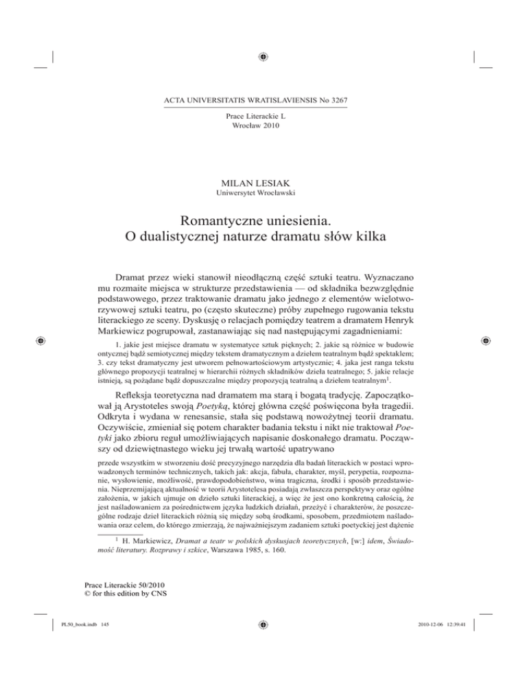 ACTA UNIVERSITATIS WRATISLAVIENSIS No 3267 Prace Literackie L Wrocław 2010 MILAN LESIAK Uniwersytet Wrocławski Romantyczne uniesienia. O dualistycznej naturze dramatu słów kilka Dramat przez wieki stanowił nieodłączną część sztuki teatru. Wyznaczano mu rozmaite miejsca w strukturze przedstawienia — od składnika bezwzględnie podstawowego, przez traktowanie dramatu jako jednego z elementów wielotworzywowej sztuki teatru, po (często skuteczne) próby zupełnego rugowania tekstu literackiego ze sceny. Dyskusję o relacjach pomiędzy teatrem a dramatem Henryk Markiewicz pogrupował, zastanawiając się nad następującymi zagadnieniami: 1. jakie jest miejsce dramatu w systematyce sztuk pięknych; 2. jakie są różnice w budowie ontycznej bądź semiotycznej między tekstem dramatycznym a dziełem teatralnym bądź spektaklem; 3. czy tekst dramatyczny jest utworem pełnowartościowym artystycznie; 4. jaka jest ranga tekstu głównego propozycji teatralnej w hierarchii różnych składników dzieła teatralnego; 5. jakie relacje istnieją, są pożądane bądź dopuszczalne między propozycją teatralną a dziełem teatralnym1. Refleksja teoretyczna nad dramatem ma starą i bogatą tradycję. Zapoczątkował ją Arystoteles swoją Poetyką, której główna część poświęcona była tragedii. Odkryta i wydana w renesansie, stała się podstawą nowożytnej teorii dramatu. Oczywiście, zmieniał się potem charakter badania tekstu i nikt nie traktował Poetyki jako zbioru reguł umożliwiających napisanie doskonałego dramatu. Począwszy od dziewiętnastego wieku jej trwałą wartość upatrywano przede wszystkim w stworzeniu dość precyzyjnego narzędzia dla badań literackich w postaci wprowadzonych terminów technicznych, takich jak: akcja, fabuła, charakter, myśl, perypetia, rozpoznanie, wysłowienie, możliwość, prawdopodobieństwo, wina tragiczna, środki i sposób przedstawienia. Nieprzemijającą aktualność w teorii Arystotelesa posiadają zwłaszcza perspektywy oraz ogólne założenia, w jakich ujmuje on dzieło sztuki literackiej, a więc że jest ono konkretną całością, że jest naśladowaniem za pośrednictwem języka ludzkich działań, przeżyć i charakterów, że poszczególne rodzaje dzieł literackich różnią się między sobą środkami, sposobem, przedmiotem naśladowania oraz celem, do którego zmierzają, że najważniejszym zadaniem sztuki poetyckiej jest dążenie 1 H. Markiewicz, Dramat a teatr w polskich dyskusjach teoretycznych, [w:] idem, Świadomość literatury. Rozprawy i szkice, Warszawa 1985, s. 160. Prace Literackie 50/2010 © for this edition by CNS PL50_book.indb 145 2010-12-06 12:39:41 146 MILAN LESIAK do osiągnięcia doskonałości w obrębie każdego rodzaju i że jest to zależne od umiejętności poety, że dzieło literackie jest światem autonomicznym, w którym obowiązują prawa swoistej logiki wewnętrznej2. W rekonstrukcji świadomości teoretycznej romantyków nie da się pominąć zaplecza neoklasycystycznego, którego byli spadkobiercami. Późnoosiemnastowieczne spory o genologiczny kształt komedii i tragedii, a także ich kombinacje, wyraźnie sygnalizowały przecież teatralny gust publiczności. Rozróżnienie typów dramatu ustanowiło więc swego rodzaju systematykę. W poszczególnych krajach przyjmowano różne kwantyfikatory, wskazujące na określone proweniencje treściowe i nastrojowe utworu. I tak istniała na przykład komedia płaczliwa (larmoyante), drama, comédie attendrissante (wzruszająca), komedia łzawa. Trzeba dodać, że komedia była wtedy gatunkiem znacznie bardziej popularnym (literacko i w konsekwencji — teatralnie), a spełnienie postulatów z poetyk normatywnych odnośnie tragedii przychodziło trudniej nawet erudytom, którzy z uporem godnym lepszej sprawy upowszechniali obowiązujące zasady. Tragedia w wersji ortodoksyjnie wiernej regułom znalazła się więc w pozycji modelowej, a przez to nieosiągalnej. Romantyzm przyniósł zmianę tego stanu rzeczy i przywrócił tragedii, zwłaszcza w jej wydaniu historycznym, wysoką pozycję wśród gatunków dramatycznych, dobrawszy do tego stosowne zaplecze filozoficzne i estetyczne3. Zdecydowało o tym wiele powodów. Jednym z nich, jak pisze Janusz Degler, „była po prostu konieczność rywalizacji z tragedią klasyczną”4, która niekwestionowanym panowaniem na scenie wymusiła próby nadania podobnego statusu dramatowi dopiero się kształtującemu5. Odziedziczona po oświeceniu wiara w doniosłą społecznie rolę teatru w kształtowaniu postaw obywatelskich „tłumaczy nam przyznawaną dramatowi w płaszczyźnie teoretycznej wyższość nad innymi rodzajami literackimi”, jak twierdził we „Wstępie” do Lukrecji Borgii Victor Hugo6. Warto zauważyć, że w Polsce okresu zaborów wyłącznie w płasz2 H. Podbielski, Wstęp do Poetyki Arystotelesa, Wrocław 1989, s. XCVII n. Por. J. Degler, Problem dramatu historycznego w polskiej krytyce literackiej lat 1830–1848, [w:] „Prace Literackie” V, Wrocław 1963. 4 Ibidem, s. 29. Podobnie twierdzi Irena Sławińska: „Wielkie zmiany, jakie się w połowie XIX wieku dokonują w dziedzinie dramatu tragicznego, uderzą przede wszystkim w najsilniejszy mur — tragedię klasyczną z XVIII wieku”. I. Sławińska, Tragedia w epoce Młodej Polski. Z zagadnień struktury dramatu, Toruń 1948. 5 Ewa Wąchocka pisze: „Wysunięcie dramatu na czoło gatunków literackich było także w jakiejś mierze spadkiem po klasycyzmie, który stawiał na tym miejscu tragedię. Charakterystyczne jest zamienne używanie obu nazw, dramat i tragedia, albo ich utożsamianie — Norwid na przykład analizuje »dramata czyli tragedie Juliusza Słowackiego«. To gest nobilitacji, ale synonimiczne wymienianie pojęć miało zarazem podkreślać »wielkość« nowego dramatu”. O dramacie. Źródła do dziejów europejskich teorii dramatycznych, t. 2, Od Hugo do Witkiewicza. Poetyki, manifesty