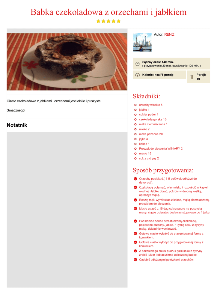 Babka czekoladowa z orzechami i jabłkiem Autor: RENIZ Łączny czas: 140 min. ( przygotowanie 20 min. oczekiwanie 120 min. ) Kalorie: kcal/1 porcję Ciasto czekoladowe z jabłkami i orzechami jest lekkie i puszyste Porcji: 10 Składniki: orzechy włoskie 5 Smacznego! jabłko 1 cukier puder 1 czekolada gorzka 10 Notatnik mąka ziemniaczana 1 mleko 2 mąka pszenna 20 jajka 3 kakao 1 Proszek do pieczenia WINIARY 2 masło 15 sok z cytryny 2 Sposób przygotowania: Orzechy posiekać,( 45 połówek odłożyć do dekoracji). Czekoladę połamać, wlać mleko i rozpuścić w kąpieli wodnej. Jabłko obrać, pokroić w drobną kostkę, oprószyć mąką. Resztę mąki wymieszać z kakao, mąką ziemniaczaną, proszkiem do pieczenia. Masło utrzeć z 15 dag cukru pudru na puszystą masę, ciągle ucierając dodawać stopniowo po 1 jajku . Pod koniec dodać przestudzoną czekoladę, posiekane orzechy, jabłko, 1 łyżkę soku z cytryny i mąkę, dokładnie wymieszać. Gotowe ciasto wyłożyć do przygotowanej formy z kominkiem. Gotowe ciasto wyłożyć do przygotowanej formy z kominkiem. Z pozostałego cukru pudru i łyżki soku z cytryny zrobić lukier i oblać zimną upieczoną babkę. Ozdobić odłożonymi połówkami orzechów.