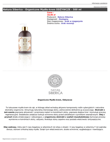 Informacje o produkcie Utworzono 02-03-2017 Natura Siberica - Organiczne Mydło-krem ODŻYWCZE - 500 ml Cena : 18,90 zł Producent : Natura Siberica Dostępność : Dostępny Stan magazynowy : brak w magazynie Średnia ocena : brak recenzji Organiczne Mydło-krem, Odżywcze To luksusowe mydło-krem do rąk, w którego skład wchodzą aktywne komponenty roślin syberyjskich i naturalne ekstrakty organiczne. Utrzymują naturalną równowagę skóry, jednocześnie delikatnie ją oczyszczając. Ekstrakt z żeń-szenia poprawia aktywność i przemianę materii w komórkach skóry, poprawia dopływ krwi i stymuluje procesy regeneracyjne. Dodatkowo zwiększa funkcje ochronne skóry przed szkodliwymi czynnikami zewnętrznymi. Olej z prymuli działa zmiękczająco i odżywiająco, a organiczny ekstrakt z szałwii muszkatołowej stymuluje procesy wymienne w komórkach skóry, odżywia, likwiduje stany zapalne oraz posiada właściwości antyseptyczne. Olej cedrowy, który jest 5 razy bogatszy w witaminę E niż oliwa z oliwek i 3 razy bogatszy w witaminy F niż wątroba dorsza, stanowi unikalną bazę mydła. Dzięki tym właściwościom, działa ochronnie, wygładzająco i nawilżająco. Wygenerowano w programie www.oscGold.com Produkt nie zawiera: parabenów, SLS, PEG, SLES, olei mineralnych, silikonów, składników pochodzenia zwierzęcego. Stosowanie: do każdego typu skóry. Sposób użycia: niewielką ilość mydła nanieść na wilgotną skórę, spienić i dokładnie spłukać. Zawartość: 500 ml Skład INCI: Aqua, Sodium Сосо-Sulfate, Glicerin, Cocamidopropyl Betaine, Lauryl Glucoside , Coco-Glucoside, Glyceryl Oleate, Сetearyl Alcohol, Achillea Asiatica Extract, Aquilegia Sibirica Extract, Cetraria Nivalis Extract, Panax Ginseng Root Extract*, Oenothera Biennis Seed Oil*, Salvia Officinalis Leaf Extract*, Hippophae Rhamnoidesamidopropyl Betaine, Pineamidopropyl Betaine, Xanthan Gum, Benzyl Alcohol, Benzoic Acid, Sorbic Acid, Citric Acid, Sodium Сhloride, Parfum, Hexyl Cinnamal, Butylphenyl Methylpropional. Certyfikat ICEA ICEA (Istituto per la Certificazione Etica ed Ambientale włoski Instytut certyfikujący produkty wg etyki środowiskowej). Jeden z najważniejszych organów certyfikujących produkty naturalne oraz organiczne we Włoszech i Europie. Uznany przez Ministerstwo Rolnictwa i Leśnictwa kontroluje pochodzenie zastosowanych surowców roślinnych, a w szczególności proweniencję ekstraktów i olejków eterycznych pochodzących z upraw ekologicznych (zgodnie z rozporządzeniem EWG 2092/91). Instytut we współpracy z różnymi producentami, opracował standardy dla kosmetyków przyjaznych środowisku. Zajmuje się nie tylko listą certyfikowanych produktów, ale także samych składników. Kosmetyki certyfikowane przez ICEA spełniają oczekiwania klientów w odniesieniu do zdrowych, bezpiecznych produktów o bezpiecznym wpływie na środowisko. Aby kosmetyk mógł otrzymać certyfikat ICEA: - nie może zawierać substancji modyfikowanych genetycznie; - nie może zawierać komponentów zawartych na liście niedozwolonych składników; - nie może być testowany na zwierzętach; - nie może być poddany promieniowaniu jonizującemu; - musi zawierać certyfikowane, ekologiczne składniki; Informacje o produkcie - jasno określone i łatwo weryfikowalne zasady korelacji między surowcami naturalnymi a produktem końcowym, czyli kosmetykiem; - produkty i procesy produkcji muszą być przyjazne dla środowiska i ludzkiego zdrowia; - musi być stworzony wg zasady zrównoważonego rozwoju środowiska; - musi być wytworzony wyłącznie z surowców pochodzących z upraw ekologicznych; - powinien mieć minimalnie negatywny wpływ na środowisko poprzez stosowanie opakowań nadających się do recyklingu (promowane są opakowania z odnawialnych surowców, materiałów nadających się do recyklingu lub otrzymane ze zwrotu pustych opakowań); - musi być przebadany dermatologicznie. Kosmetyki nie zawierają sztucznych tłuszczy, olejów, silikonów, parafiny, syntetycznych składników chemicznych, parabenów i innych substancji uzyskiwanych przy destylacji ropy naftowej. Certyfikat ICEA jest akredytowany na arenie międzynarodowej i jest równoważny z najważniejszymi europejskimi markami kosmetyków BIO. Rygorystyczne testy dermatologiczne i mikrobiologiczne gwarantują czystość składników odpowiednich dla skóry wrażliwej i alergicznej. Niedozwolone jest stosowanie substancji z roślin modyfikowanych genetycznie GMO. Siberian Friendly: Wspieramy nieliczne narody Syberii. Przy zakupie dzikich ziół syberyjskich staramy się wspierać styl życia ludów w Syberii i na Dalekim Wschodzie. Liczba niektórych ludów jest mniejsza niż 1000 osób ( na przykład 540 Aleutów i 276 Tazów. Dlatego jesteśmy głęboko przekonani, że nasza pomoc jest istotnym krokiem w zachowaniu unikalnych kultur i tradycji narodów Syberii. Wysoko opłacając pracę osób zbierających zioła i rośliny ręcznie, staramy się wspierać małe ludy syberyjskie nie tylko po to, żeby mogli oni godnie opiekować się swoimi rodzinami , ale również żyli zgodnie z dzisiejszymi normami społecznymi i wymogami współczesnego społeczeństwa . Wybierając produkty Natura Siberica, wspierasz ludy Syberii, ich rodziny i pomagasz zachować unikalne zasoby naturalne dalekiego wschodu. Wild Harvested: Wygenerowano w programie www.oscGold.com Ze względu na swój surowy klimat, Syberia jest pełna unikalnych roślin, niezbędnych dla zdrowia i urody. Aby przetrwać na mrozie do –50C i wytrzymać silne wiatry, syberyjskie zioła i rośliny syntetyzują ochronne składniki aktywne i mają niewiarygodne właściwości przeciwutleniające. W naszej firmie czcimy technikę zbierania dzikich ziół. Niezwykle ważne jest, aby zebrać rośliny w odpowiednim wieku i wielkości, w czasie najwyższego stężenia głównych składników potrzebnych dla zdrowia i urody. Właśnie dlatego wszystkie dzikie rośliny 