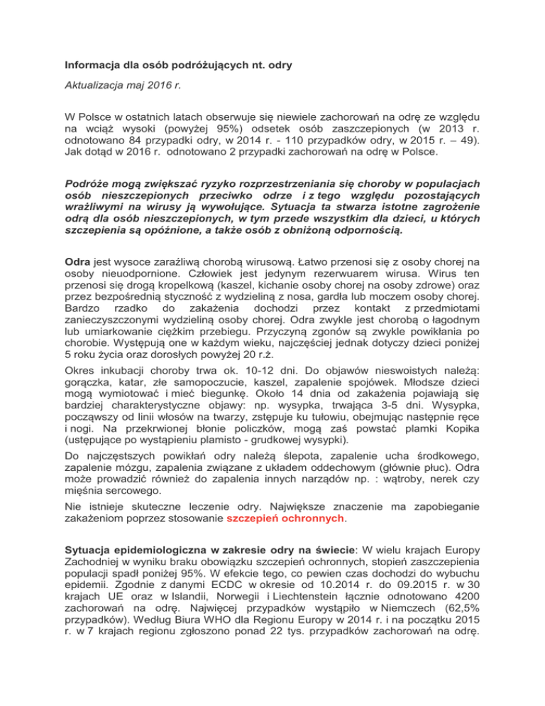 Informacja dla osób podróżujących nt. odry Aktualizacja maj 2016 r. W Polsce w ostatnich latach obserwuje się niewiele zachorowań na odrę ze względu na wciąż wysoki (powyżej 95%) odsetek osób zaszczepionych (w 2013 r. odnotowano 84 przypadki odry, w 2014 r. - 110 przypadków odry, w 2015 r. – 49). Jak dotąd w 2016 r. odnotowano 2 przypadki zachorowań na odrę w Polsce. Podróże mogą zwiększać ryzyko rozprzestrzeniania się choroby w populacjach osób nieszczepionych przeciwko odrze i z tego względu pozostających wrażliwymi na wirusy ją wywołujące. Sytuacja ta stwarza istotne zagrożenie odrą dla osób nieszczepionych, w tym przede wszystkim dla dzieci, u których szczepienia są opóźnione, a także osób z obniżoną odpornością. Odra jest wysoce zaraźliwą chorobą wirusową. Łatwo przenosi się z osoby chorej na osoby nieuodpornione. Człowiek jest jedynym rezerwuarem wirusa. Wirus ten przenosi się drogą kropelkową (kaszel, kichanie osoby chorej na osoby zdrowe) oraz przez bezpośrednią styczność z wydzieliną z nosa, gardła lub moczem osoby chorej. Bardzo rzadko do zakażenia dochodzi przez kontakt z przedmiotami zanieczyszczonymi wydzieliną osoby chorej. Odra zwykle jest chorobą o łagodnym lub umiarkowanie ciężkim przebiegu. Przyczyną zgonów są zwykle powikłania po chorobie. Występują one w każdym wieku, najczęściej jednak dotyczy dzieci poniżej 5 roku życia oraz dorosłych powyżej 20 r.ż. Okres inkubacji choroby trwa ok. 10-12 dni. Do objawów nieswoistych należą: gorączka, katar, złe samopoczucie, kaszel, zapalenie spojówek. Młodsze dzieci mogą wymiotować i mieć biegunkę. Około 14 dnia od zakażenia pojawiają się bardziej charakterystyczne objawy: np. wysypka, trwająca 3-5 dni. Wysypka, począwszy od linii włosów na twarzy, zstępuje ku tułowiu, obejmując następnie ręce i nogi. Na przekrwionej błonie policzków, mogą zaś powstać plamki Kopika (ustępujące po wystąpieniu plamisto - grudkowej wysypki). Do najczęstszych powikłań odry należą ślepota, zapalenie ucha środkowego, zapalenie mózgu, zapalenia związane z układem oddechowym (głównie płuc). Odra może prowadzić również do zapalenia innych narządów np. : wątroby, nerek czy mięśnia sercowego. Nie istnieje skuteczne leczenie odry. Największe znaczenie ma zapobieganie zakażeniom poprzez stosowanie szczepień ochronnych. Sytuacja epidemiologiczna w zakresie odry na świecie: W wielu krajach Europy Zachodniej w wyniku braku obowiązku szczepień ochronnych, stopień zaszczepienia populacji spadł poniżej 95%. W efekcie tego, co pewien czas dochodzi do wybuchu epidemii. Zgodnie z danymi ECDC w okresie od 10.2014 r. do 09.2015 r. w 30 krajach UE oraz w Islandii, Norwegii i Liechtenstein łącznie odnotowano 4200 zachorowań na odrę. Najwięcej przypadków wystąpiło w Niemczech (62,5% przypadków). Według Biura WHO dla Regionu Europy w 2014 r. i na początku 2015 r. w 7 krajach regionu zgłoszono ponad 22 tys. przypadków zachorowań na odrę. Najwięcej przypadków odnotowano w Kirgistanie, Bośni i Hercegowinie, Rosji, Gruzji i Włoszech. U 6 osób stwierdzono ostre porażenie mózgu, jako powikłanie po przebytej odrze. Do najbardziej nagłośnionej przez media epidemii w 2015 r. doszło w Stanach Zjednoczonych, gdzie potwierdzono 189 przypadków, z czego 62% dotyczyło międzystanowego ogniska, powiązanego z parkiem rozrywki w Kalifornii. W 2015 r. ogniska zachorowań na odrę wystąpiły także w Chinach, Mongolii, Demokratycznej Republice Konga, Sudanie i Kazachstanie, Malezji, Pakistanie, Egipcie, Kamerunie, Nigerii, Sudanie Południowym. W 2016 r. na terenie UE odnotowano ogniska odry w Rumuni (okręgi BeszterceNaszód, Kluż), we Włoszech (Mediolan, Parma), oraz w Wielkiej Brytanii. Zachorowania dotyczyły osób nieuodpornionych przeciwko odrze, w wieku od 1 do 40 lat. Poza Europą zachorowania na odrę wystąpiły w USA, Nowej Zelandii oraz w wielu krajach Afryki (w Czadzie, Liberii, Nigerii, Beninie, Burkina Faso, Republice Środkowoafrykańskiej, Wybrzeżu Kości Słoniowej, Kamerunie, Demokratycznej Republice Konga, Gwinei, Mauretanii, Mali, Nigrze, Senegalu, Sierra Leone, Togo). W krajach, w których wystąpiły przypadki odry, prawdopodobieństwo zachorowania jest większe, ale nie można go wykluczyć w innych obszarach świata. Zalecenia WHO dla osób podróżujących do państw, w których odnotowuje się wzmożone zachorowania na odrę: ■ Wszystkim osobom w wieku powyżej 6 miesiąca życia zaleca się posiadanie aktualnego szczepienia ochronnego przeciwko odrze. ■ Decyzję o zastosowaniu dawki przypominającej każdorazowo podejmuje lekarz. ■ Należy stosować się do poleceń i zakazów wydawanych przez miejscowe służby sanitarne. W razie wystąpienia objawów chorobowych w trakcie pobytu należy natychmiast zwrócić się o pomoc lekarską, a w przypadku wystąpienia niepokojących objawów chorobowych po powrocie z ww. rejonów należy niezwłocznie zgłosić się do lekarza, informując o przebytej podróży. W celu uzyskania informacji o innych zagrożeniach należy przed wyjazdem do tych krajów skontaktować się z lekarzem medycyny podróży lub lekarzem medycyny tropikalnej, najlepiej nie później niż 6 - 8 tyg. przed planowaną podróżą. Pozwoli to na przyjęcie zalecanej przez lekarza profilaktyki. Więcej informacji dotyczących bezpieczeństwa w czasie podróży znajduje się na stronie Ministerstwa Spraw Zagranicznych „Polak za granicą” lub „Odyseusz".