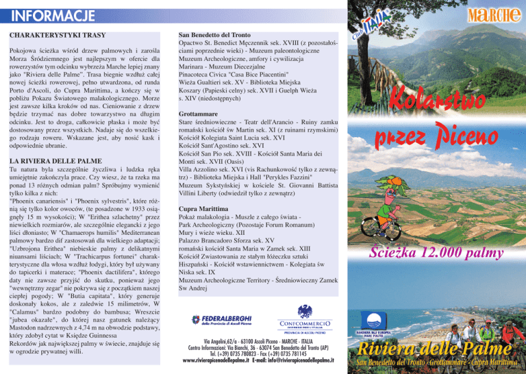 INFORMACJE CHARAKTERYSTYKI TRASY Pokojowa ścieżka wśród drzew palmowych i zarośla Morza Śródziemnego jest najlepszym w ofercie dla rowerzystów tym odcinku wybrzeża Marche lepiej znany jako "Riviera delle Palme”. Trasa biegnie wzdłuż całej nowej ścieżki rowerowej, pełno utwardzona, od runda Porto d'Ascoli, do Cupra Marittima, a kończy się w pobliżu Pokazu Światowego malakologicznego. Morze jest zawsze kilka kroków od nas. Cieniowanie z drzew będzie trzymać nas dobre towarzystwo na długim odcinku. Jest to droga, całkowicie płaska i może być dostosowany przez wszystkich. Nadaje się do wszelkiego rodzaju roweru. Wskazane jest, aby nosić kask i odpowiednie ubranie. LA RIVIERA DELLE PALME Tu natura byla szczególnie życzliwa i ludzka ręka umiejętnie zakończyla prace. Czy wiesz, że ta rzeka ma ponad 13 różnych odmian palm? Spróbujmy wymienić tylko kilka z nich: "Phoenix canariensis" i "Phoenix sylvestris", które różnią się tylko kolor owoców, (te posadzone w 1933 osiągnęły 15 m wysokości); W "Erithea szlachetny" przez niewielkich rozmiarów, ale szczególnie elegancki z jego liści dłoniasto; W "Chamaerops humilis" Mediterranean palmowy bardzo dif zastosowań dla wielkiego adaptacji; "Uzbrojona Erithea" niebieskie palmy z delikatnymi niuansami liściach; W "Trachicarpus fortunei" charakterystyczne dla włosa wzdłuż łodygi, który był używany do tapicerki i materace; "Phoenix dactilifera", którego daty nie zawsze przyjść do skutku, ponieważ jego "wewnętrzny zegar" nie pokrywa się z początkiem naszej ciepłej pogody; W "Butia capitata", który generuje doskonały kokos, ale z zaledwie 15 milimetrów, W "Calamus" bardzo podobny do bambusa; Wreszcie "jubea okazałe", do której nasz gatunek należący Mastodon nadrzewnych z 4,74 m na obwodzie podstawy, który zdobył cytat w Księdze Guinnessa Rekordów jak największej palmy w świecie, znajduje się w ogrodzie prywatnej willi. San Benedetto del Tronto Opactwo St. Benedict Męczennik sek. XVIII (z pozostałościami poprzednie wieki) - Muzeum paleontologiczne Muzeum Archeologiczne, amfory i cywilizacja Marinara - Muzeum Diecezjalne Pinacoteca Civica "Casa Bice Piacentini" Wieża Gualtieri sek. XV - Biblioteka Miejska Koszary (Papieski celny) sek. XVII i Guelph Wieża s. XIV (niedostępnych) Grottammare Stare średniowieczne - Teatr dell'Arancio - Ruiny zamku romański kościół św Martin sek. XI (z ruinami rzymskimi) Kościół Kolegiata Saint Lucia sek. XVI Kościół Sant'Agostino sek. XVI Kościół San Pio sek. XVIII - Kościół Santa Maria dei Monti sek. XVII (Oasis) Villa Azzolino sek. XVI (vis Rachunkowość tylko z zewnątrz) - Biblioteka Miejska i Hall "Perykles Fazzini" Muzeum Sykstyńskiej w kościele St. Giovanni Battista Villini Liberty (odwiedził tylko z zewnątrz) Cupra Marittima Pokaż malakologia - Muszle z całego świata Park Archeologiczny (Pozostaje Forum Romanum) Mury i wieże wieku. XII Palazzo Brancadoro Sforza sek. XV romański kościół Santa Maria w Zamek sek. XIII Kościół Zwiastowania ze stałym łóżeczku sztuki Hiszpański - Kościół wstawiennictwem - Kolegiata św Niska sek. IX Muzeum Archeologiczne Territory - Średniowieczny Zamek Sw Andrej Via Angelini,62/a - 63100 Ascoli Piceno - MARCHE - ITALIA Centro Informazioni: Via Bianchi, 36 - 63074 San Benedetto del Tronto (AP) Tel. (+39) 0735 780823 - Fax (+39) 0735 781145 www.rivierapicenadellepalme.it E-mail: [email protected] Kolarstwo przez Piceno Ścieżka 12.000 palmy Ścieżka 12.000 palmy TRASA Porto D’Ascoli (Rotonda S. D’Acquisto) BAZYLARNA San Benedetto del Tronto – Grottammare 500 400 300 200 100 10 4 0 2,5 5 7,5 14,3 10 12,5 18,6 15 17,5 24,3 20 22,5 27,5 30 Data: 25/02/2003 - Czas: 02.00.00 -Średnia prędkość: 20,01 Km/h długość: 28,60 Km - VAM: --- m/h -średnie nachylenie: 0 rzeczywista różnica wysokości: -Km pod górę: SIMBOLOGIA LEGENDA Elementarny / Łatwy / łatwy z falowaniem Średnio - Łatwy / Średni / średnim stopniu trudności trudny +++- Wskaźniki trudności (9 stopni) - Trudności są reprezentowane przez całkowity spadek, długość i nachylenie % WSKAZANIE TRAS NA MAPIE BAZYLARNA TRASA DLUGA TRASA TRASA NIEUTRWARDZONA 28,6 0 0 0% 0% 0,0 2h ca. - UCIEKANIE SIĘ 28,6 25 BAZYLARNA TRASA DLUGA TRASA długość Różnica w wysokości max wysokość nad poziomem morza średnie nachylenie max nachylenie Nachylenie Max znajduje się. w km Czas potrzebny w predkosci średniej 20km DIFFICOLTA’ 0 - Porto d’Ascoli 600 0 - San Benedetto del Tronto 700 0 - Porto d’Ascoli 800 0 - Grottammare 900 0 - Cupramarittima 1000 0 - Grottammare 0 - San Benedetto del Tronto Km.28,6 Cupra Marittima (Museo di Malacologia) ZESTAWIENIE ŚCIEŻKI LEGENDA S/D BAZYLARNA TRASA Km Alt Porto d’Ascoli (lungomare) San Benedetto del Tronto Grottammare Cupramarittima (Mostra Malacologica) Grottammare San Benedetto del Tronto Porto d’Ascoli (lungomare) BAZYLARNA DLUGA BAZYLARNA TRASA 0 4 10 14,3 5 18,6 24,3 28,6 DLUGA TRASA 0 Porto d’Ascoli (lungomare) 4 San Benedetto del Tronto 10 DLUGA TRASA Km Alt Grottammare 14,3 Cupramarittima (Mostra Malacologica) 18,6 24,3 28,6 Grottammare San Benedetto del Tronto Porto d’Ascoli (lungomare) Poczatek jest od ronda promenady Piazza S. D'acquisto gdzie rospoczyna sie ścieżka rowerowa Przy moście św Benedykta chwilowo porzucić ścieżkę do podążania drogą, która biegnie wzdłuż molo i port i kierujemy się do Grottammare. Natychmiast po starym stadionie wznawiamy ścieżkę rowerową Przejeżdżamy Grottammare i bierzemy promenady kontynuować w kierunku północy: na koniec promenady Cupra Marittima (przez Taffetani) skręcić w lewo pod most kolejowy na via delle Conchiglie (po drugiej stronie ulicy jest wejscie Malakologia Muzeum) powrót jest dokladnie ta sama trasa