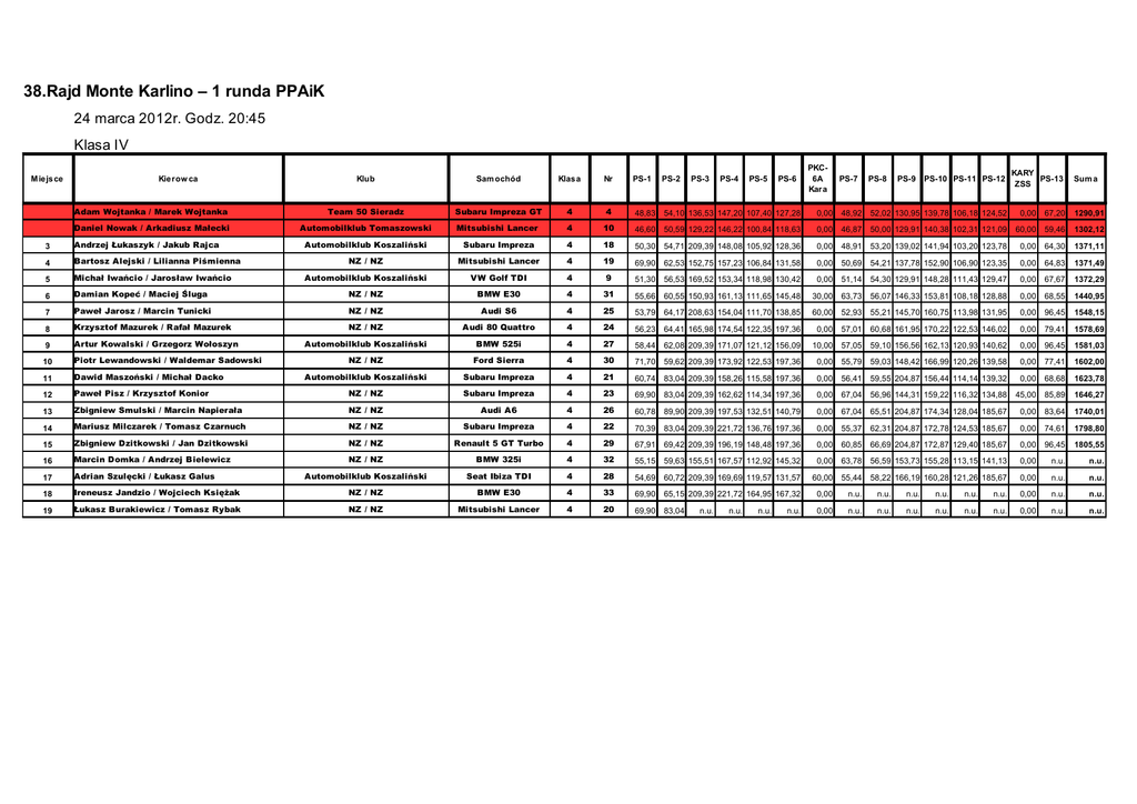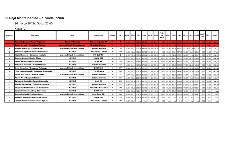 38.Rajd Monte Karlino – 1 runda PPAiK 24 marca 2012r. Godz. 20:45 Klasa IV M iejsce Kierow ca Klub Sam ochód Klasa Nr PS-1 PS-2 Adam Wojtanka / Marek Wojtanka Team 50 Sieradz Subaru Impreza GT Daniel Nowak / Arkadiusz Małecki Automobilklub Tomaszowski Mitsubishi Lancer Automobilklub Koszaliński PS-3 PS-4 PS-5 PS-6 4 4 48,83 54,10 136,53 147,20 107,40 127,28 4 10 46,60 50,59 129,22 146,22 100,84 118,63 Subaru Impreza 4 18 50,30 NZ / NZ Mitsubishi Lancer 4 19 Automobilklub Koszaliński VW Golf TDI 4 PKC6A Kara PS-9 PS-10 PS-11 PS-12 KARY PS-13 ZSS PS-7 PS-8 Sum a 0,00 48,92 52,02 130,95 139,78 106,18 124,52 0,00 67,20 1290,91 0,00 46,87 50,00 129,91 140,38 102,31 121,09 60,00 59,46 1302,12 54,71 209,39 148,08 105,92 128,36 0,00 48,91 53,20 139,02 141,94 103,20 123,78 0,00 64,30 1371,11 69,90 62,53 152,75 157,23 106,84 131,58 0,00 50,69 54,21 137,78 152,90 106,90 123,35 0,00 64,83 1371,49 9 51,30 56,53 169,52 153,34 118,98 130,42 0,00 51,14 54,30 129,91 148,28 111,43 129,47 0,00 67,67 1372,29 3 Andrzej Łukaszyk / Jakub Rajca 4 Bartosz Alejski / Lilianna Piśmienna 5 Michał Iwańcio / Jarosław Iwańcio 6 Damian Kopeć / Maciej Śluga NZ / NZ BMW E30 4 31 55,66 60,55 150,93 161,13 111,65 145,48 30,00 63,73 56,07 146,33 153,81 108,18 128,88 0,00 68,55 1440,95 7 Paweł Jarosz / Marcin Tunicki NZ / NZ Audi S6 4 25 53,79 64,17 208,63 154,04 111,70 138,85 60,00 52,93 55,21 145,70 160,75 113,98 131,95 0,00 96,45 1548,15 8 Krzysztof Mazurek / Rafał Mazurek NZ / NZ Audi 80 Quattro 4 24 56,23 64,41 165,98 174,54 122,35 197,36 0,00 57,01 60,68 161,95 170,22 122,53 146,02 0,00 79,41 1578,69 9 Artur Kowalski / Grzegorz Wołoszyn Automobilklub Koszaliński BMW 525i 4 27 58,44 62,08 209,39 171,07 121,12 156,09 10,00 57,05 59,10 156,56 162,13 120,93 140,62 0,00 96,45 1581,03 10 Piotr Lewandowski / Waldemar Sadowski NZ / NZ Ford Sierra 4 30 71,70 59,62 209,39 173,92 122,53 197,36 0,00 55,79 59,03 148,42 166,99 120,26 139,58 0,00 77,41 1602,00 11 Dawid Maszoński / Michał Dacko Automobilklub Koszaliński Subaru Impreza 4 21 60,74 83,04 209,39 158,26 115,58 197,36 0,00 56,41 59,55 204,87 156,44 114,14 139,32 0,00 68,68 1623,78 12 Paweł Pisz / Krzysztof Konior NZ / NZ Subaru Impreza 4 23 69,90 83,04 209,39 162,62 114,34 197,36 0,00 67,04 56,96 144,31 159,22 116,32 134,88 45,00 85,89 1646,27 13 Zbigniew Smulski / Marcin Napierała NZ / NZ Audi A6 4 26 60,78 89,90 209,39 197,53 132,51 140,79 0,00 67,04 65,51 204,87 174,34 128,04 185,67 0,00 83,64 1740,01 14 Mariusz Milczarek / Tomasz Czarnuch NZ / NZ Subaru Impreza 4 22 70,39 83,04 209,39 221,72 136,76 197,36 0,00 55,37 62,31 204,87 172,78 124,53 185,67 0,00 74,61 1798,80 15 Zbigniew Dzitkowski / Jan Dzitkowski NZ / NZ Renault 5 GT Turbo 4 29 67,91 69,42 209,39 196,19 148,48 197,36 0,00 60,85 66,69 204,87 172,87 129,40 185,67 0,00 96,45 1805,55 16 Marcin Domka / Andrzej Bielewicz NZ / NZ BMW 325i 4 32 55,15 59,63 155,51 167,57 112,92 145,32 0,00 63,78 56,59 153,73 155,28 113,15 141,13 0,00 n.u. n.u. 17 Adrian Szulęcki / Łukasz Galus Automobilklub Koszaliński Seat Ibiza TDI 4 28 54,69 60,72 209,39 169,69 119,57 131,57 60,00 55,44 58,22 166,19 160,28 121,26 185,67 0,00 n.u. n.u. 18 Ireneusz Jandzio / Wojciech Księżak NZ / NZ BMW E30 4 33 69,90 65,15 209,39 221,72 164,95 167,32 0,00 n.u. n.u. n.u. n.u. n.u. n.u. 0,00 n.u. n.u. 19 Łukasz Burakiewicz / Tomasz Rybak NZ / NZ Mitsubishi Lancer 4 20 69,90 83,04 0,00 n.u. n.u. n.u. n.u. n.u. n.u. 0,00 n.u. n.u. n.u. n.u. n.u. n.u.