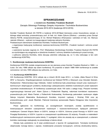 Komitet Trwałości Budowli ZG PZITB Gliwice dn. 10.02.2015 r. SPRAWOZDANIE z działalności Komitetu Trwałości Budowli Zarządu Głównego Polskiego Związku Inżynierów i Techników Budownictwa w okresie 2012-2014 (kadencja 2012-2016) Komitet Trwałości Budowli ZG PZITB w kadencji 2012-2016jest kierowany przez trzyosobowy zarząd, w którego skład wchodzą: przewodniczący prof. dr hab. inż. Adam Zybura (Gliwice) – powołany przez Zarząd Główny PZITB, wiceprzewodniczący dr inż. Michał Wójtowicz (Warszawa) i sekretarz dr hab. inż. Mariusz Jaśniok (Gliwice) – wybrani na inaugurującym kadencję zebraniu Komitetu. Podstawowymi elementami działalności Komitetu Trwałości Budowli jest: • organizacja tradycyjnej konferencji naukowo-technicznej KONTRA „Trwałość budowli i ochrona przed korozją”, • wyłonienie laureata nagrody im. Prof. Władysława Danileckiego Komitetu Trwałości Budowli ZG PZITB za wyróżniające się osiągnięcia w dziedzinie trwałości i ochrony obiektów budowlanych przed korozją, • cykliczne zebrania Komitetu, które decyzją członków odbywają się, co ½ roku (wliczając w ten rytm konferencję KONTRA). 1. Konferencje naukowo-techniczne KONTRA Konferencja KONTRA została zorganizowana po raz pierwszy przez Komitet Trwałości Budowli w 1969 r. w Łodzi. Do roku 1988 odbyło się osiem konferencji. Po przerwie w latach 1988-1994 konferencja ta została wznowiona i od roku 1994 odbywa się cyklicznie, co 2 lata. 1.1. Konferencja KONTRA‘2014 XIX Konferencja KONTRA ‘2014 odbyła się w dniach 28-30 maja 2014 r. w hotelu „Meta Resort & Wine SPA” w Szczyrku. Współorganizatorem konferencji był Oddział PZITB w Gliwicach oraz Ośrodek Szkoleń, Wydawnictw i Rekomendacji tego Oddziału. Celem konferencji była prezentacja nowych prac naukowych i technicznych obejmujących problemy skutecznego zabezpieczania obiektów budowlanych przed wpływami czynników środowiskowych. W konferencji uczestniczyło około 100 osób z całego kraju. Pracami komitetu organizacyjnego kierował prof. Adam Zybura z Politechniki Śląskiej, natomiast komitetowi naukowemu przewodniczyła prof. Maria Fiertak z Politechniki Krakowskiej. Konferencję patronatem naukowym objęła Sekcja Inżynierii Materiałów Budowlanych Komitetu Inżynierii Lądowej i Wodnej PAN oraz jej przewodniczący prof. Jacek Śliwiński. Patronat branżowy sprawowała Śląska Okręgowa Izba Inżynierów Budownictwa. Prace zgłoszone na konferencję, po szczegółowych recenzjach, zostały opublikowane w towarzyszących obradom czasopismach naukowych i naukowo-technicznych, będących patronami medialnymi: Cement Wapno Beton nr 3/2014, Izolacje nr 4/2014, Ochrona przed Korozją nr 6/2014 oraz Przegląd Budowlany nr 5/2014. Łącznie w czasopismach opublikowano 32 artykuły. Ponadto w materiałach konferencyjnych zamieszczono pełne teksty 11 wystąpień, które nie ukazały się w czasopismach, a zdaniem komitetu naukowego zasługiwały na prezentację w trakcie obrad. Obrady były podzielone na 8 sesji problemowych z łącznie 40 wystąpieniami. Tematyka konferencji obejmowała: korozję betonu i zapraw, modelowanie procesów korozyjnych, ochronę strukturalną betonu, Komitet Trwałości Budowli ZG PZITB korozję i zabezpieczenie zbrojenia konstrukcji żelbetowych, uszkodzenia i naprawy obiektów budowlanych, odporność betonu na wpływy środowiska oraz ochronę powierzchniową. 1.2. Konferencja KONTRA‘2016 Aktualnie podjęto już prace związane z organizacją konferencji KONTRA ‘2016. Konferencja obędzie się w maju 2016 r. najprawdopodobniej jak dotychczas w hotelu „Meta Resort & WineSPA” w Szczyrku. Planuje się przebieg konferencji podobny jak poprzedniej. 2. Nagroda im. Prof. Władysława Danileckiego Nagroda im prof. Władysława Danileckiego – prekursora ochrony budowli przed korozją w Polsce – jest przyznawana przez Komitet Trwałości Budowli od roku 1994 za wyróżniające się osiągnięcia w dziedzinie trwałości i ochrony obiektów budowlanych przed korozją. Dotychczas nagrodę tę przyznano 15 specjalistom zajmujących się problemami trwałości budowli. Niestety z tego grona nie żyje 7 osób. Żyjący laureaci stanowią kapitułę nagrody. Nagroda jest wręczana w trakcie otwarcia konferencji KONTRA. Podczas inauguracji konferencji KONTRA ‘2014 nagrodę im prof. W. Danileckiego wręczono dr hab. inż. Andrzejowi Garbaczowi profesorowi Politechniki Warszawskiej za zastosowanie oryginalnego podejścia naukowego wykorzystującego zaawansowane metody badawcze inżynierii powierzchni do kształtowania przyczepności w naprawach konstrukcji betonowych oraz ocenie skuteczności tych napraw. 3. Cykliczne zebrania Komitetu Trwałości Budowli W obecnej kadencji zebrania członków Komitetu Trwałości Budowli odbywają się w cyklu półrocznym. Dotychczas odbyły się 3 spotkania, z czego pierwsze zebranie w siedzibie Zarządu Głównego PZITB w Warszawie, natomiast pozostałe zebrania na specjalne życzenie członków Komitetu zostały zorganizowane w innych miejscach. Drugie zebranie (II) odbyło się w Instytucie Materiałów i Konstrukcji Budowlanych Politechniki Krakowskiej w Krakowie i było połączone ze zwiedzaniem laboratorium Instytutu. Trzecie zebranie (III), którego gospodarzem był w Katowicki Oddział PZITB, zorganizowano w gmachu NOT w Katowicach. Po tym zebraniu uczestnicy zwiedzili nowo oddany do użytku gmach Narodowej Orkiestry Symfonicznej Polskiego Radia. W poszczególnych zebraniach Komitetu uczestniczyło od 17 do 21 osób. Stałym punktem każdego zebrania był referat dotyczący interesujących problemów ochrony budowli przed korozją. Na zebraniach wygłoszono następujące referaty: • I zebranie 25.04.2013 r. – „Ocena stanu technicznego konstrukcji żelbetowych pod względem trwałości”; dr Mariusz Jaśniok (Politechnika Śląska), • II zebranie 22.11.2013 r. – „Zapobieganie korozji wewnętrznej kr
