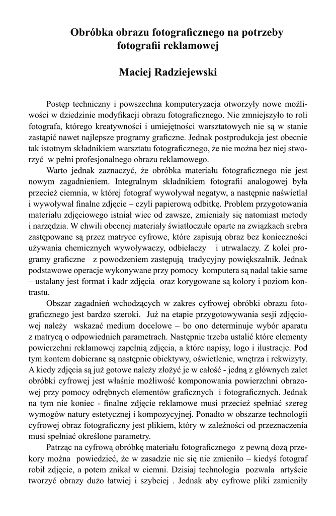 Obróbka obrazu fotograficznego na potrzeby fotografii reklamowej Maciej Radziejewski Postęp techniczny i powszechna komputeryzacja otworzyły nowe możliwości w dziedzinie modyfikacji obrazu fotograficznego. Nie zmniejszyło to roli fotografa, którego kreatywności i umiejętności warsztatowych nie są w stanie zastąpić nawet najlepsze programy graficzne. Jednak postprodukcja jest obecnie tak istotnym składnikiem warsztatu fotograficznego, że nie można bez niej stworzyć w pełni profesjonalnego obrazu reklamowego. Warto jednak zaznaczyć, że obróbka materiału fotograficznego nie jest nowym zagadnieniem. Integralnym składnikiem fotografii analogowej była przecież ciemnia, w której fotograf wywoływał negatyw, a następnie naświetlał i wywoływał finalne zdjęcie – czyli papierową odbitkę. Problem przygotowania materiału zdjęciowego istniał wiec od zawsze, zmieniały się natomiast metody i narzędzia. W chwili obecnej materiały światłoczułe oparte na związkach srebra zastępowane są przez matryce cyfrowe, które zapisują obraz bez konieczności używania chemicznych wywoływaczy, odbielaczy i utrwalaczy. Z kolei programy graficzne z powodzeniem zastępują tradycyjny powiększalnik. Jednak podstawowe operacje wykonywane przy pomocy komputera są nadal takie same – ustalany jest format i kadr zdjęcia oraz korygowane są kolory i poziom kontrastu. Obszar zagadnień wchodzących w zakres cyfrowej obróbki obrazu fotograficznego jest bardzo szeroki. Już na etapie przygotowywania sesji zdjęciowej należy wskazać medium docelowe – bo ono determinuje wybór aparatu z matrycą o odpowiednich parametrach. Następnie trzeba ustalić które elementy powierzchni reklamowej zapełnią zdjęcia, a które napisy, logo i ilustracje. Pod tym kontem dobierane są następnie obiektywy, oświetlenie, wnętrza i rekwizyty. A kiedy zdjęcia są już gotowe należy złożyć je w całość - jedną z głównych zalet obróbki cyfrowej jest właśnie możliwość komponowania powierzchni obrazowej przy pomocy odrębnych elementów graficznych i fotograficznych. Jednak na tym nie koniec - finalne zdjęcie reklamowe musi przecież spełniać szereg wymogów natury estetycznej i kompozycyjnej. Ponadto w obszarze technologii cyfrowej obraz fotograficzny jest plikiem, który w zależności od przeznaczenia musi spełniać określone parametry. Patrząc na cyfrową obróbkę materiału fotograficznego z pewną dozą przekory można powiedzieć, że w zasadzie nic się nie zmieniło – kiedyś fotograf robił zdjęcie, a potem znikał w ciemni. Dzisiaj technologia pozwala artyście tworzyć obrazy dużo łatwiej i szybciej . Jednak aby cyfrowe pliki zamieniły się w barwne powiększenia fotograf nadal musi używać swojego laboratorium – czyli klawiatury komputera. Słowa kluczowe: fotografia, produkcja reklamowa, obraz, cyfrowa obróbka materiału fotograficznego Photographic image processing for commercial photography Technological advances and the widespread computerization have opened up new possibilities in modifying a photographic image. The role of the photographers is still large because of their creativity and technical skills and are not able to replace even the best graphics programs. However, post-production is now so essential component of the photographic technique that can not be without it, create a fully professional image advertising. It should be noted that processing the photographic material is not a new issue. An integral component of analogue photography was dark room, in which the photographer elicited a negative, and then expose and develop the final image - a paper copy. Problem of preparing footage there was more than ever, changed the methods and tools. At present, light-sensitive materials based on compounds of silver are being replaced by digital sensors, which record an image without having to use chemical-based developer. The graphics programs successfully replace the traditional enlarger. However, the basic operations performed by the computer are still the same - is determined format and frame images and are corrected colors and contrast. Area of the fields of digital imaging photo is very wide. Already during the preparation of the photo session indicate the target medium - because it determines the choice of camera with the appropriate parameters. Then you need to determine which elements of the advertising space will fill up the picture, and which subtitles, logos and illustrations. Then the lenses, lighting, interiors and props are matched. And when images are ready to put them together - one of the main advantages of digital processing is the possibility of imaging the surface composition with a separate graphics and photography. But this is not the end - the final image advertising has yet to meet a number of requirements and compositional aesthetic. Moreover, in the digital photographic image is a file that, depending on the destination must meet certain parameters. Looking at the digital processing of photographic material with a certain perversity to say that basically nothing has changed - once the photographer took the photo and then disappeared into darkroom. Today, technology allows the ar- tist to create images much easier and faster. However, to digital files turned into colorful zoom photographer still has to use his lab - a computer keyboard. Keywords: photography, production, advertising images, digital processing of photographic material