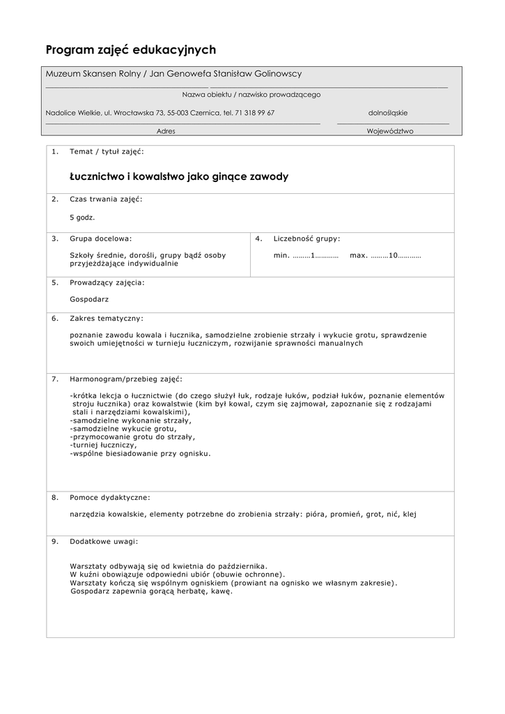 Program zajęć edukacyjnych Muzeum Skansen Rolny / Jan Genowefa Stanisław Golinowscy ________________________________________________ ______________________________________________________________________ Nazwa obiektu / nazwisko prowadzącego Nadolice Wielkie, ul. Wrocławska 73, 55-003 Czernica, tel. 71 318 99 67 _________________________________________________________________________________ Adres 1. dolnośląskie _________________________________ Województwo Temat / tytuł zajęć: Łucznictwo i kowalstwo jako ginące zawody 2. Czas trwania zajęć: 5 godz. 3. Grupa docelowa: Szkoły średnie, dorośli, grupy bądź osoby przyjeżdżające indywidualnie 5. 4. Liczebność grupy: min. ………1………… max. ………10………… Prowadzący zajęcia: Gospodarz 6. Zakres tematyczny: poznanie zawodu kowala i łucznika, samodzielne zrobienie strzały i wykucie grotu, sprawdzenie swoich umiejętności w turnieju łuczniczym, rozwijanie sprawności manualnych 7. Harmonogram/przebieg zajęć: -krótka lekcja o łucznictwie (do czego służył łuk, rodzaje łuków, podział łuków, poznanie elementów stroju łucznika) oraz kowalstwie (kim był kowal, czym się zajmował, zapoznanie się z rodzajami stali i narzędziami kowalskimi), -samodzielne wykonanie strzały, -samodzielne wykucie grotu, -przymocowanie grotu do strzały, -turniej łuczniczy, -wspólne biesiadowanie przy ognisku. 8. Pomoce dydaktyczne: narzędzia kowalskie, elementy potrzebne do zrobienia strzały: pióra, promień, grot, nić, klej 9. Dodatkowe uwagi: Warsztaty odbywają się od kwietnia do października. W kuźni obowiązuje odpowiedni ubiór (obuwie ochronne). Warsztaty kończą się wspólnym ogniskiem (prowiant na ognisko we własnym zakresie) . Gospodarz zapewnia gorącą herbatę, kawę.