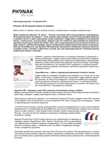 Informacje prasowe– 18 styczeń 2013 Phonak: 40 lat łączenia dzieci ze światem 0LOLRQ\G]LHFL]XE\WNLHPVáXFKXRGQLRVá\NRU]\Ğü]GHG\NRZDQ\FKUR]ZLą]DĔSHGLDWU\F]Q\FK Stäfa, Szwajcaria (Styczeń 18, 2013) – Phonak uruchamia dziś nową kampanię marketingową, 40 lat łączenia dzieci ze światem”. Przez ostatnie cztery dekady, firma Phonak pomagała dzieciom z ubytkiem słuchu w pełni wykorzystać swoje możliwości. Ciągła bliska współpraca z protetykami słuchu, naukowcami, nauczycielami, dziećmi oraz ich rodzinami doprowadziła do stworzenia aparatów słuchowych takich jak Naida i Nios, które poprawiły jakość życia milionów dzieci na całym świecie. Unikalne technologie, których skuteczność została poparta dowodami naukowymi, takie jak SoundRecover czy Dynamic FM zapewniły niezrównane możliwości słyszenia dzieciom w każdym wieku. Trwałość i odporność na wodę, pot i pył zapewniają dziecku swobodę podczas codziennych zabaw i rozrywek. Oddanie i ogromne doświadczenie w audiologii dziecięcej w połączeniu z wiedzą specjalistów z całego świata doprowadziły do stworzenia zwięzłej a zarazem pełnej oferty pediatrycznej o ogromnych możliwościach, która pozwala dzieciom w pełni wykorzystać swój potencjał. Wzorcowe funkcje i technologie takie jak SoundRecover czy Dynamic FM w połączeniu z przyjazną dziecku i trwałą obudową aparatów słuchowych wychodzą naprzeciw codziennym potrzebom dzieci. 6RXQG5HFRYHU±MHGQD]QDMF]ĊĞFLHMWHVWRZDQ\FKIXQNFMLZEUDQĪ\ 40 lat łączenia dzieci ze światem: Broszury, plakaty i krótkie filmy przedstawiające kluczowe korzyści jakie zapewniają rozwiązania pediatryczne firmy Phonak. Ciągły dostęp do wszystkich dźwięków jest niezbędny do rozwoju mowy oraz języka. Liczne testy i badania kliniczne, wykonane w ciągu ostatnich siedmiu lat wykazały, że dzieci korzystających z funkcji SoundRecover występuje znaczna poprawa mówienia i rozpoznawania mowy. Ta unikatowa funkcja firmy Phonak pozwala im nie tylko lepiej słyszeć i rozumieć, ale także uczyć się i komunikować z otaczającym je światem. Dynamic FM –]QDF]ąFDQDZHWSRSUDZD]UR]XPLDáRĞFLPRZ\ZKDáDVLH Będący własnością firmy Phonak, wiodący w branży system Dynamic FM pomaga sprostać wyzwaniom, jakie hałas, odległość i pogłos stwarzają dla dzieci z ubytkiem słuchu. Wiele recenzji naukowych wykazało, że z systemem Dynamic FM dzieci osiągały nawet 50% poprawę zrozumiałości mowy w porównaniu z innymi systemami FM. Dzieci niczego już nie przegapią – nawet w najtrudniejszych warunkach słyszenia. „W firmie Phonak wszyscy zawsze wykazywaliśmy ogromne zaangażowanie w pracy nad produktami pediatrycznymi. Innowacje takie jak SoundRecover czy Dynamic FM dosłownie zmieniły życie milionów dzieci na całym świecie”, mówi Angela Pelosi, Dyrektor działu Pediatrycznego w firmie Phonak. „Te wyniki to dla nas najlepsza motywacja do dalszego udoskonalania produktów i obsługi.” Aparaty Phonak Nios S H2O zostały stworzone do niedosłuchów od lekkiego do ciężkiego; Naida S SuperPower (SP) i Naida S UltraPower (UP) są odpowiednie do niedosłuchów od średnio-ciężkiego do głębokiego. Te trzy modele pozwalają dzieciom w każdym wieku, z ubytkami słuchu od lekkich do głębokich rozwijać mowę i umiejętności językowe. Trwałe obudowy i wodoodporność: Phonak to doskonały wybór dla dzieci Wszystkie pediatryczne aparaty słuchowe firmy Phonak oraz systemy FM zaprojektowano z myślą o odczuwanym przez dziecko pragnieniu zabawy i eksploracji. Urządzenie te są trwałe, odporne na wodę, pot i brud dzięki czemu zapewniają dzieciom maksimum elastyczności dostosowania i znakomitą jakość słyszenia. O firmie Phonak Firma Phonak, członek Sonova Group z główną siedzibą blisko Zurychu w Szwajcarii, od ponad 60 lat specjalizuje się w projektowaniu, produkcji i ogólnoświatowej dystrybucji zaawansowanych technologicznie aparatów słuchowych i urządzeń bezprzewodowych. Dzięki połączeniu fachowości w dziedzinie technologii słuchowej i ścisłej współpracy z protetykami słuchu, Phonak może zapewnić poprawę jakości życia osobom niedosłyszącym oraz ich bliskim. Grupa Phonak może zaproponować pełny wybór cyfrowych aparatów słuchowych oraz uzupełniających je bezprzewodowych systemów. Działający na całym świecie Phonak wprowadza innowacje i ustanawia nowe standardy w branży w zakresie miniaturyzacji i wydajności produktów. :LĊFHMLQIRUPDFMLQDVWURQLHZZZSKRQDNSOOXEEH]SRĞUHGQLR Kathy Bühler Product Communications Phonak AG Tel: +41 58 928 01 01 Email: [email protected] Phonak – Life is on Jesteśmy wrażliwi na potrzeby tych, którzy zdają się na naszą wiedzę, pomysły i troskę. A dzięki twórczemu pokonywaniu wyzwań technologii wprowadzamy innowacje, które pomagają ludziom słyszeć, rozumieć oraz doświadczać całego bogactwa dźwięków, w które obfituje życie. Współdziałaj swobodnie. Porozumiewaj się pewnie. Żyj bez ograniczeń. Life is on.