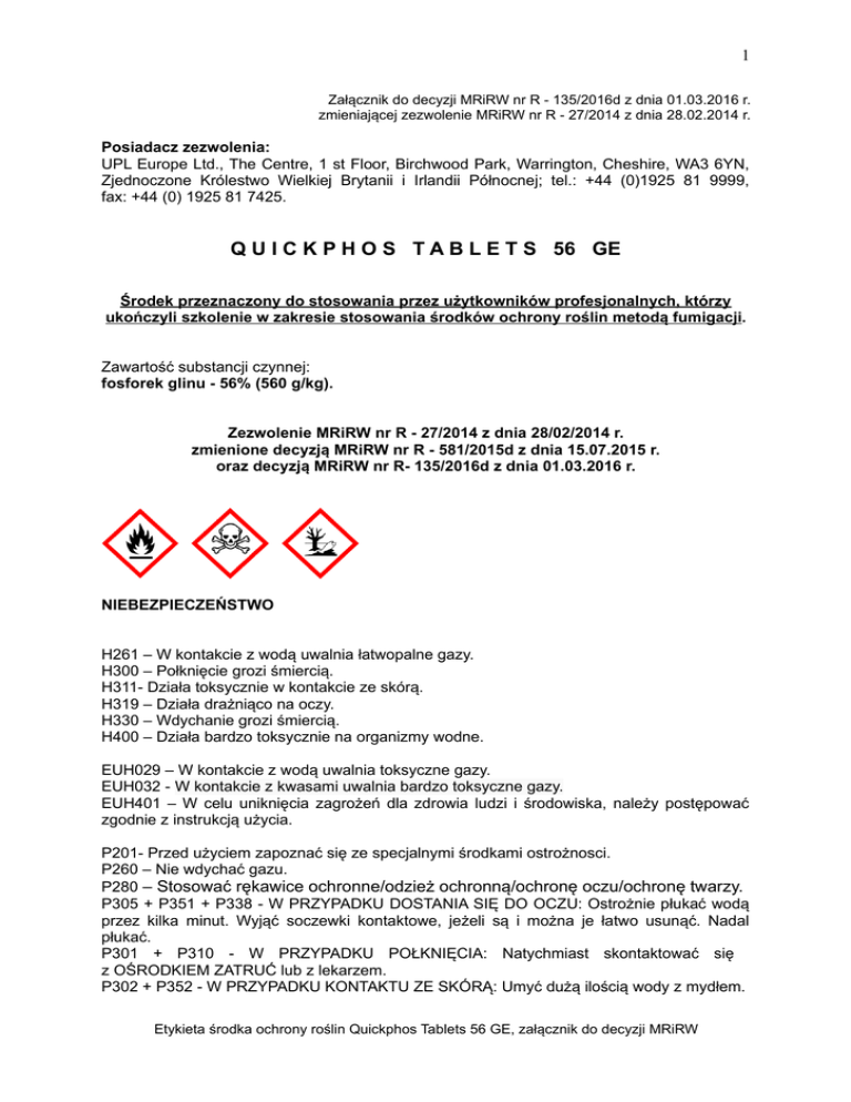 Etykieta środka ochrony roślin Quickphos Tablets 56 GE, załącznik do decyzji MRiRW